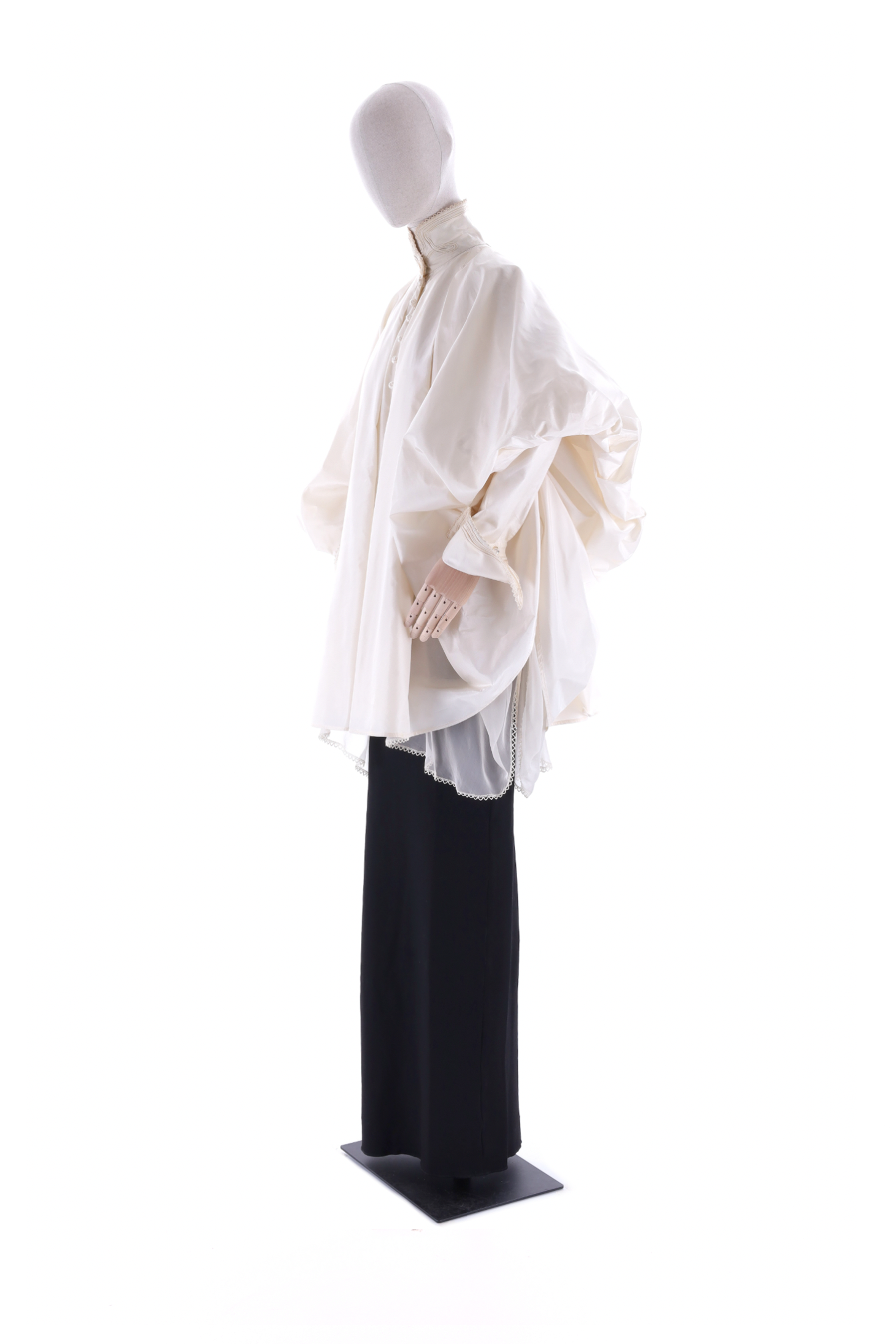 “D'Artista” shirt. Two-layer taffeta shirt with front opening, organza lining. Three-piece circular cut, with two box pleats on the front and back. Gathered sleeves with six shape-defining pleats at armfolds, exquisitely long and narrow twin-button cuffs with mechanical embroidery edging. An intermediate straight cut taffeta layer for major structural support. Lace trim on collar, cuffs, and organza lining. This design enfolds specific features of late-19th-century fashion. In particular, the close-fitting collar and cuffs, along with the lovely decorative elements, evoke women’s dresses from that period, while the rich volumes of the sleeves spark images of jackets from the 1890s.