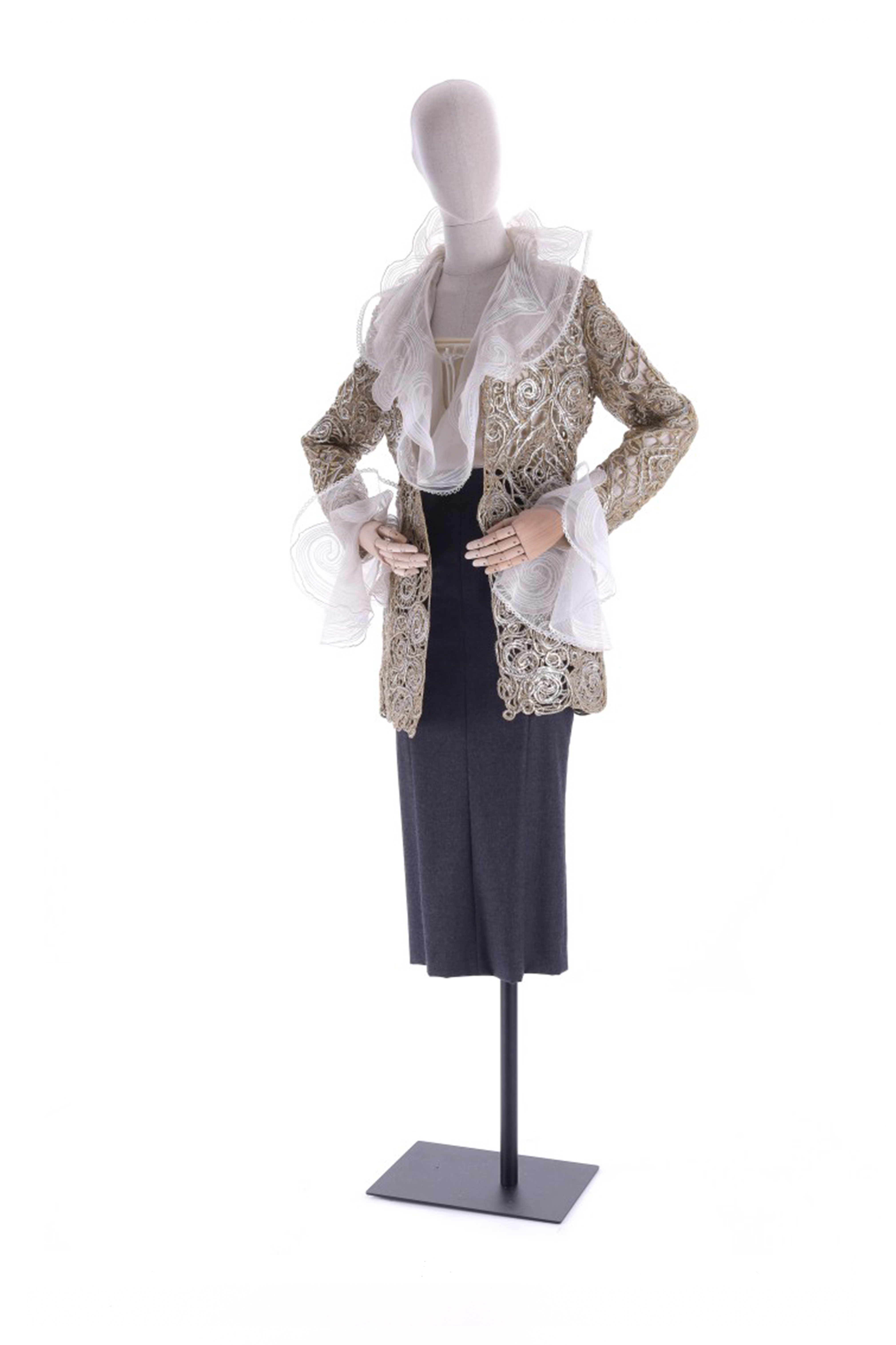 Jacket with a fitted silhouette, long sleeves, and no fastening, fully embroidered with cotton and lurex cords in alternating scroll and spiral motifs of various sizes, executed on a thermobonded gauze base, eliminated with a heat press. Gold and silver film plating is applied both on the exterior and interior. The embroidery is designed so that each section aligns perfectly and can be assembled seamlessly. Double flared cuffs: one in silk organza embroidered with scrolls outlining the shape, the other in nylon tulle with delicate cotton picot lace trim - both applied to the inside of the sleeve hem.