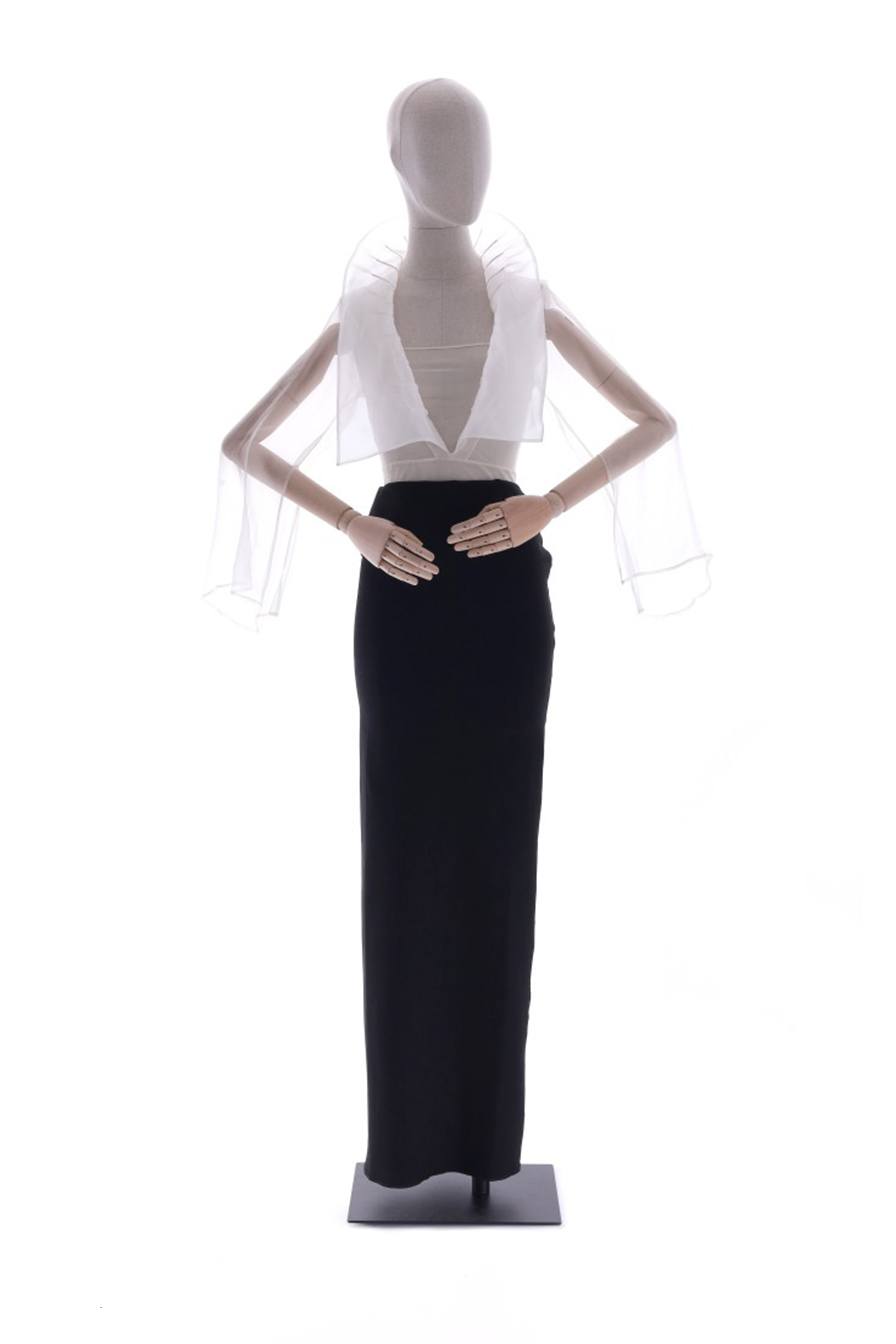 “Libellula” shirt. Bodysuit shirt with a left-side zip opening, in sheer white stretch tulle, featuring a low, flat band neckline and cuffless, radical-construction funnel sleeves with an inside opening from armfolds all the way to the end. Shawl collar down to waist with twenty-one handsewn darts at one, creating a horizontal rib effect and making lifting/turning the collar wonderfully easy. Lightness, simplicity, and transparency are the key concepts behind this design. Nevertheless, in the details, the sense of lightness comes alive very much: the fluid sleeves with slits for the arms have the beauty and delicacy of fluttering dragonfly wings, while the richly ribbed collar stands up in the 16th-century Florentine Medici style.