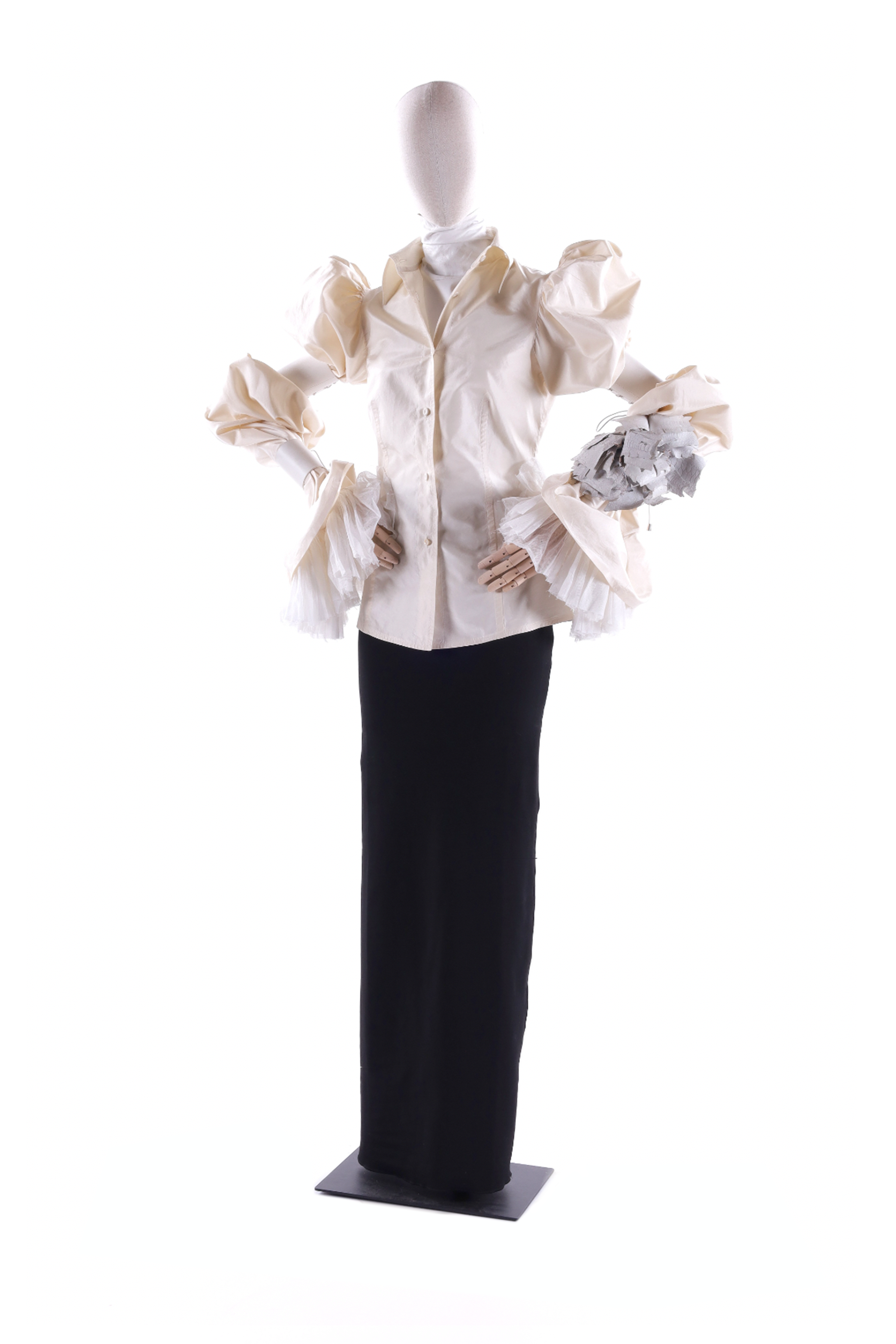 “Orlando” shirt. Mannish shirt with front opening, deep figure-flattering tucks front and back. Fabric-covered button closure. High tab collar. Leg of mutton sleeves with gathering in the upper part, snug white leather bracelets above the elbow, and at the forearm for accent. A pleated/gathered white tulle French cuff with double lace edging is applied on the inside of the sleeve bottom (15 cm or so from the wrist). A bracelet of ever-smaller, soft, white leather bows adorns the right sleeve. The outstanding feature of this design is the original construction of the sleeves, which adopts an elegant and contemporary styling language. While the shape and volume of the shoulders draw inspiration from late 19th-century women’s fashion, the lavish cuff adds an extra flourish, very much in the 18th-century mode. Nicely offsetting the historical references are the technical white leather bracelets that regulate the length of sleeves. Here, too, the simple, moderate mannequin cut of the shirt heightens, though artful contrast, the regal impact of the latter.