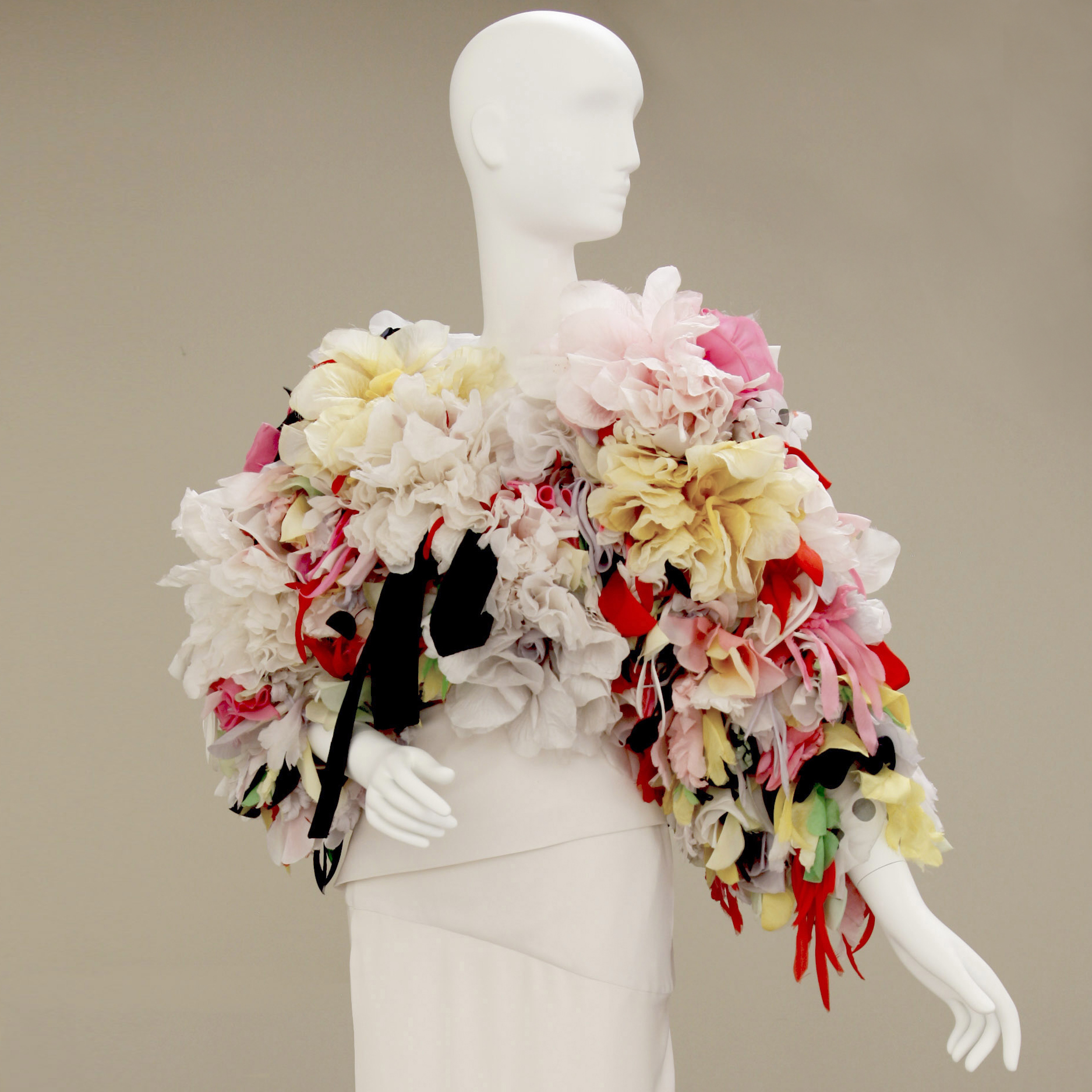 In the first part of the exhibition, Baroque Lyon silks intertwine flowers with architectural elements; airy taffetas are decorated with garlands of roses or berries; and furnishing cottons from the second half of the nineteenth century feature highly realistic floral triumphs. The second part of the exhibition is devoted to twentieth-century textiles, a period that marks the development of the Como silk mills, suppliers to haute couture and to Italian and French prêt-à-porter. Alongside the textiles are garments connected to the theme; for the twentieth century section, these are selected to represent Italian Alta Moda – from Biki to Capucci, Ferré and Valentino – Parisian Haute Couture with Dior and Yves Saint Laurent, and international prêt-à-porter with Ken Scott and Leonard.