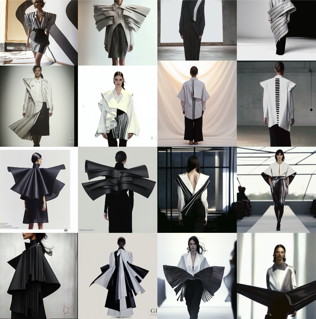 The project starts from a single archival object, the Striped Jacket from the Ready-to-wear Fall/Winter 1985 collection, from which students develop a capsule collection composed of three outfits. Archival photographs, original drawings, paper patterns, and Gianfranco Ferré’s design language derived from the transcription of his lectures become inputs for generative AI tools such as MidJourney, ChatGPT, and The New Black, enabling the definition of a new process of co-creation between designer and artificial intelligence. The objective is to investigate how human and artificial creativity can interact, expanding design autonomy and opening up new opportunities and challenges for emerging designers.