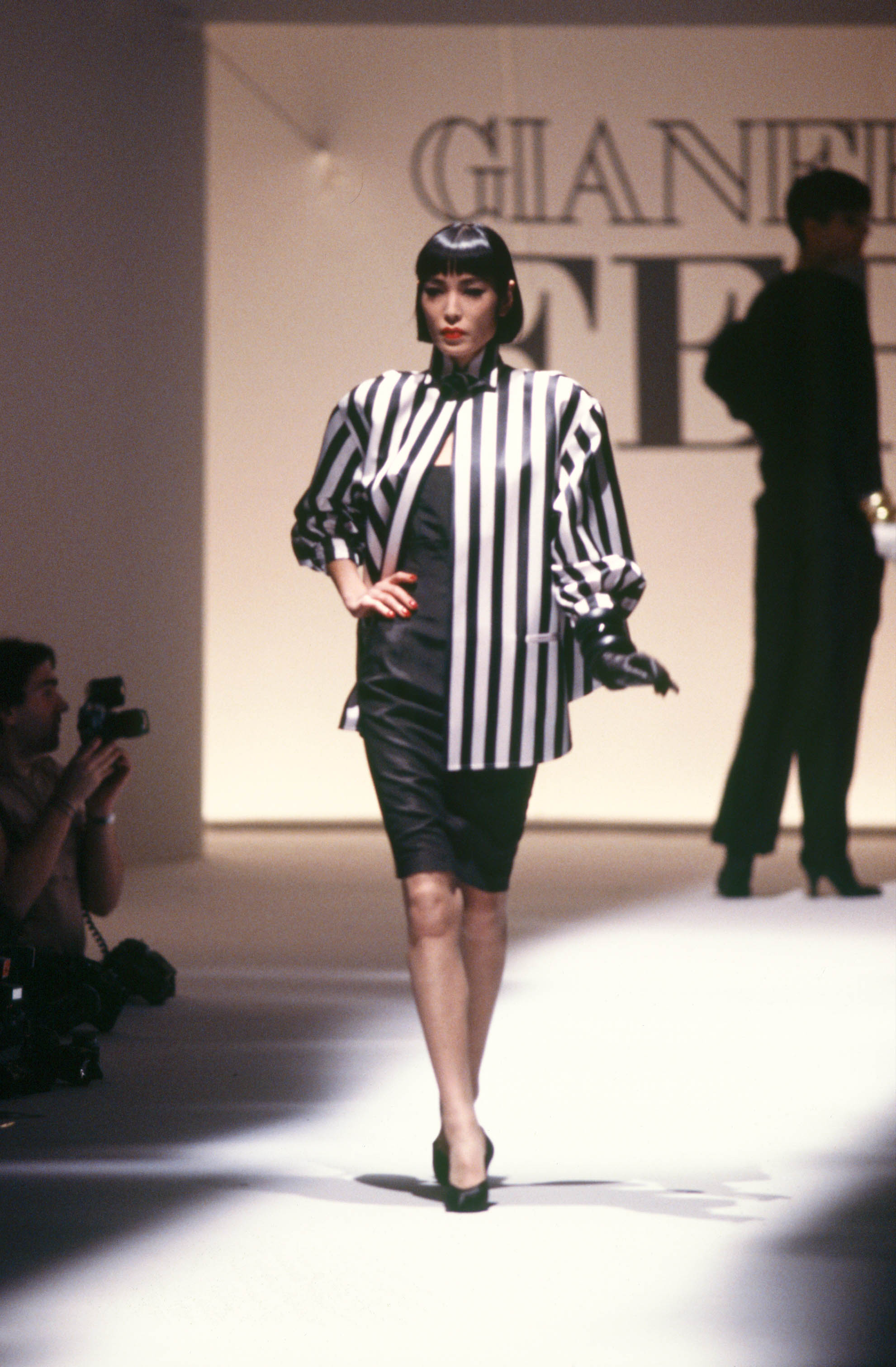 Il modello richiama l’alta moda degli anni Cinquanta: il tubino aderente e scollato riprende le prime creazioni di Dior, aggiornandone la lunghezza e il bustier. La giacca, invece, rielabora il tema delle ampiezze sul dorso tipico di Balenciaga e Balmain, ispirato alla robe à la française settecentesca con le sue pieghe che si aprono dalla nuca all’orlo. Gianfranco Ferré ne offre una versione originale in stile anni ’80, ottenuta trasformando il modello di una camicia maschile, per esprimere un femminile che rielabora i codici dell’abbigliamento maschile creando un nuovo immaginario di eleganza e seduzione.