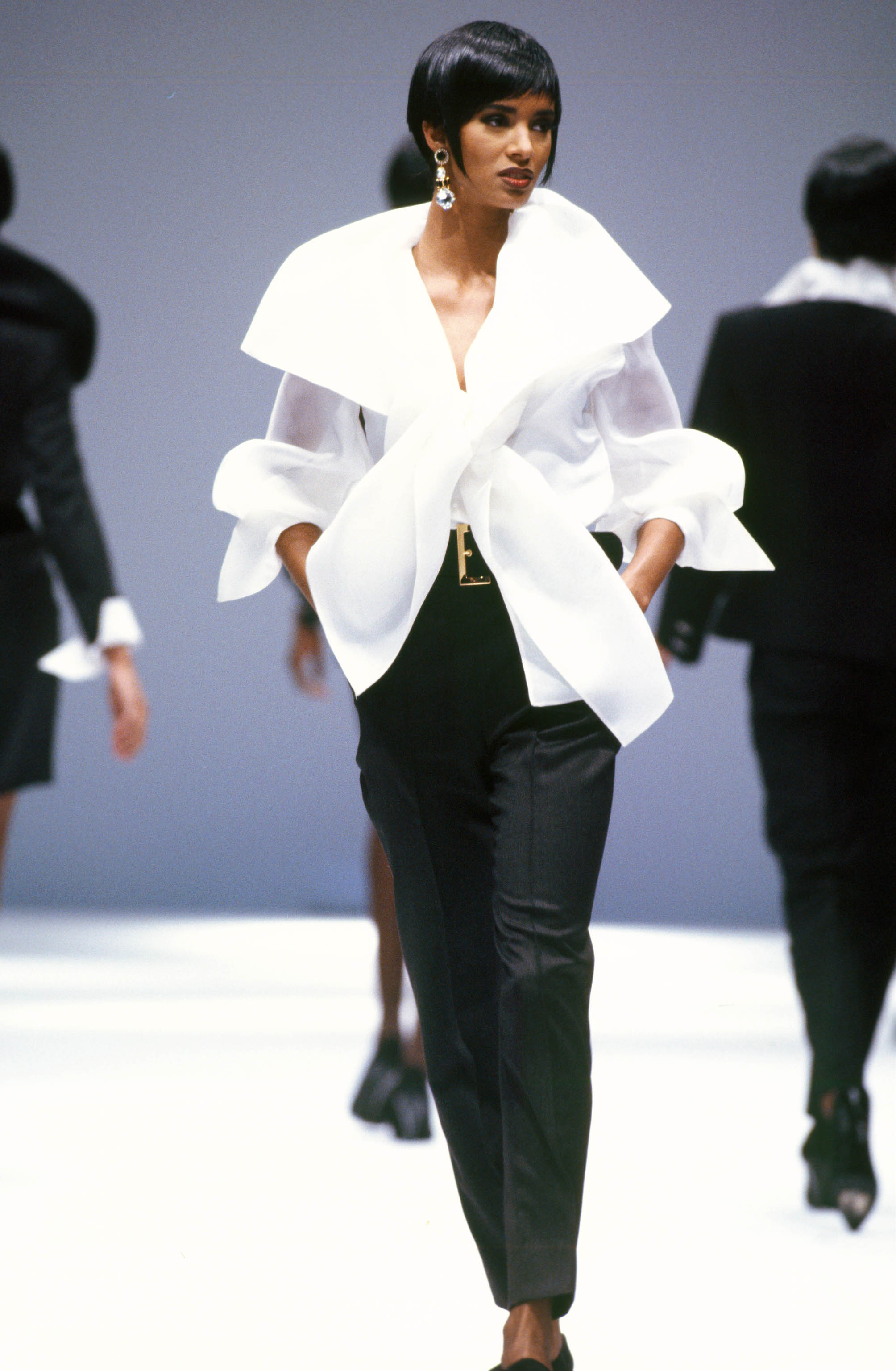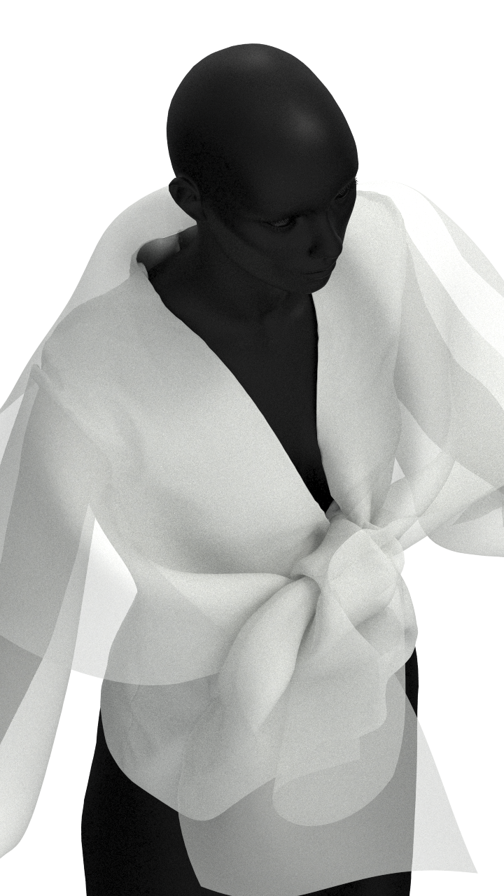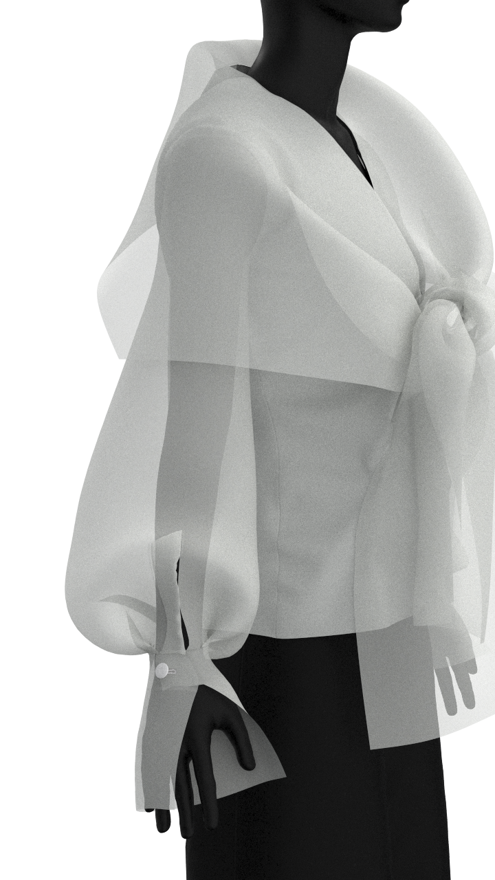 Camicia “Cravat”. Camicia aperta sul davanti con scollatura a V. Il corpo della camicia è in crêpe de chine doppio, con taglio leggermente affondato dal sotto del giromanica fino al punto vita. Manica blusante in organza, con taglio a giro, trattenuta da un alto cinturino con chiusura a gemello. Il polsino è alto e con punte scappate. Il collo ampio, a bavero, è tagliato nella geometria di un rettangolo e asseconda sul davanti la scollatura a V. L’ampiezza del bavero si distende sulle spalle e si richiude al centro della camicia con i due lembi annodati che originano cocche giganti. Nel progetto di questa camicia confluiscono riferimenti storici ad alcuni capi del guardaroba femminile e maschile del tardo Settecento. Il bavero dilatato sulle spalle evoca l’uso del fichu a coprire le generose scollature della robe à la polonaise mentre l’annodatura dei lembi rimanda all’enfasi della cravat maschile dello stesso periodo. Anche in questo caso i due guardaroba si contaminano in un’immagine unitaria armonica e sontuosa allo stesso tempo, dove i dettagli diventano la chiave di lettura del capo.