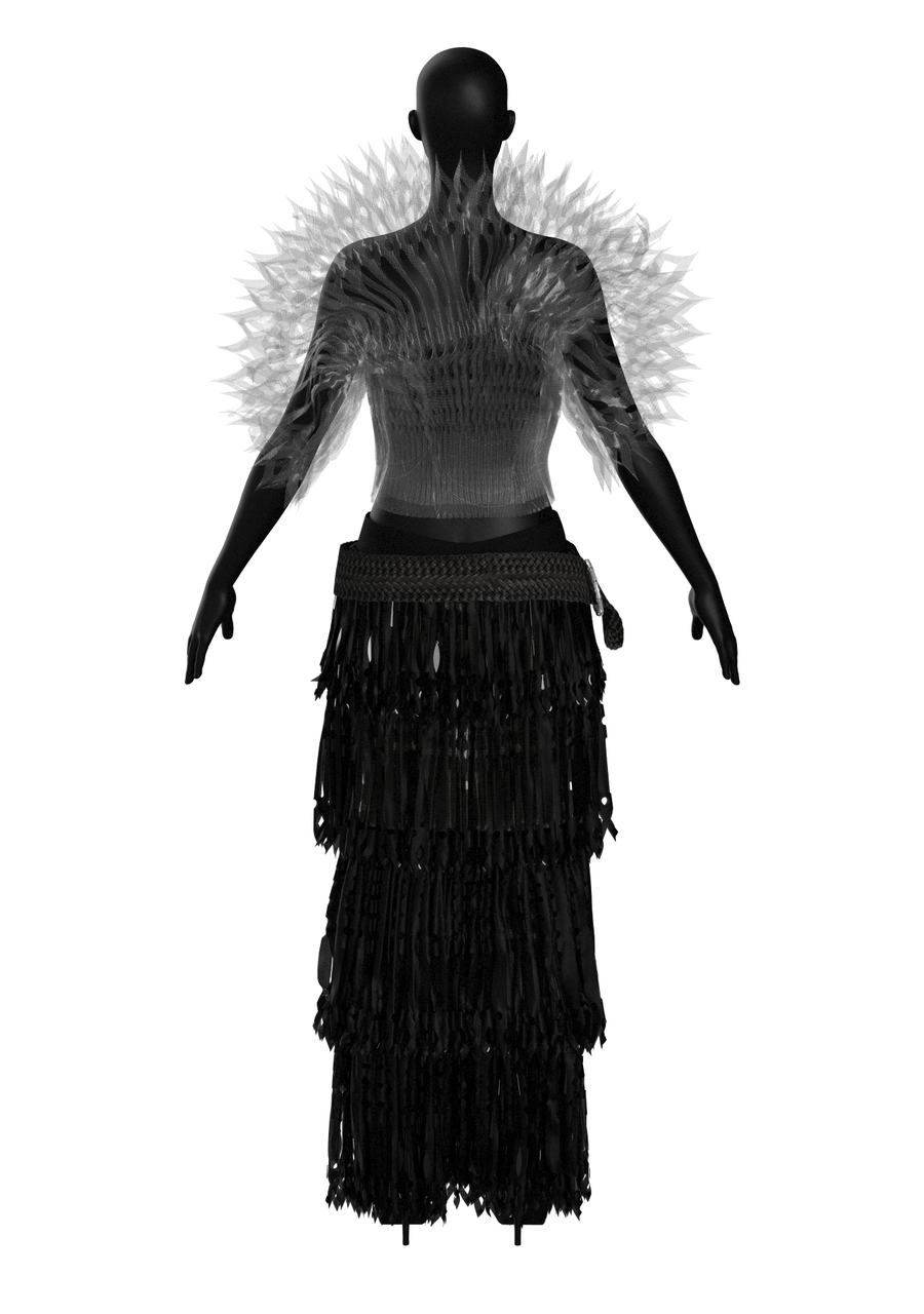 Camicia “Origami”. Camicia blusa con aperture in alto e in basso. Il capo è realizzato doppiando due teli tubolari di tulle di nylon. I volumi sono ottenuti attraverso la lavorazione del tessuto: plissettatura e taglio al laser. L’orlo superiore presenta un bordo lavorato mentre quello inferiore è lineare. I due teli, al punto vita, sono uniti da punti rarefatti di filo di nylon. L’apertura per il passaggio della testa è delimitata da brevi cuciture in filo di nylon. Una volta indossato il capo, si apre a soffietto e permette l’individuazione del punto manica. Due piccoli passanti collocati all’interno del davanti e del dietro, intrecciandosi e unendosi tramite bottoni a pressione trasparenti, rendono possibile e stabile il passaggio delle braccia. La decorazione del tulle è ottenuta attraverso il taglio al laser: motivi a rombi e a cerchi si susseguono verso l’alto, aumentando in ampiezza. La profilatura superiore è caratterizzata da punte allungate. La ricerca scultorea dei volumi è resa possibile attraverso la scelta del materiale e delle lavorazioni. La trasparenza del tulle e l’effetto a giorno dell’intaglio fanno assumere al capo un’immagine leggiadra ed eterea. La rigidità del tulle plissettato interpreta, invece, il valore strutturale. Il canone della camicia, privato di tutti gli elementi tradizionali, affida solo al collo la possibilità comunicativa dell’intero, presentato nella forma di una “macrogorgiera”. Sperimentazione tecnica e ricerca artistica sono alla base dello sviluppo progettuale del capo.