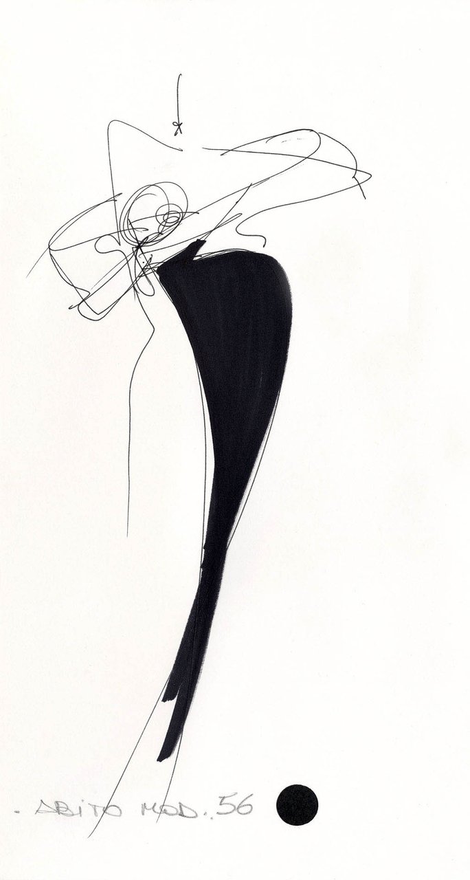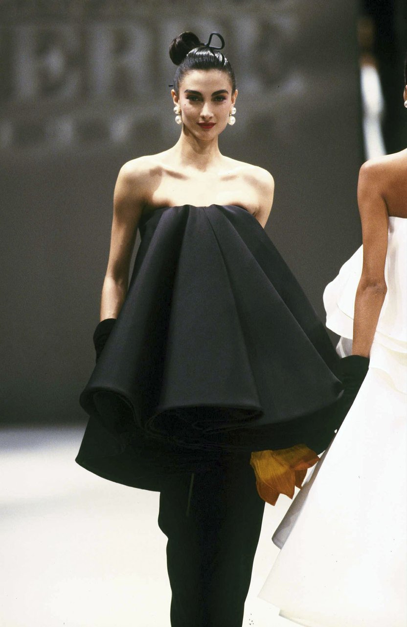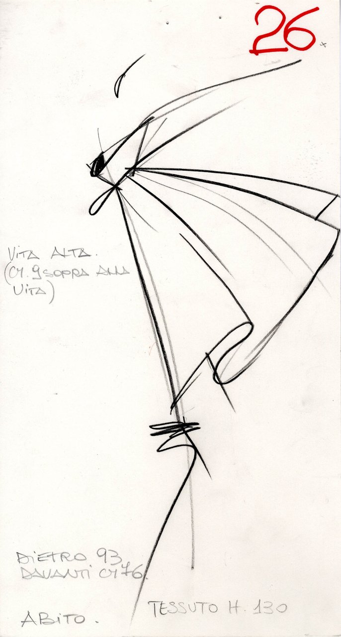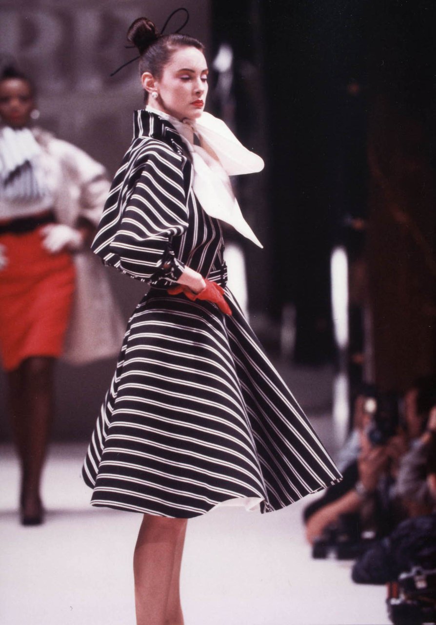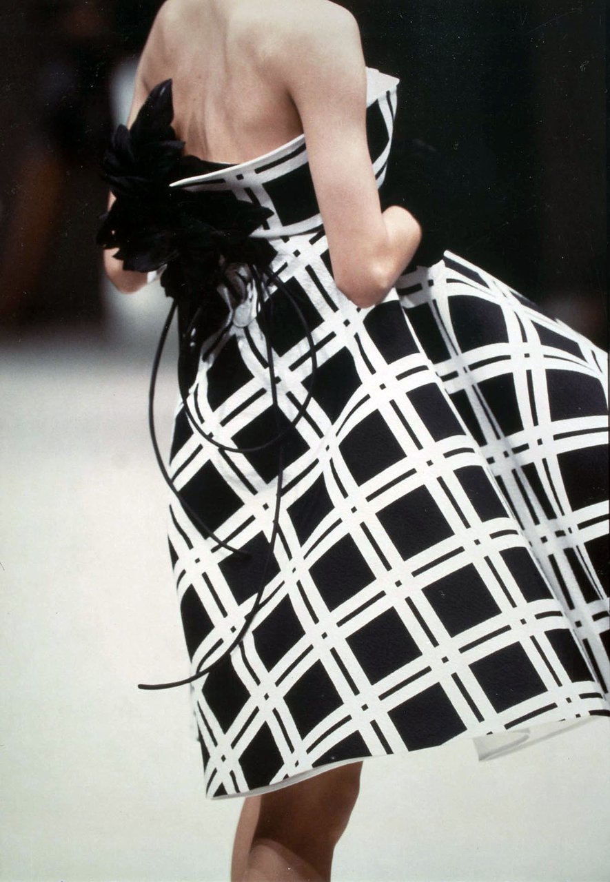 Parlando della forma, della linea, del movimento... c’è un senso di lievità, come se soffiasse una brezza tiepida e ogni tanto un mulinello d'aria vincesse la forza di gravità. Così le gonne si proiettano avanti oppure fanno perno su grandi volant e sulla vita segnata. Ma ricorre anche la silhouette stilizzata di ispirazione maschile: giacca da uomo importante con spacchi sul dorso, però di raso a righe bianche e nere e dal colletto alto a camicia.