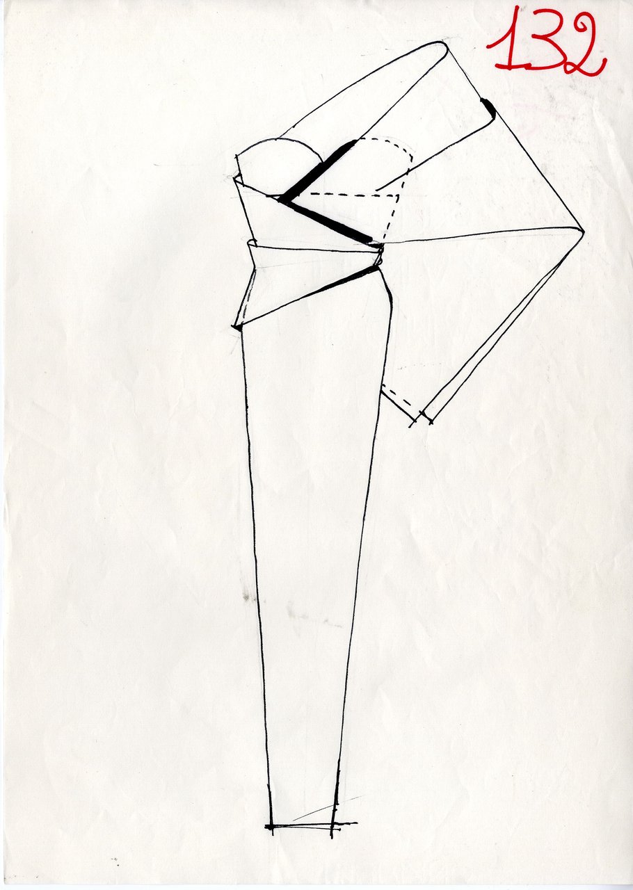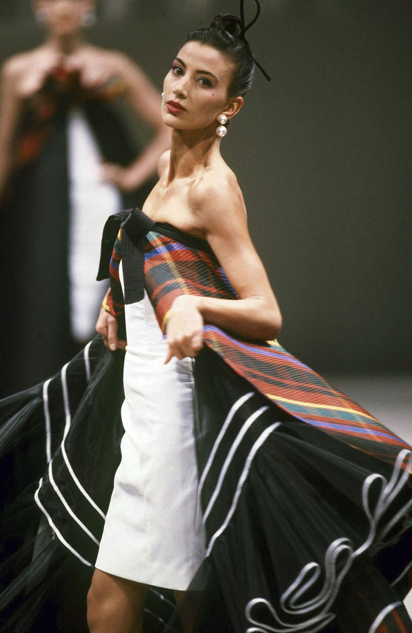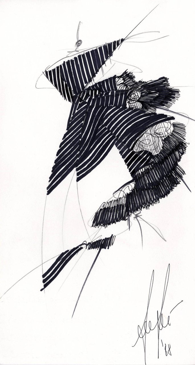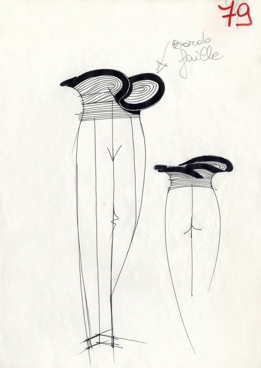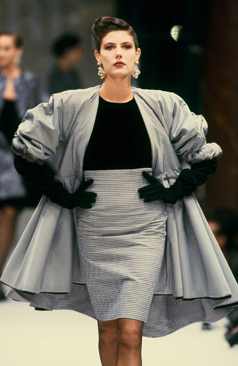 Parlando della forma, della linea, del movimento... c’è un senso di lievità, come se soffiasse una brezza tiepida e ogni tanto un mulinello d'aria vincesse la forza di gravità. Così le gonne si proiettano avanti oppure fanno perno su grandi volant e sulla vita segnata. Ma ricorre anche la silhouette stilizzata di ispirazione maschile: giacca da uomo importante con spacchi sul dorso, però di raso a righe bianche e nere e dal colletto alto a camicia.