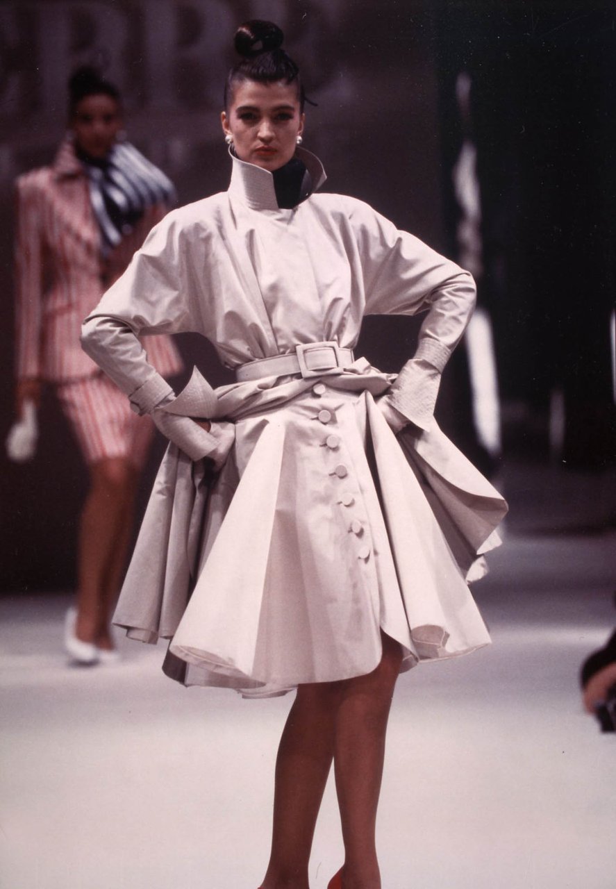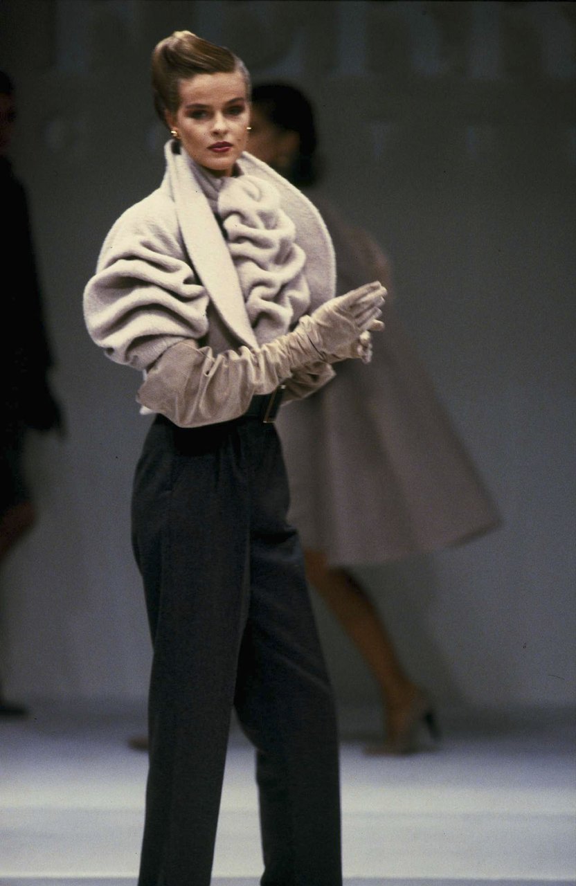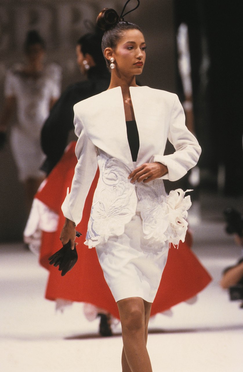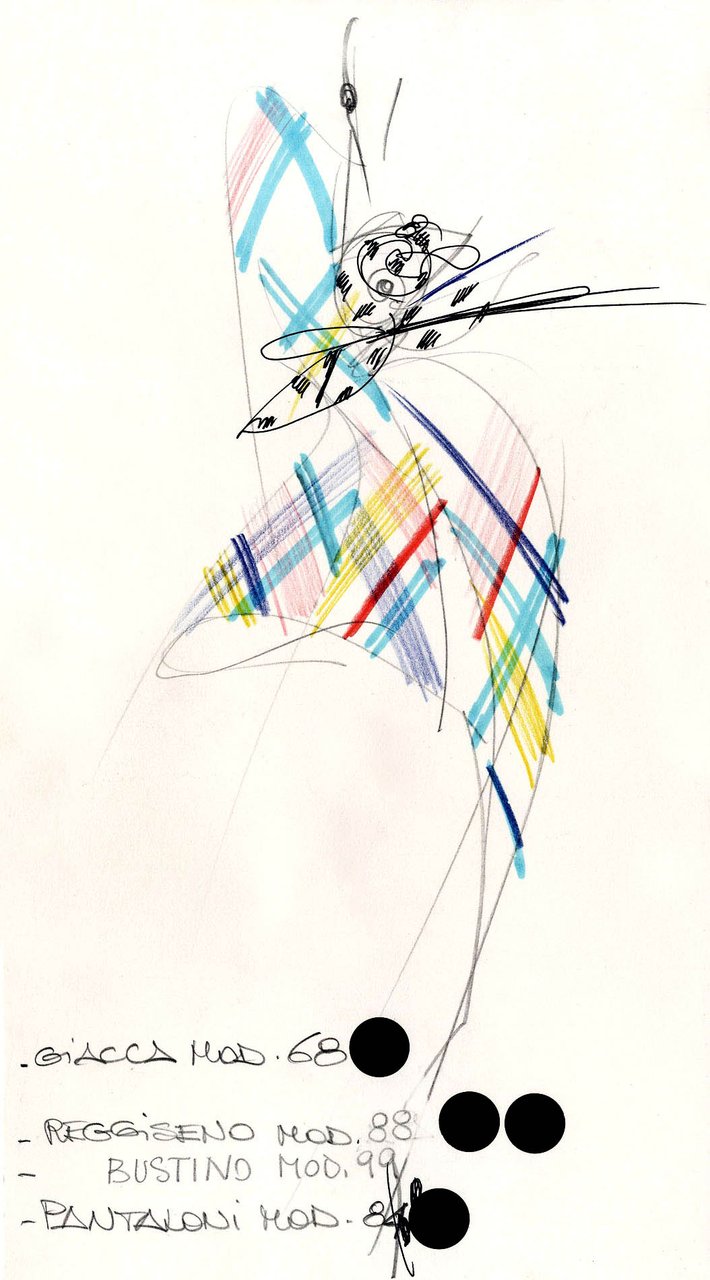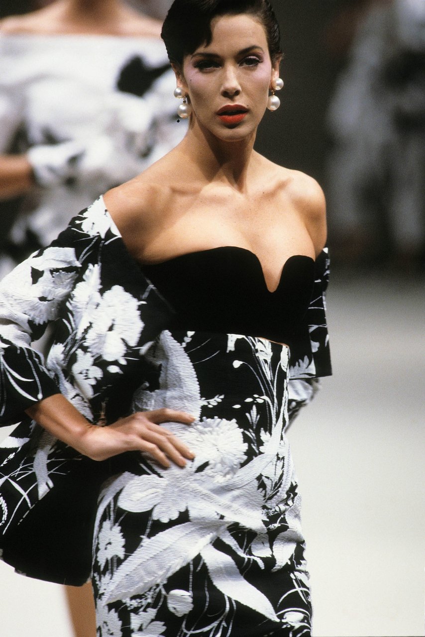 Parlando della forma, della linea, del movimento... c’è un senso di lievità, come se soffiasse una brezza tiepida e ogni tanto un mulinello d'aria vincesse la forza di gravità. Così le gonne si proiettano avanti oppure fanno perno su grandi volant e sulla vita segnata. Ma ricorre anche la silhouette stilizzata di ispirazione maschile: giacca da uomo importante con spacchi sul dorso, però di raso a righe bianche e nere e dal colletto alto a camicia.