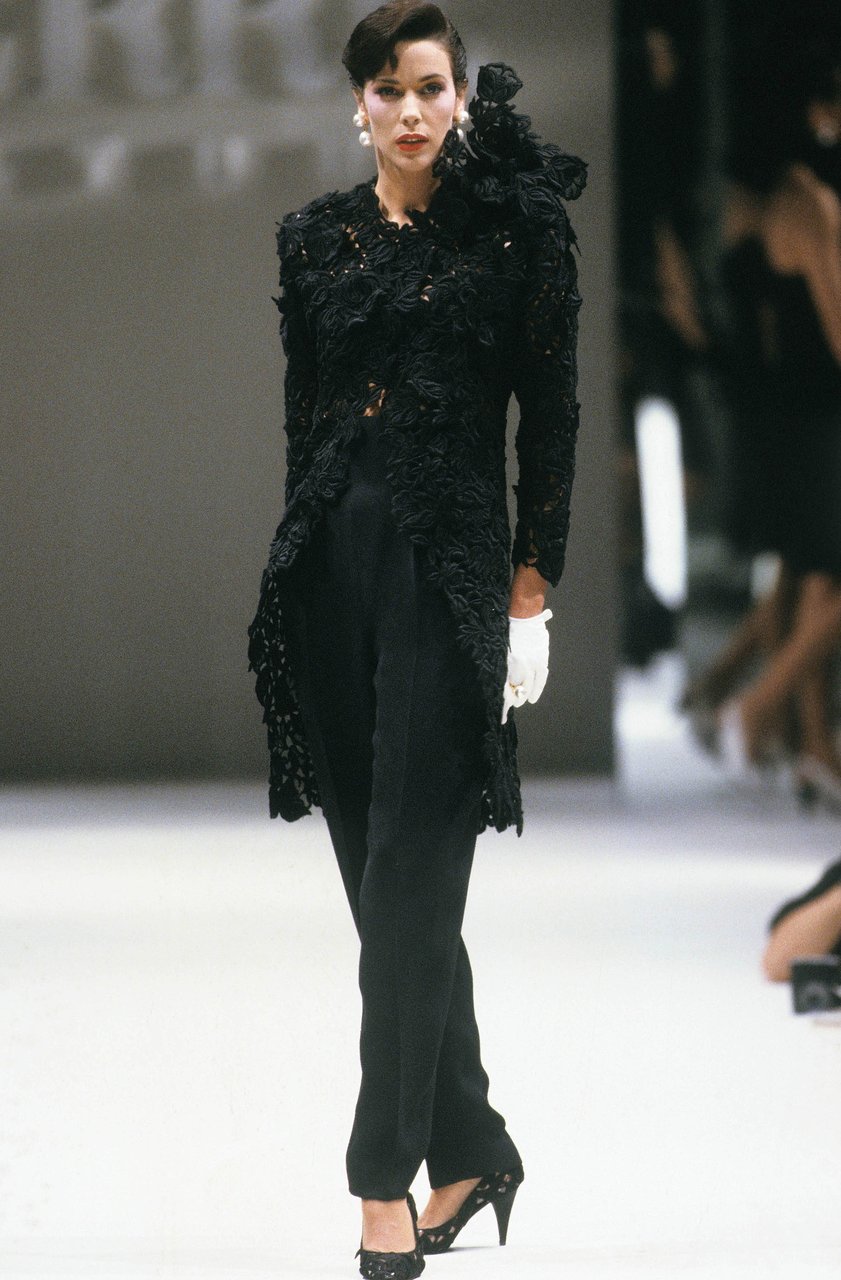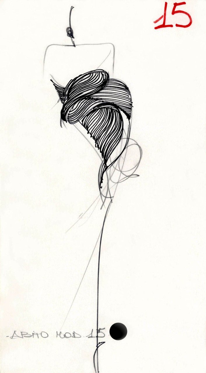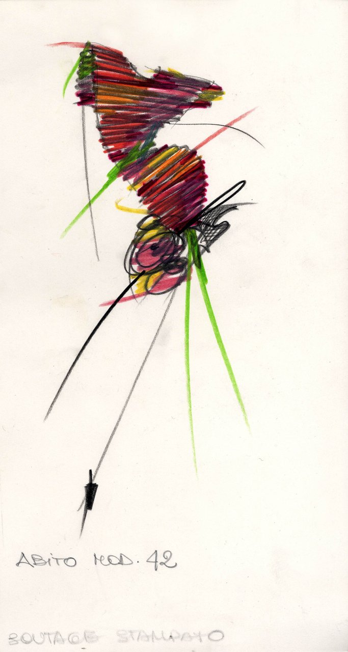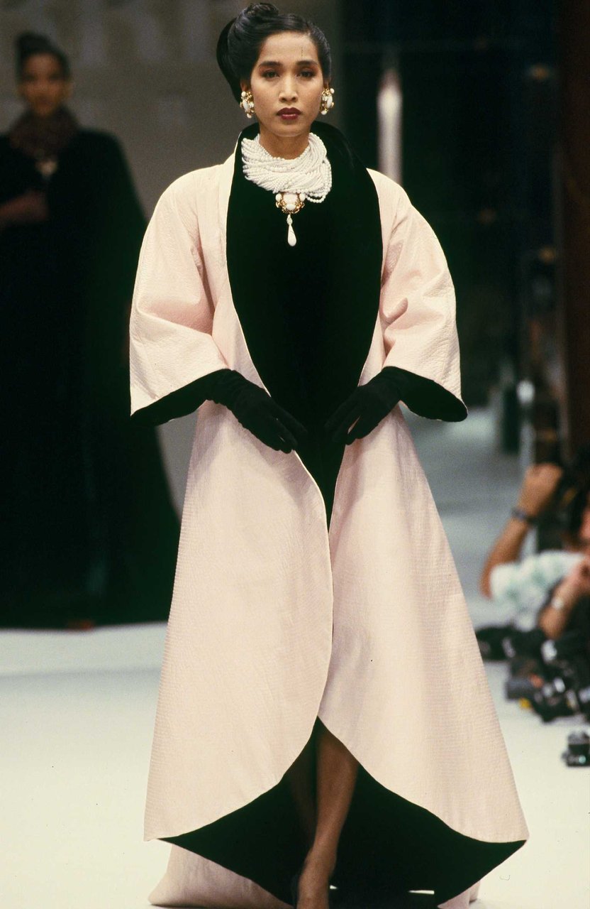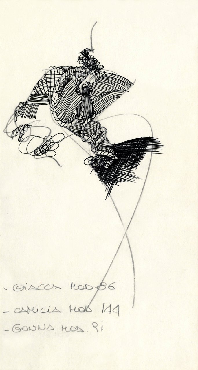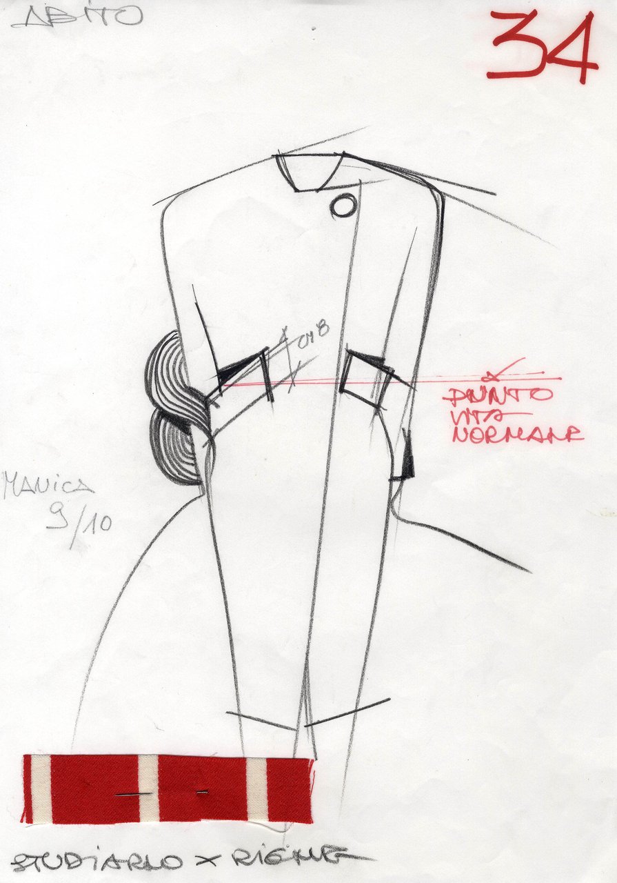 Parlando della forma, della linea, del movimento... c’è un senso di lievità, come se soffiasse una brezza tiepida e ogni tanto un mulinello d'aria vincesse la forza di gravità. Così le gonne si proiettano avanti oppure fanno perno su grandi volant e sulla vita segnata. Ma ricorre anche la silhouette stilizzata di ispirazione maschile: giacca da uomo importante con spacchi sul dorso, però di raso a righe bianche e nere e dal colletto alto a camicia.