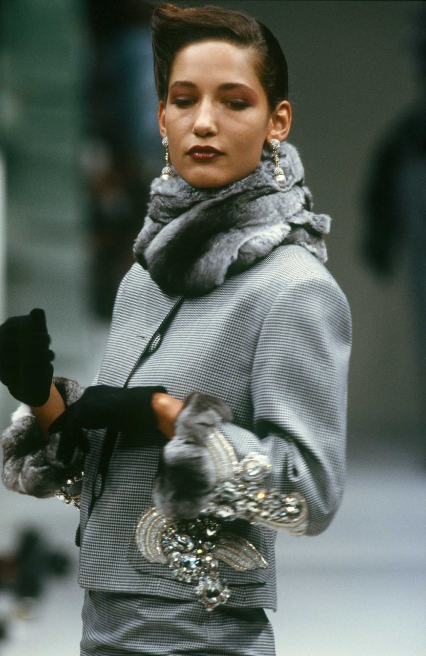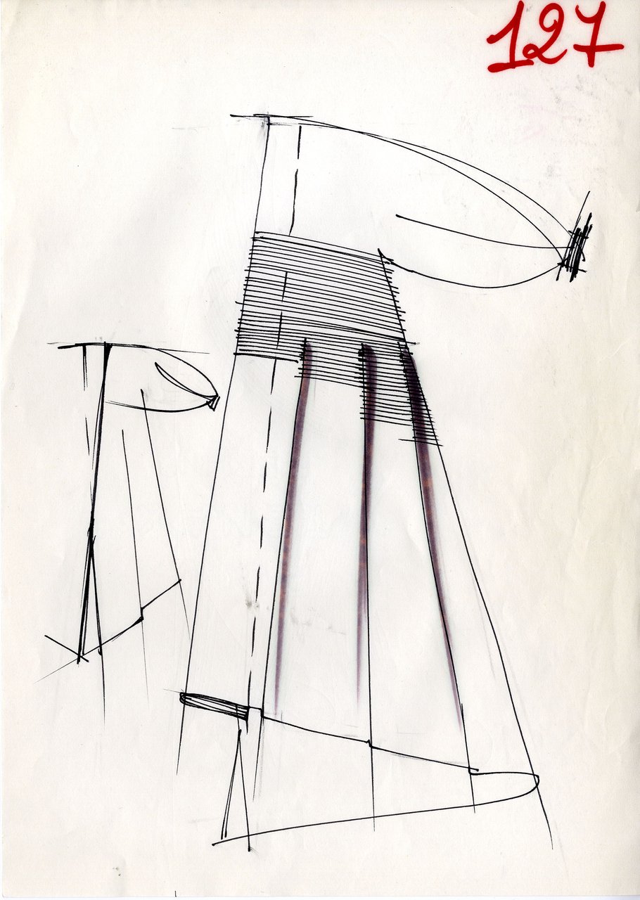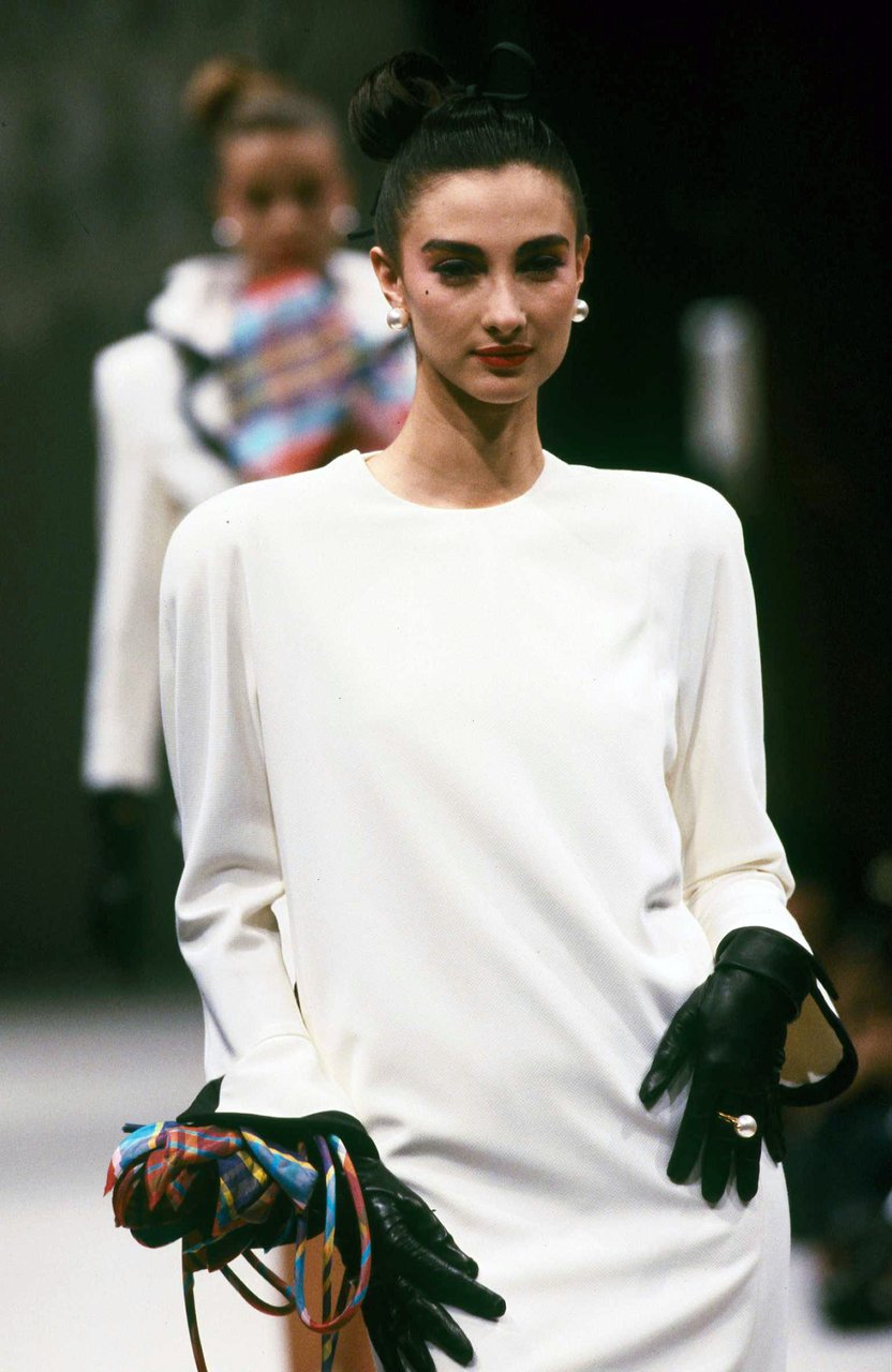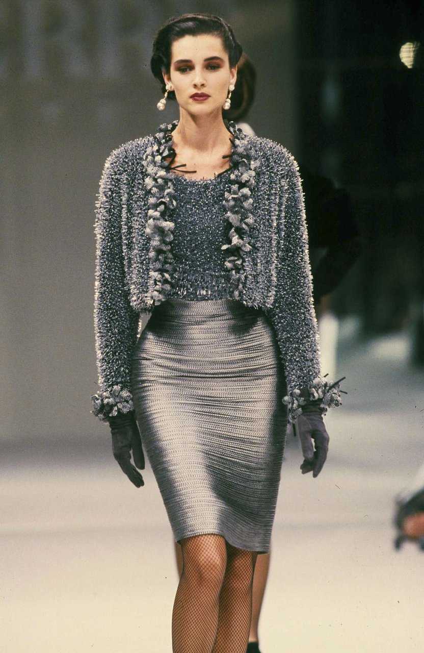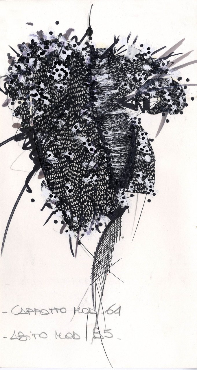 Parlando della forma, della linea, del movimento... c’è un senso di lievità, come se soffiasse una brezza tiepida e ogni tanto un mulinello d'aria vincesse la forza di gravità. Così le gonne si proiettano avanti oppure fanno perno su grandi volant e sulla vita segnata. Ma ricorre anche la silhouette stilizzata di ispirazione maschile: giacca da uomo importante con spacchi sul dorso, però di raso a righe bianche e nere e dal colletto alto a camicia.