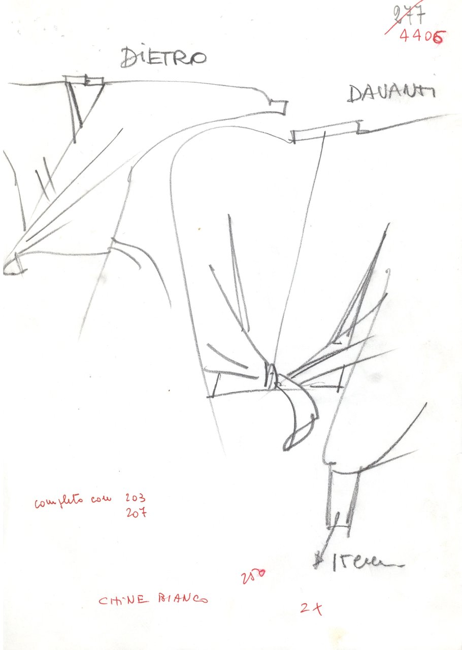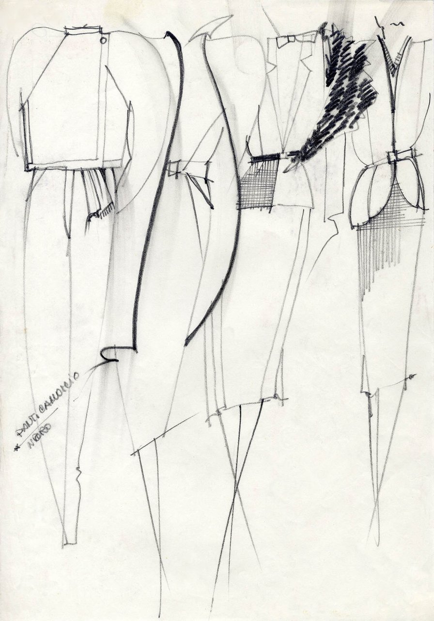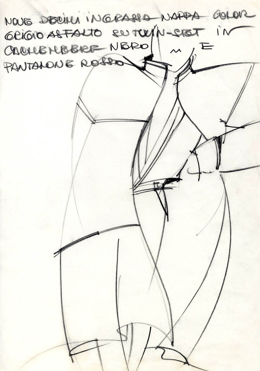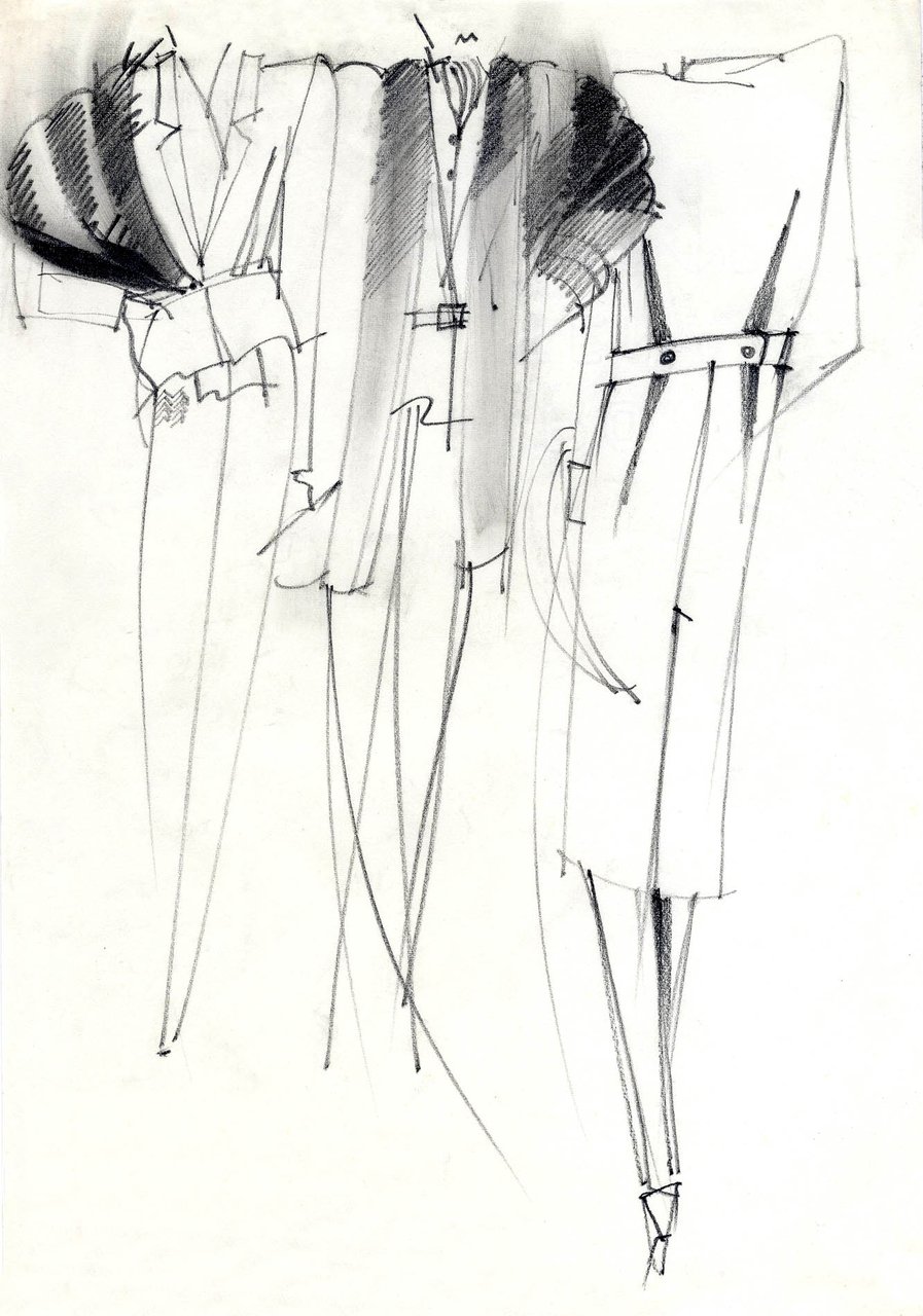 Le linee: la figura è lineare, allungata; le spalle sono importanti e costruite; le maniche, di diversa dimensione in base alla funzione del capo, sempre molto morbide; i colli sono minimi, spesso inesistenti; sciolto e assai duttile il punto-vita. Effetti di morbidezza, sempre portata sul davanti: pinces esterne con impunture triangolari che formano pieghe morenti, tagli in vita più alti dietro e sottolineati sul davanti da arricciature, o tecniche di lavorazione del tricot che permettono di aumentare o gonfiare i volumi, soluzioni di rimborsi centrali favoriti dalla duttilità della suede e del daino.