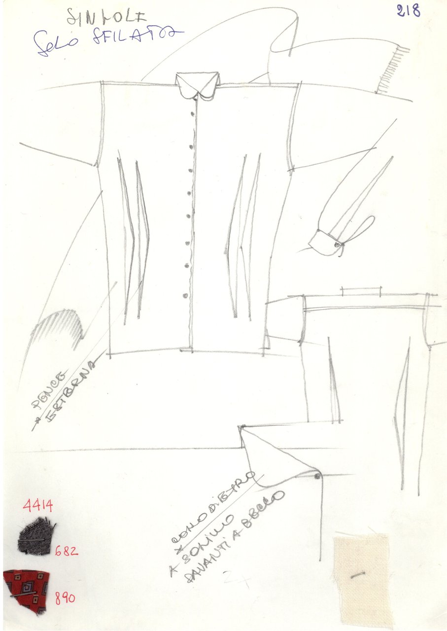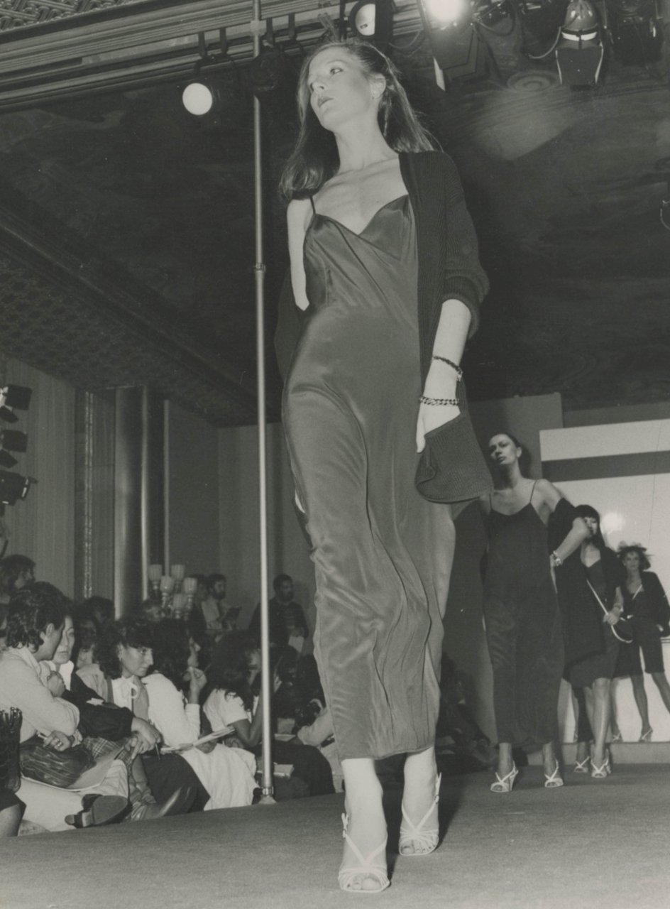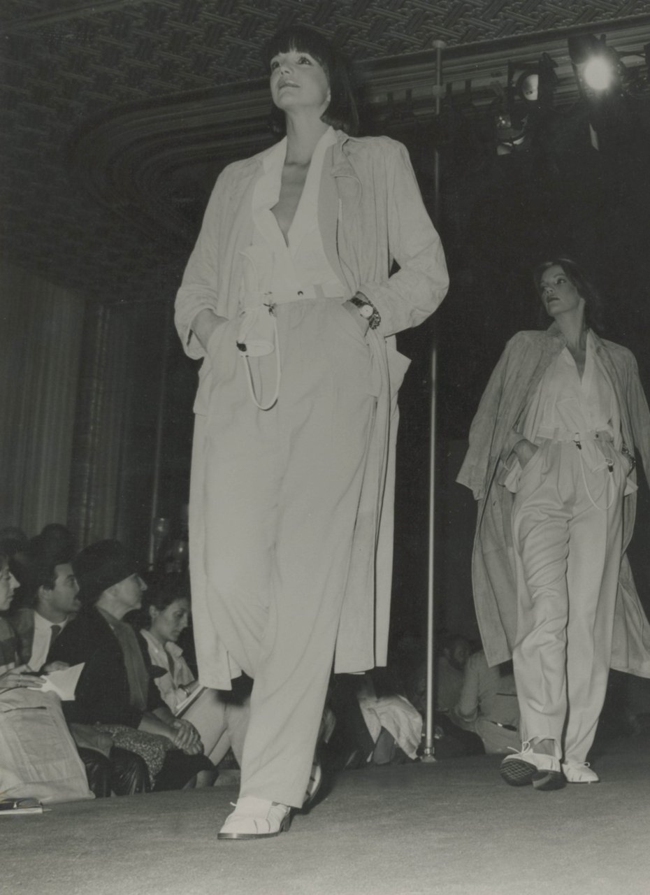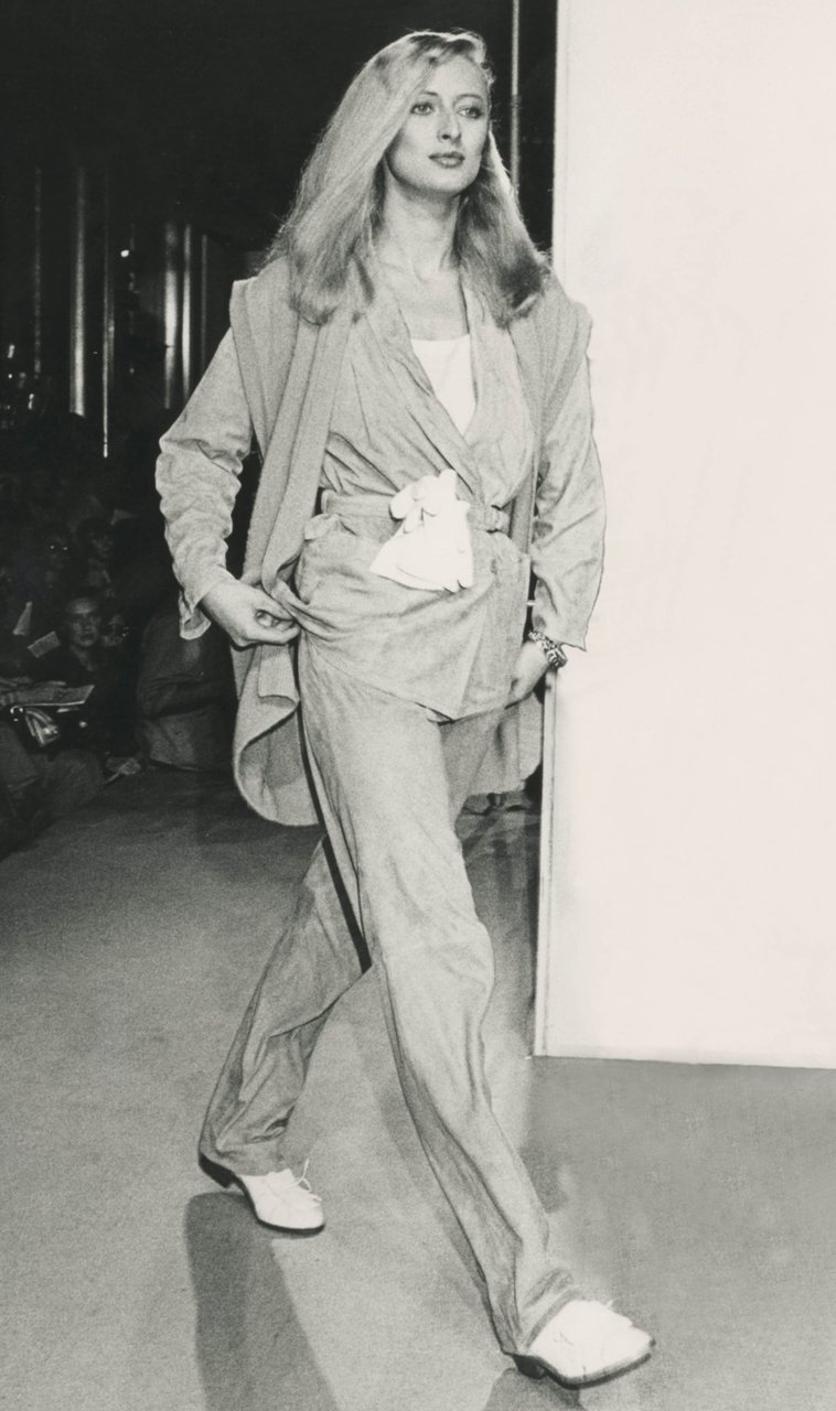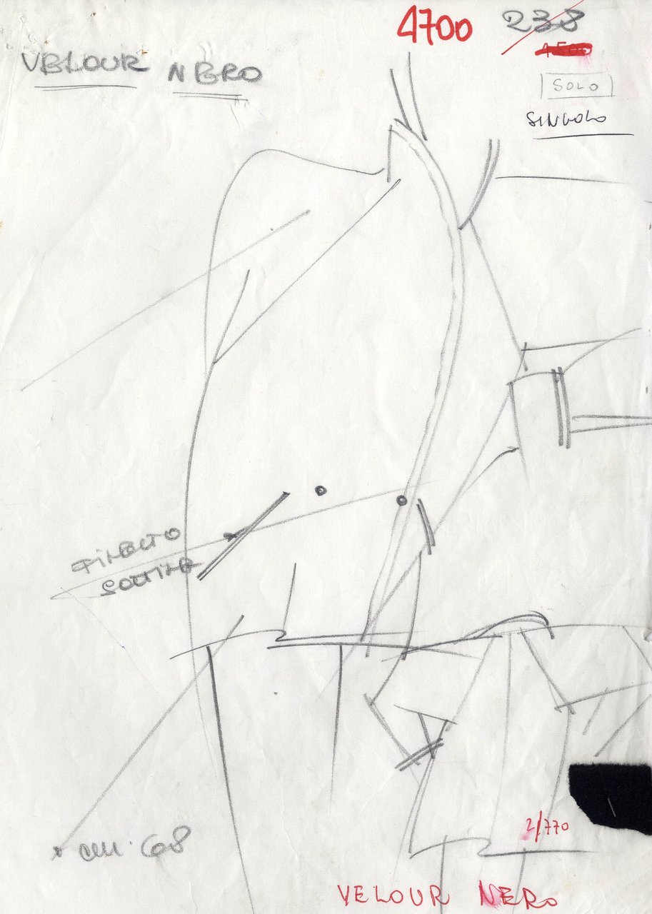 Le linee: la figura è lineare, allungata; le spalle sono importanti e costruite; le maniche, di diversa dimensione in base alla funzione del capo, sempre molto morbide; i colli sono minimi, spesso inesistenti; sciolto e assai duttile il punto-vita. Effetti di morbidezza, sempre portata sul davanti: pinces esterne con impunture triangolari che formano pieghe morenti, tagli in vita più alti dietro e sottolineati sul davanti da arricciature, o tecniche di lavorazione del tricot che permettono di aumentare o gonfiare i volumi, soluzioni di rimborsi centrali favoriti dalla duttilità della suede e del daino.