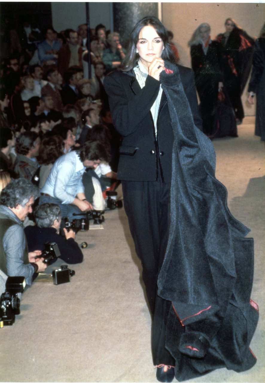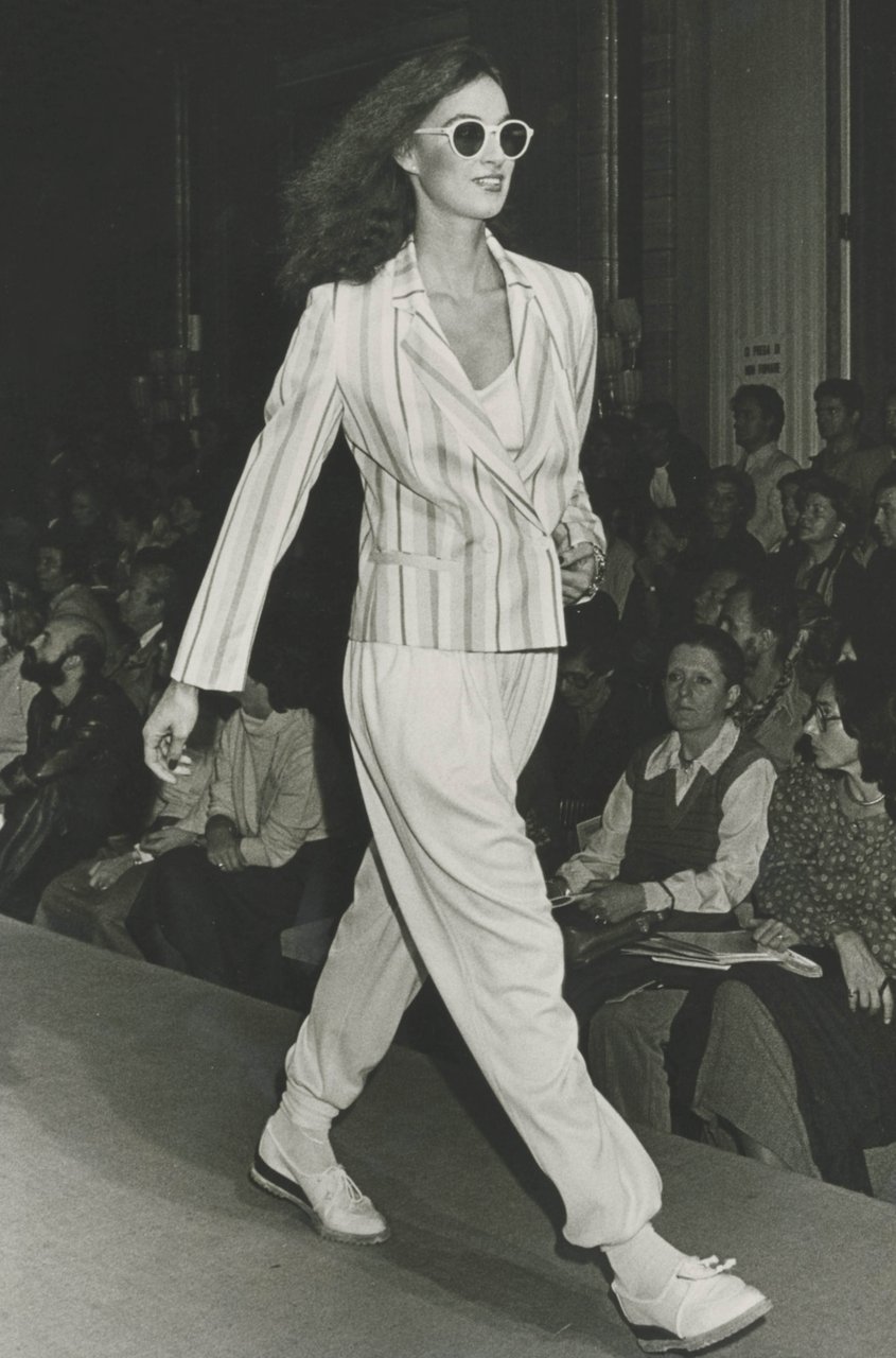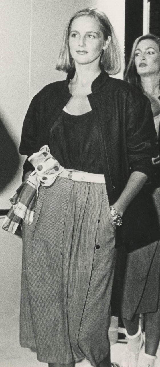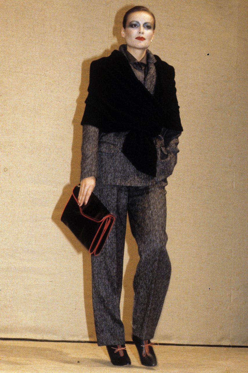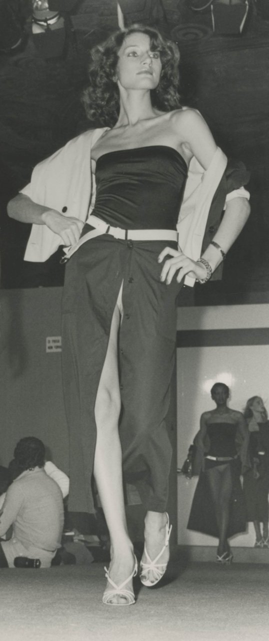 Le linee: la figura è lineare, allungata; le spalle sono importanti e costruite; le maniche, di diversa dimensione in base alla funzione del capo, sempre molto morbide; i colli sono minimi, spesso inesistenti; sciolto e assai duttile il punto-vita. Effetti di morbidezza, sempre portata sul davanti: pinces esterne con impunture triangolari che formano pieghe morenti, tagli in vita più alti dietro e sottolineati sul davanti da arricciature, o tecniche di lavorazione del tricot che permettono di aumentare o gonfiare i volumi, soluzioni di rimborsi centrali favoriti dalla duttilità della suede e del daino.