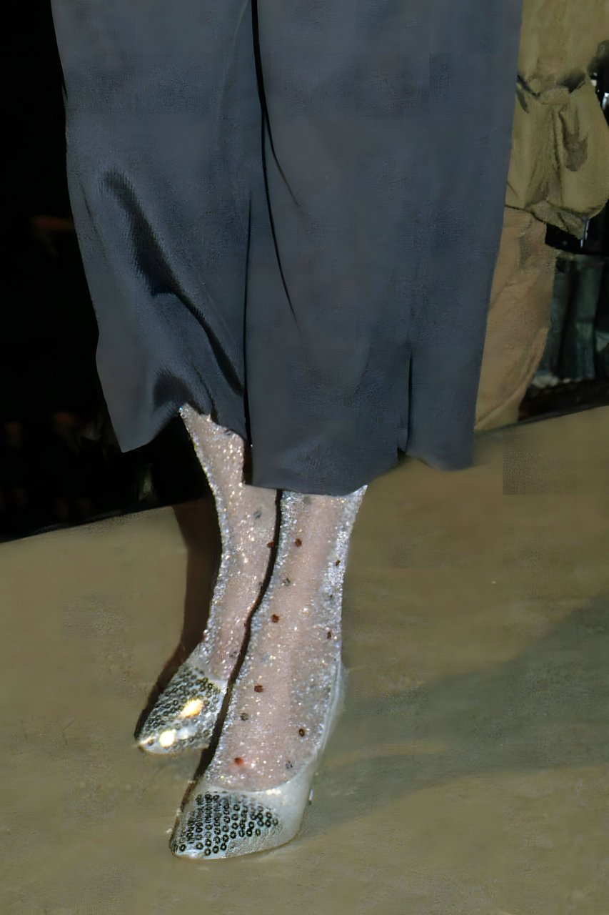 Gli accessori: cinture di elastico intrecciato, pochette o sacchette di pelle con profili di canneté, borse di forma geometrica e divertenti buste in tessuto per la sera. Per le calzature è rinnovato l'uso del tessuto per la classica décolleté, riproposta anche in pelle stampata, usata pure per i polacchini a tacco alto con interno colorato e per le scarpe da casa alla caviglia, senza tacco.
