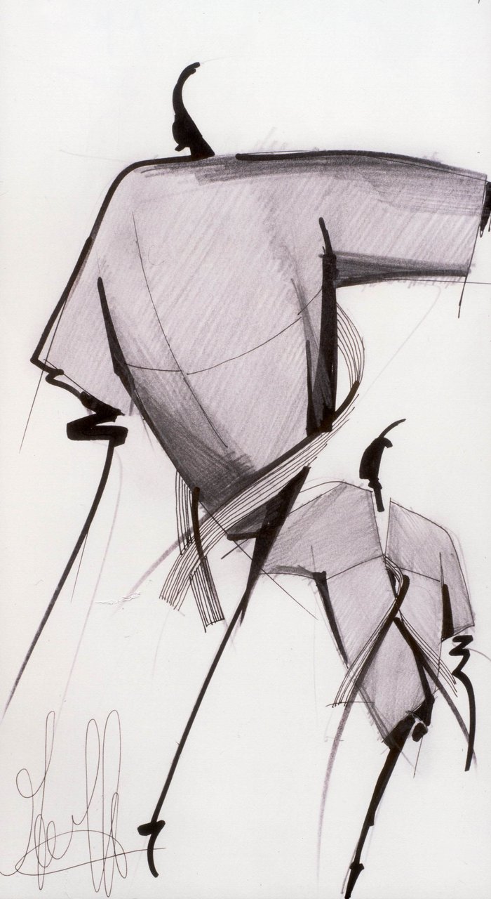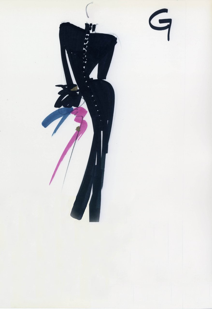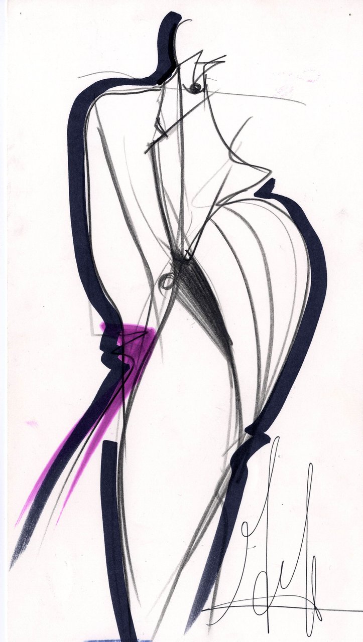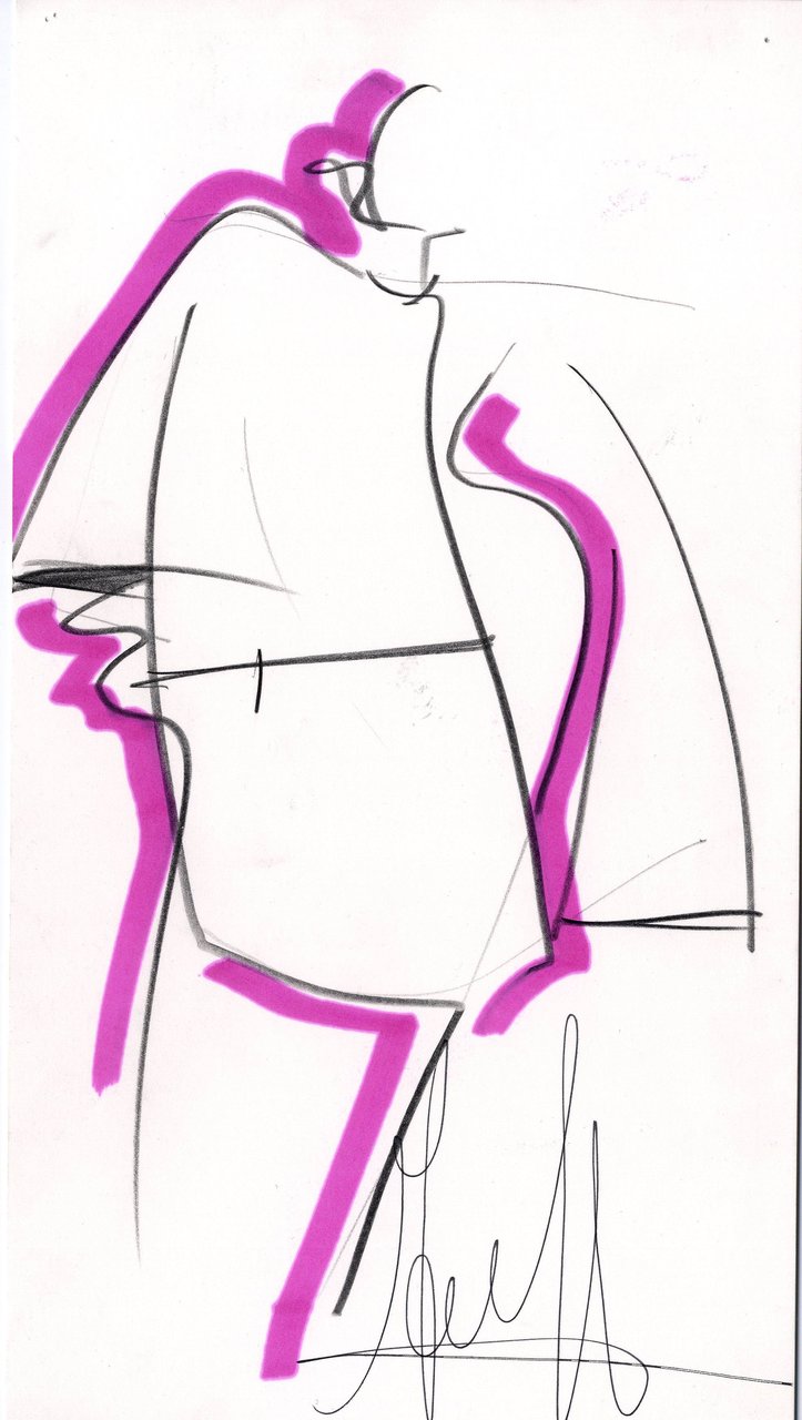 “Leggere la norma in chiave eccentrica, ottenuta attraverso contrapposizioni di forma e materia, forma e colore. Un dandysmo stilizzato: più la linea è depurata, più il linguaggio si affida alla decorazione. Un’eccentricità che diventa elettricità fa sprizzare la silhouette. Ora per un colore, ora per un allargarsi di pieghe, che sbocciano per un gesto improvviso e deliberato”.