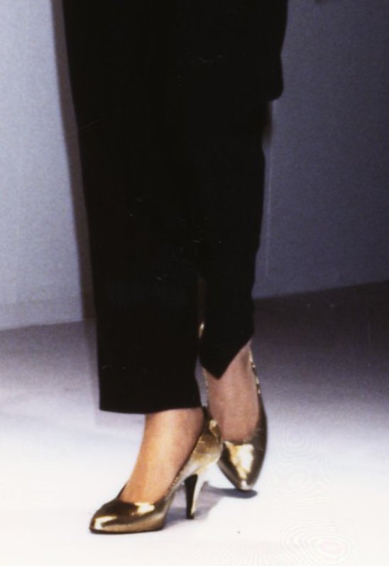Il cappotto di maglia inglese (come i pullover di cachemire), sopra il più formale dei tailleur blu. Il paltò simile a un sontuoso accappatoio: in vera spugna di lana merinos, con i bordi ricamati e il monogramma. Le giacche di foggia diversa, impreziosite da cinque bottoni gioiello, uno diverso dall'altro; oppure decorate con spille vittoriane. Le giacche percorse da motivi in rilievo di passamaneria dorata, quasi un ricordo indefinito di esercito e divise. Il vestito-pullover per le sere austere, lungo, nero, interamente abbottonato sulla schiena; da aprire all’orlo, o al collo, fino ai limiti personali del pudore. La scarpa a pantofola, piatta, esagerata da un fiocco o da una fibbia. Il tacco a rocchetto.