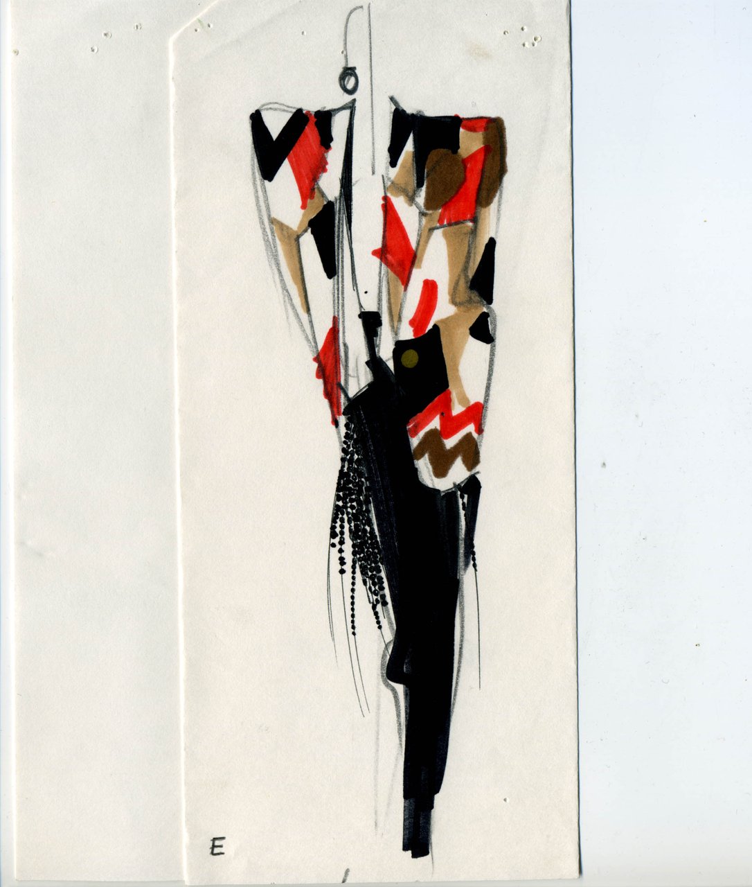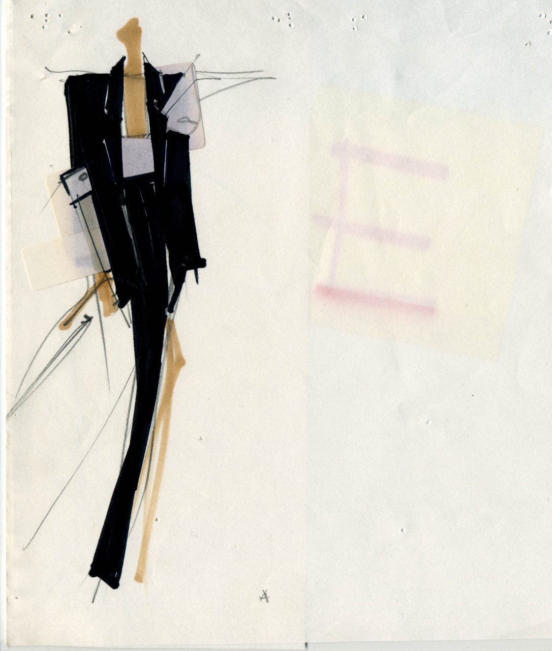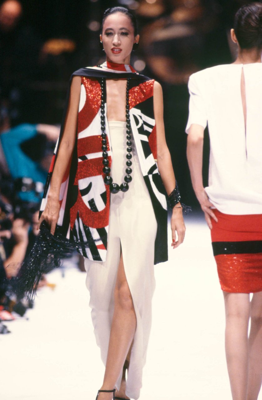 Riflettendo in merito alla collezione: sentirsi a proprio agio nel tailleur senza maniche, con la giacca maschile decorata a stampe vistose e grafismi evidenti, sul pantalone in fresco di lana grigia. Apprezzare il comfort di un tailleur che contraddice il formalismo di un tessuto maschile, il fresco di lana, trasformando la giacca in un doppio gilet ben sostenuto: uno di piquet bianco, l’altro di tessuto. Estenuare la giacca virile, sciolta e svasata verso il fondo, con le preziose drapperie di seta, il nero del raso e il candore del piquet. Portando la collana a chicchi giganti di legno come un uomo porta la cravatta.