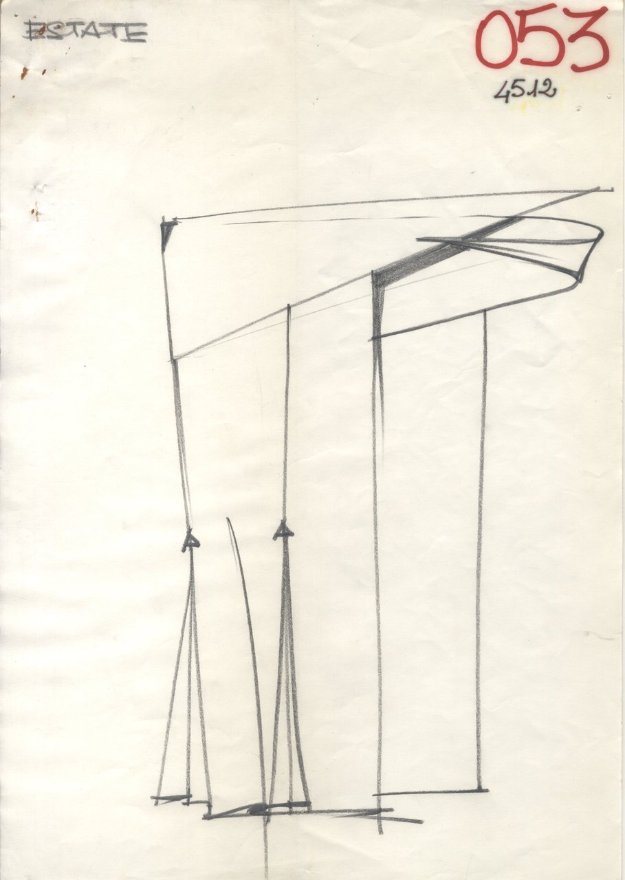 Particolarmente sottolineata l’eccentricità dei volumi: una forma-cupola a tutto tondo, ottenuta in parte con i materiali gonfi, in parte con una costruzione naturale di pieghe.