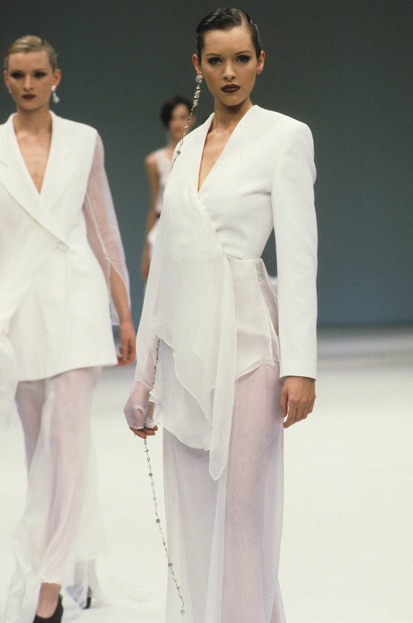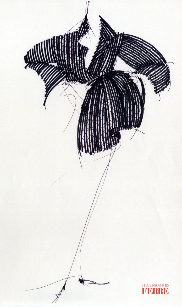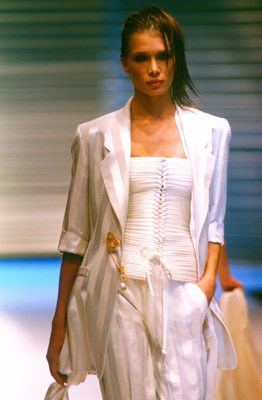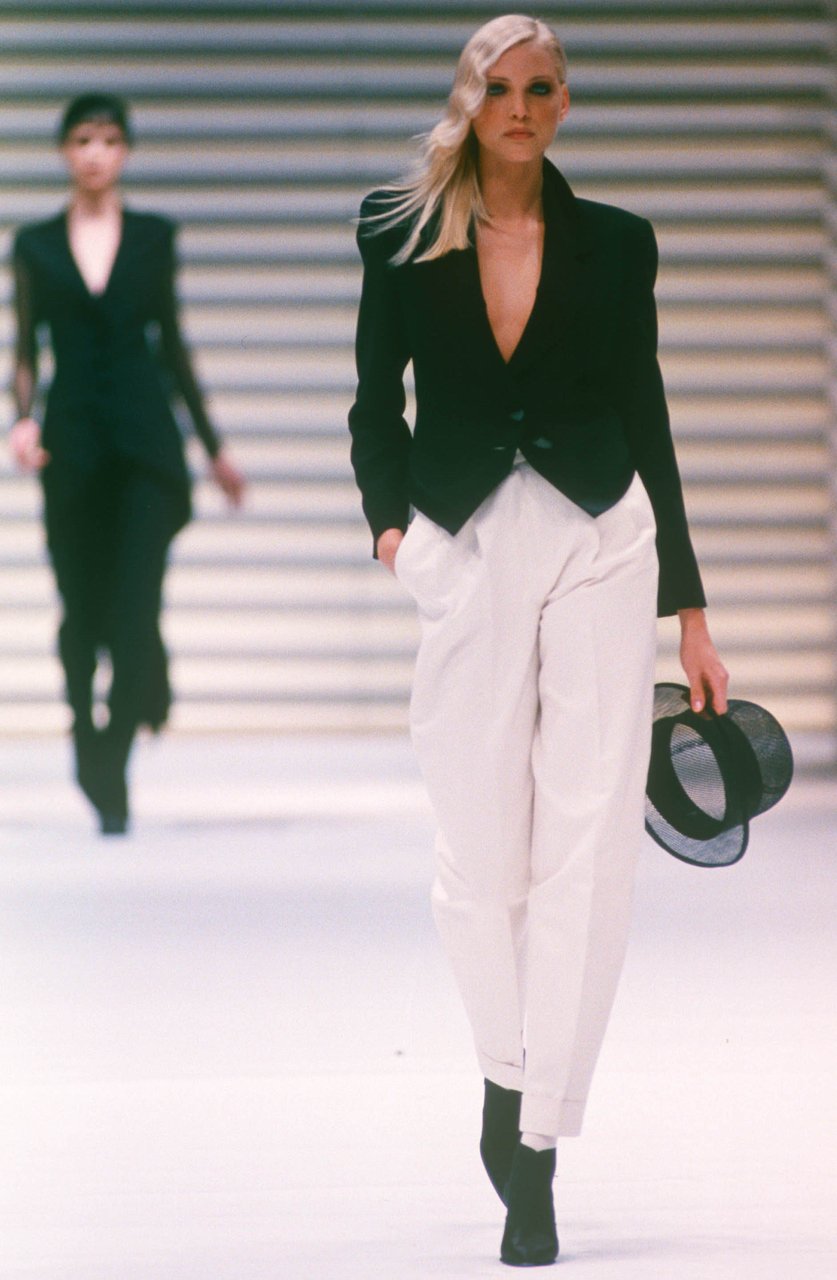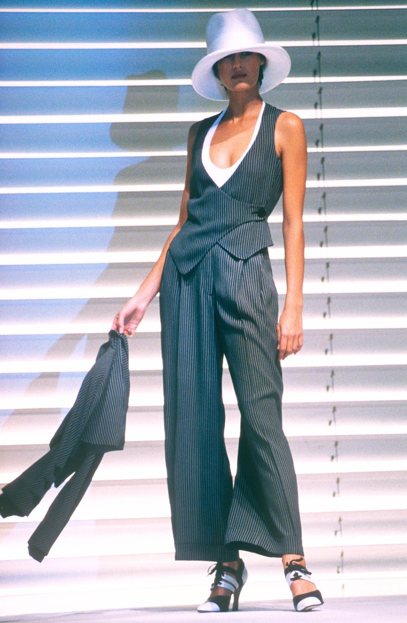 “Una miscela di urbanità e spirito selvaggio. Il senso di libertà che in una cornice civile, mediterranea, donano le materie ‘décontracté’... reminiscenze, qua e là, d'inizio secolo, animate dal piacere di mescolare con audacia cose tradizionali. Alla concretezza, a quel che chiamo elementarità, ho voluto dare le sfumature incantate del sogno, un alone di leggerezza, lieve come un profumo, aleggia la memoria di una silhouette vagamente chapliniana: pantalone largo e corto al malleolo, giacca breve con spalle naturalmente ampie, bianco e nero come ‘Tempi moderni’. E un’energia, un’ironia tutta moderna mescola preziosità e ruvidezze, aggressività e tenerezza”.