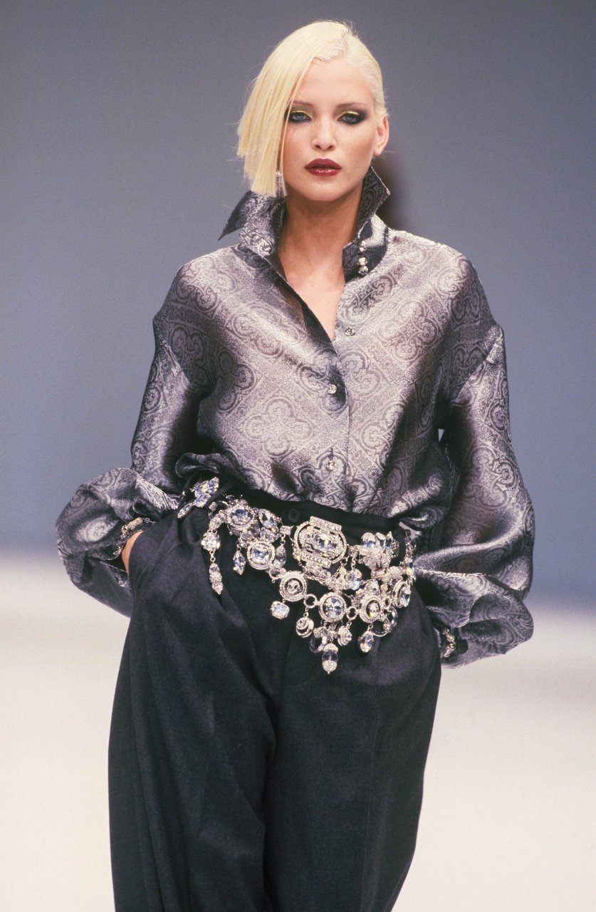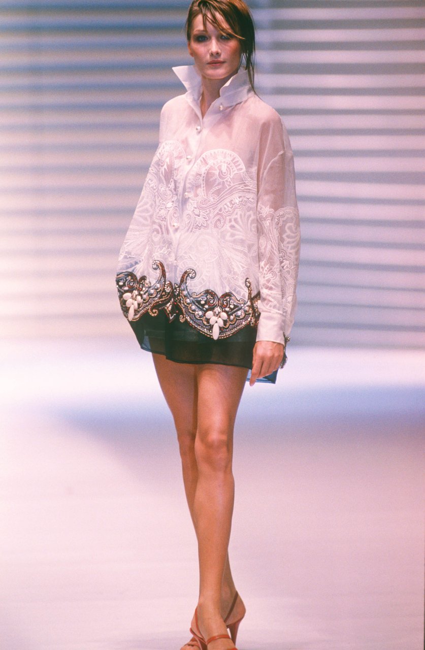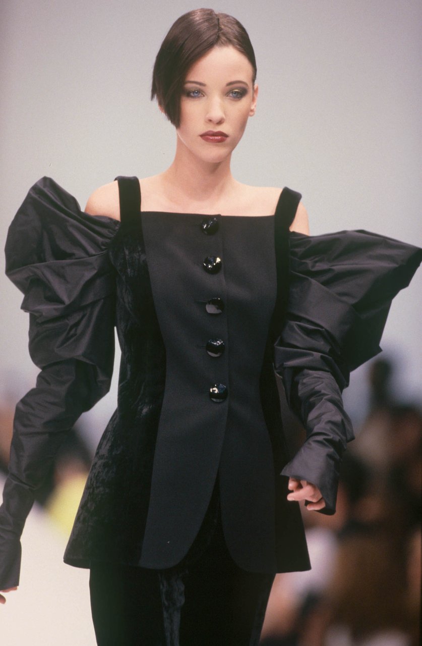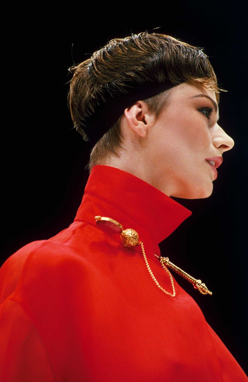 “Una miscela di urbanità e spirito selvaggio. Il senso di libertà che in una cornice civile, mediterranea, donano le materie ‘décontracté’... reminiscenze, qua e là, d'inizio secolo, animate dal piacere di mescolare con audacia cose tradizionali. Alla concretezza, a quel che chiamo elementarità, ho voluto dare le sfumature incantate del sogno, un alone di leggerezza, lieve come un profumo, aleggia la memoria di una silhouette vagamente chapliniana: pantalone largo e corto al malleolo, giacca breve con spalle naturalmente ampie, bianco e nero come ‘Tempi moderni’. E un’energia, un’ironia tutta moderna mescola preziosità e ruvidezze, aggressività e tenerezza”.