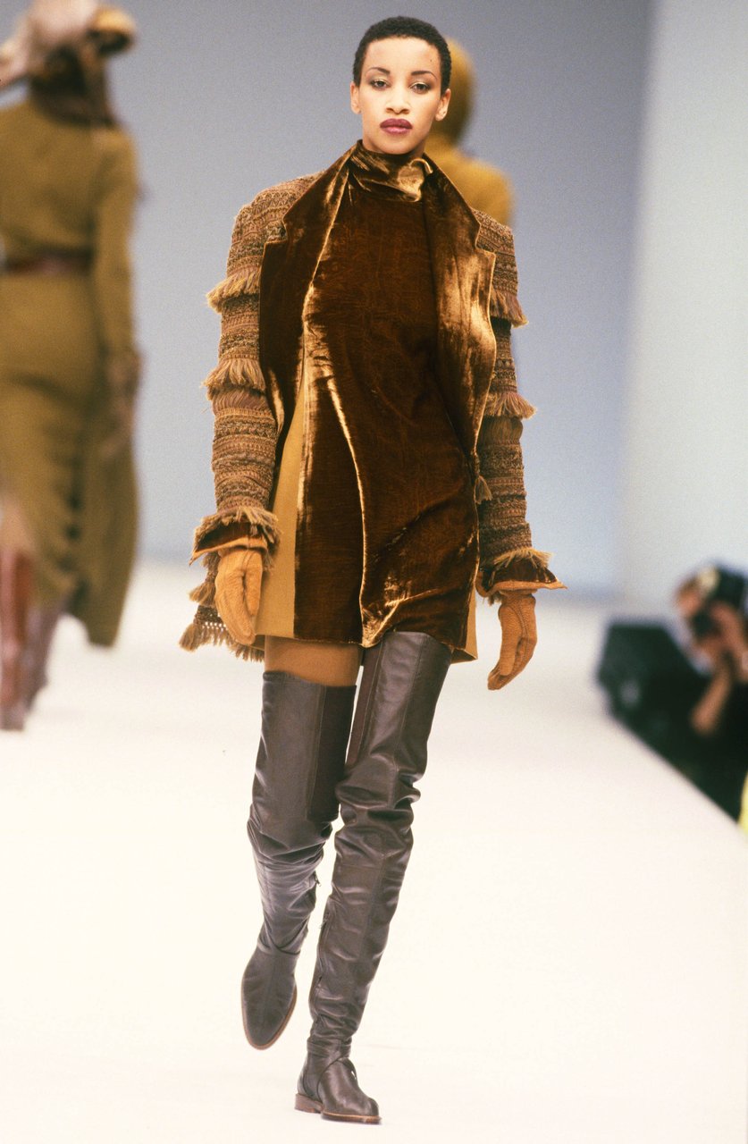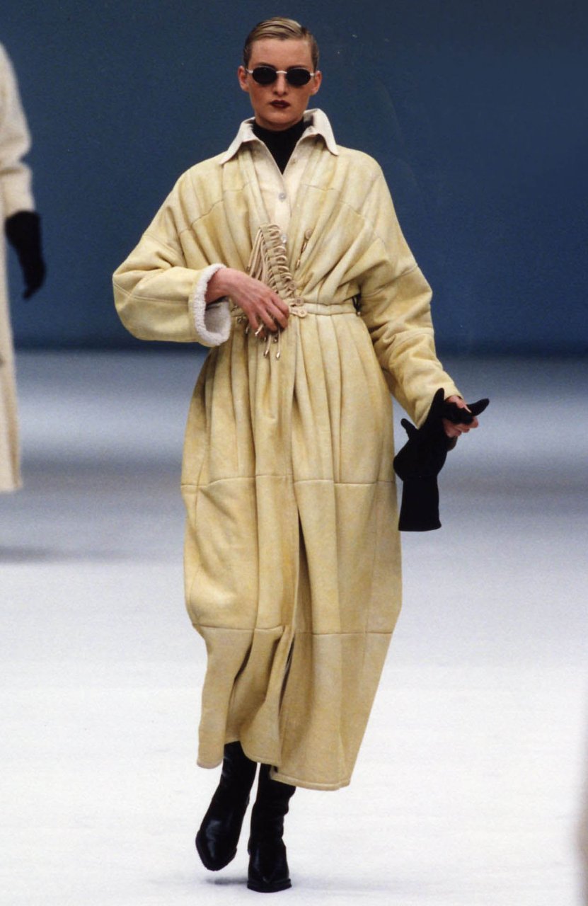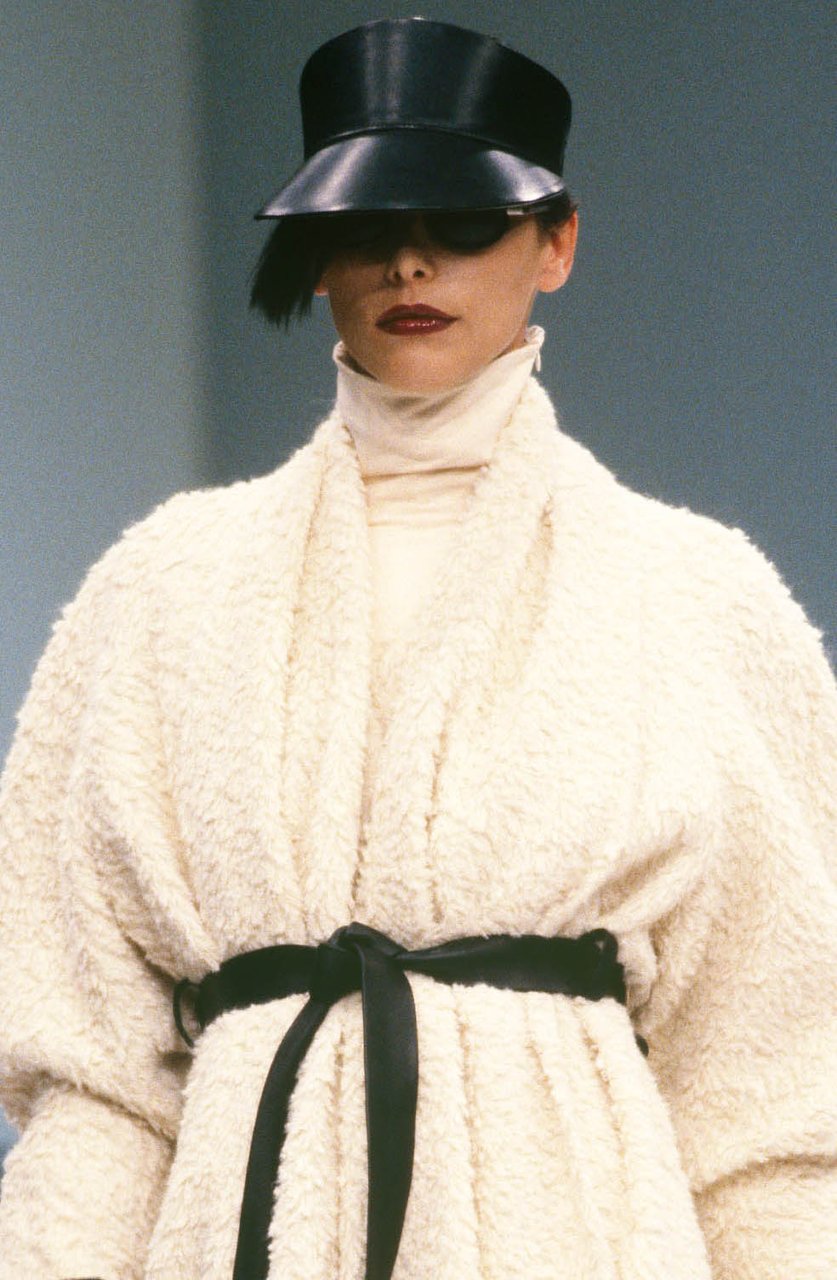 Materia e forma. Per misteriose alchimie, la materia presta il suo corpo alla forma e raggiunge soluzioni sorprendenti, effetti scultorei. I nuovi volumi nascono da cascate seriche: taffetas, velluti di seta tubici, velluti di seta e viscosa. Certe dolcezze si ottengono sposando il velluto al cashmere. Come nella Wunderkammer, niente è ciò che sembra: la pelle marezzata di animale, simile a lontra leggera, si rivela un velluto ammorbidito e schiarito. La ciniglia a trame larghe, foderata di georgette e trapunta, diventa una gonna di filo intrecciato. La passamaneria e i cordoni tapisserie – ingranditi, slentati, in filo di ciniglia – diventano caban e scialli sontuosi. La pelliccia che sembra di struzzo e di piume è una massa di lana lavorata a fiocchi sul canovaccio.