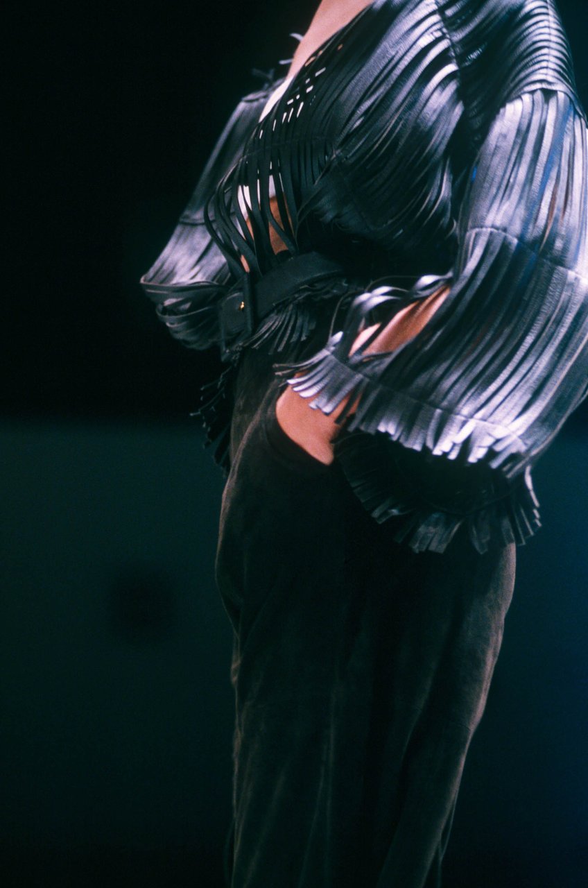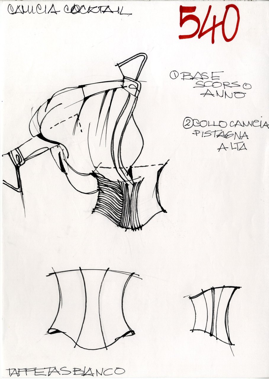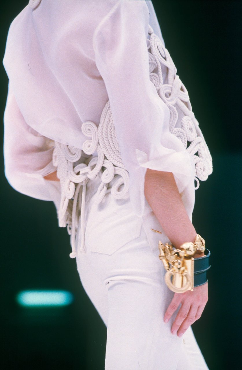 Le materie. Consistenza, spessore, lievità, contrasti... cordone delle cime da barca per decorare un lungo gilet profilato di spighetta. Pizzo écru consistente e opaco, foderato di georgette, per il tailleur a uomo. Garza e tulle stretch o con uno spiritoso aspetto zanzariera. Shantung e suède lavato per le sahariane. Il pull di cotone con note di rosso per la giacca quasi da cadetto portata di sera. Alchimie del lino, grezzo da un lato, spalmato d’argento sull'altro. Pitone o pelle d’elefante tagliati a strisce, applicate su maniche di tulle o georgette che, rimboccate, formano un'immaginaria matassa. Tessuti maschili di seta molle o crespo di seta, gessati con un filo di ajour.