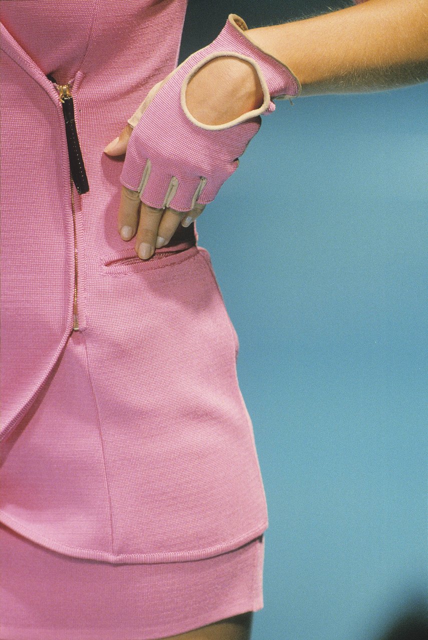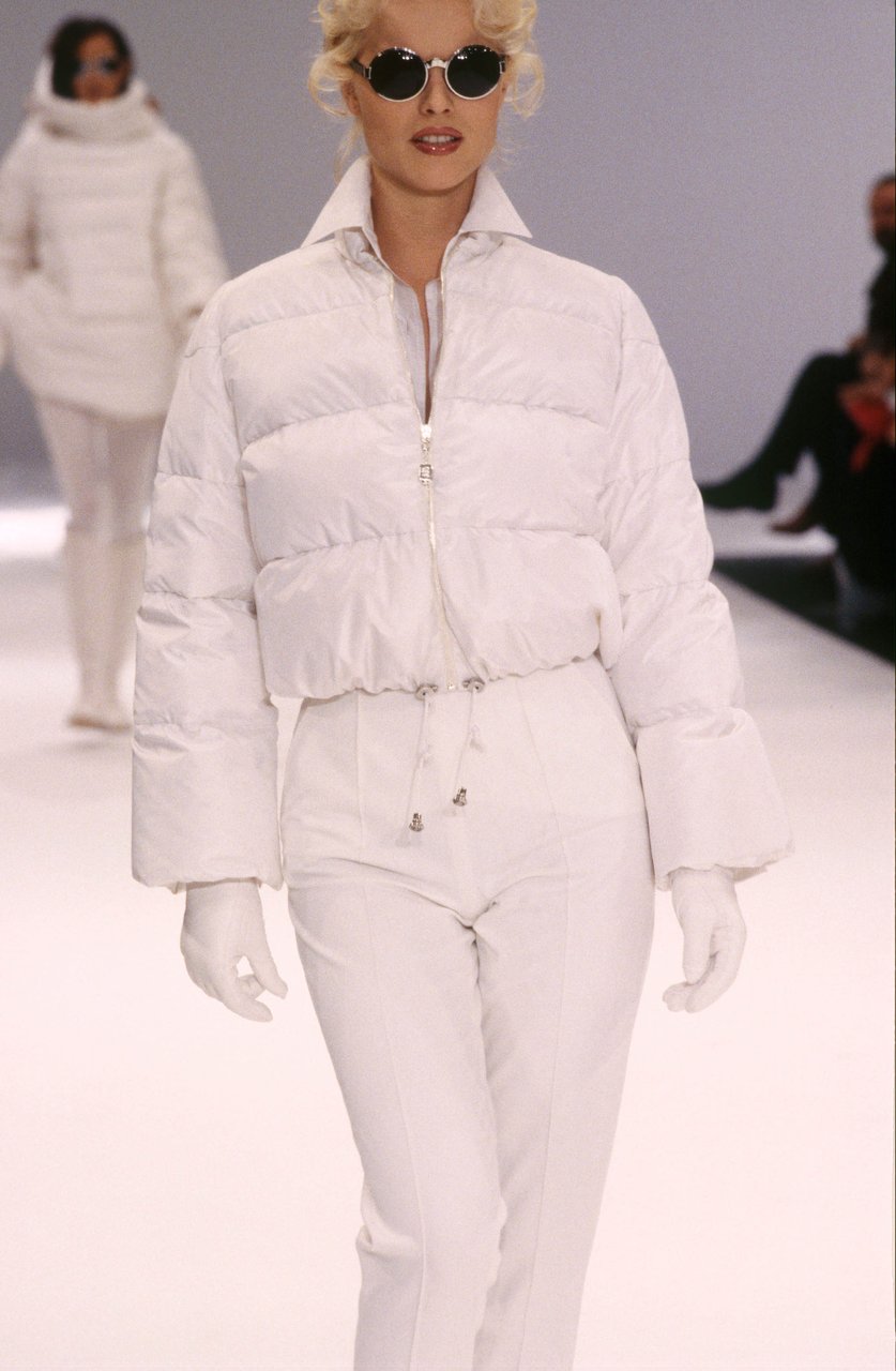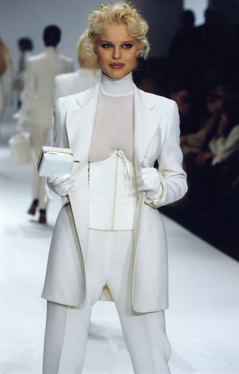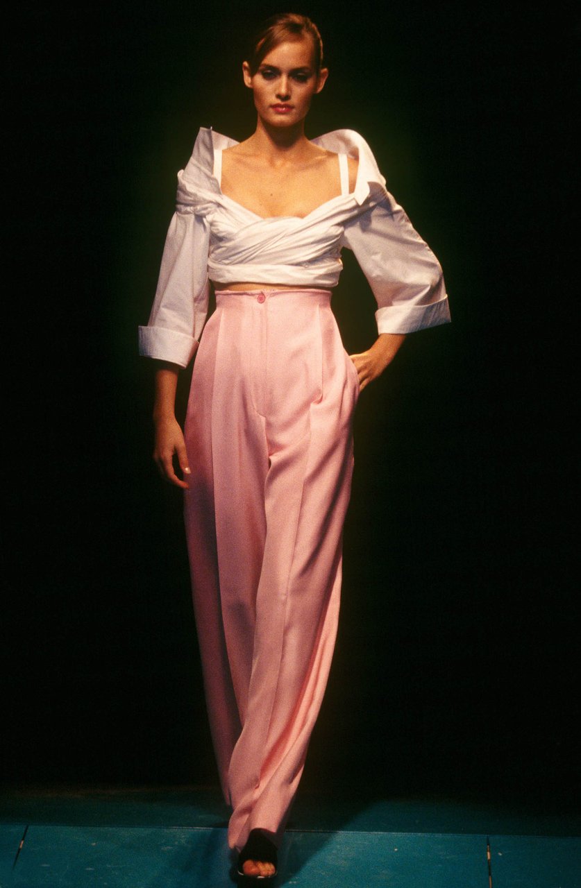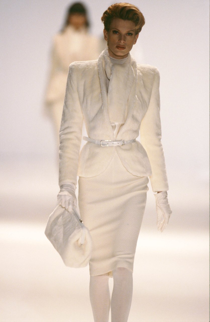 Variazioni su tailleur e pullover. Il tailleur diventa una femminilissima tuta da sub. Il pullover diventa importante come un vestito: di seta, cotone, cachemire, aderenti al corpo, dai quali spuntano – come ricordi di camicie bianche – lembi e pezzi candidi.