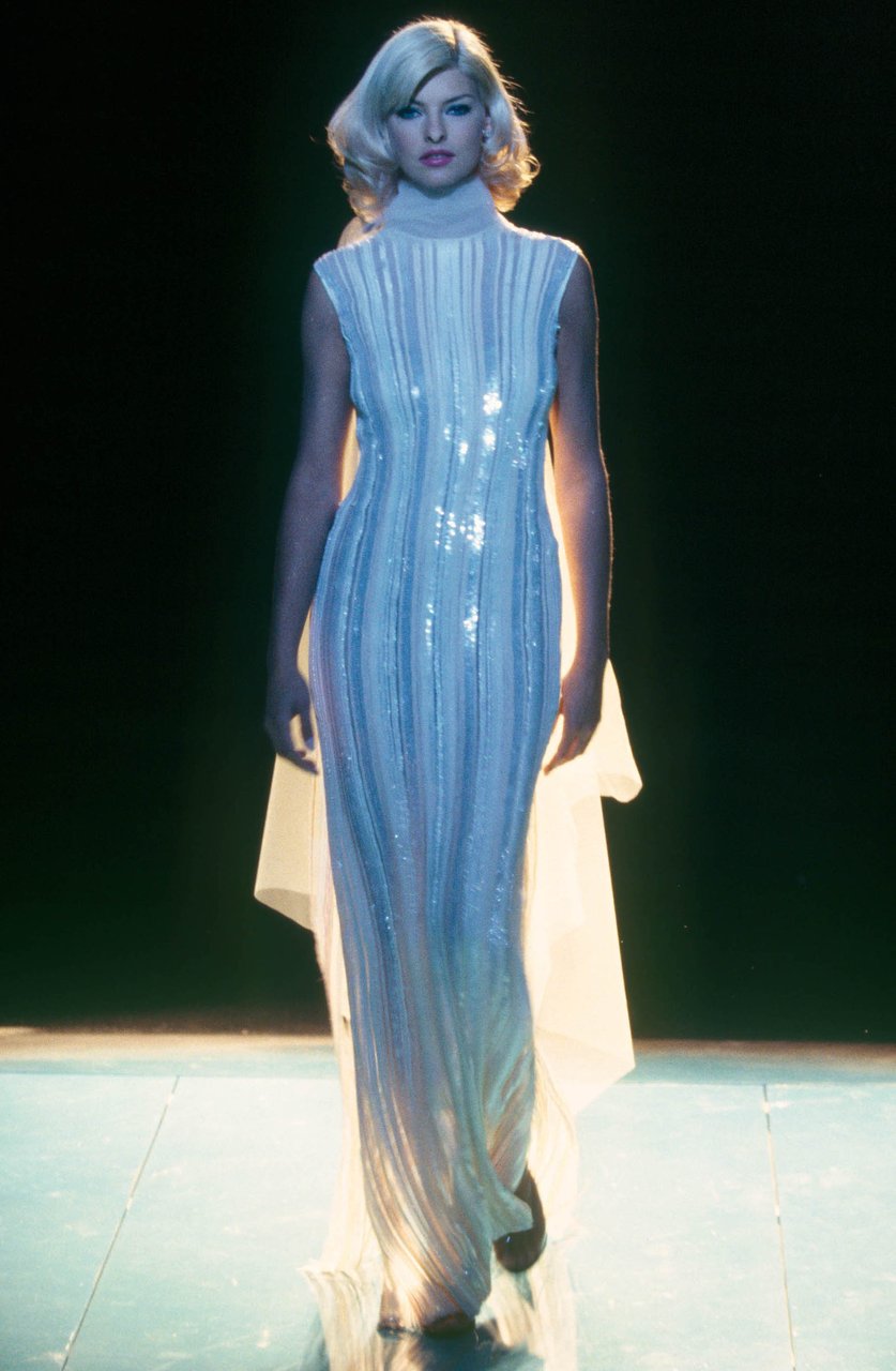 I nuovi classici tra i materiali: tessuto elasticizzato, doppia duchesse, pelle tagliata al vivo e applicata sul tulle stretch, seta elastica, seta e viscosa mescolate a strisce o tricottate, seta, cotone, cachemire, cady di seta, organza elastica, neoprene, stecca di balena ricamata d’oro ed elastica abbinata al crêpe di seta con intarsi di tulle, cordini in organza sfumata.
