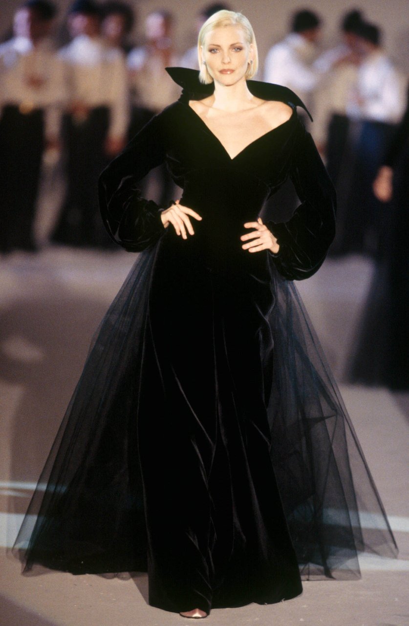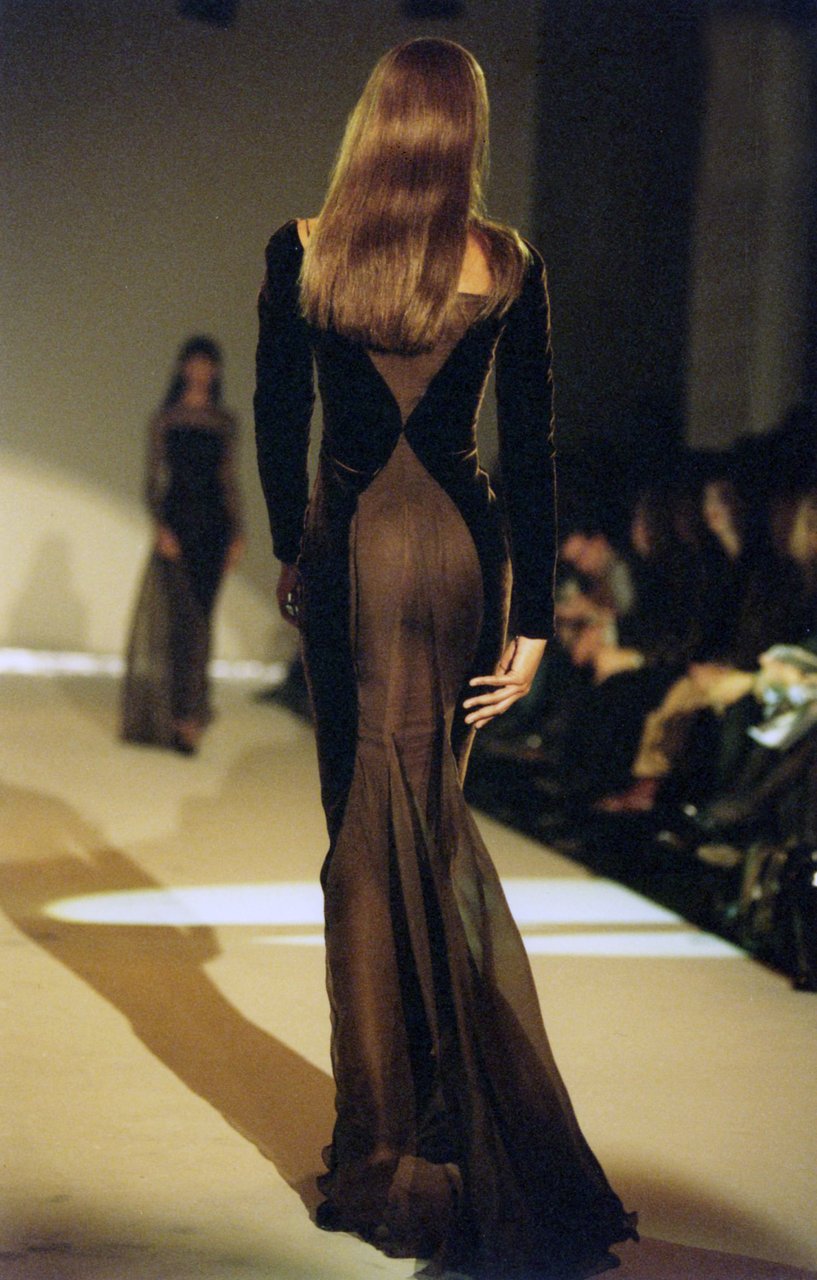 Vestirsi per piacere. Se di giorno la silhouette si ferma al ginocchio o è sottolineata dai pantaloni, di sera conosce la libertà assoluta: vestito-pullover completato solo da un paio di calze opache; vestito lungo; vestito lunghissimo. Tuniche di tulle e velluto di un marrone denso, quasi nero, con scie improvvise di nudo. La magia dei fili di metallo, dentro i quali restano impigliate cascate di corallini, e dei setacci risplendenti di polvere d’argento, per le tuniche a guanto ricamate su rete piccolissima. Vestiti sorprendenti: davanti sottili, con la gonna a vita alta appena svasata e la camicia di velluto. Dietro, grandi fazzoletti di tulle. Tulle bianco, tulle nero.