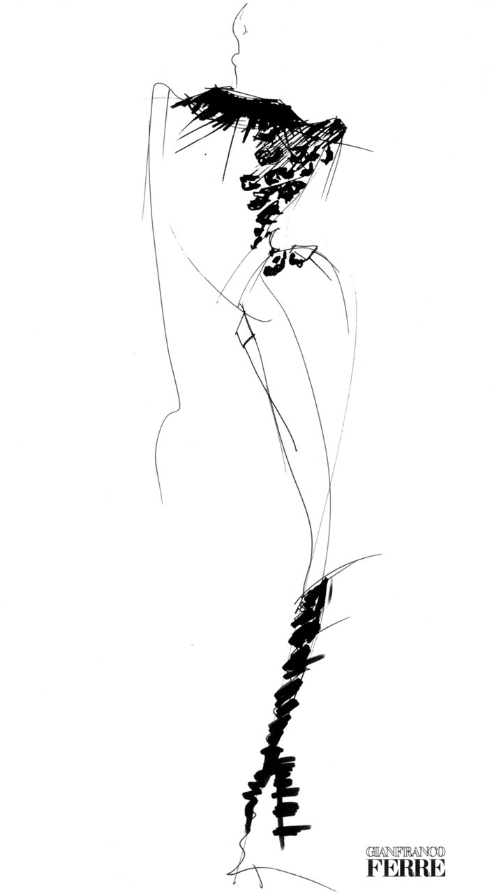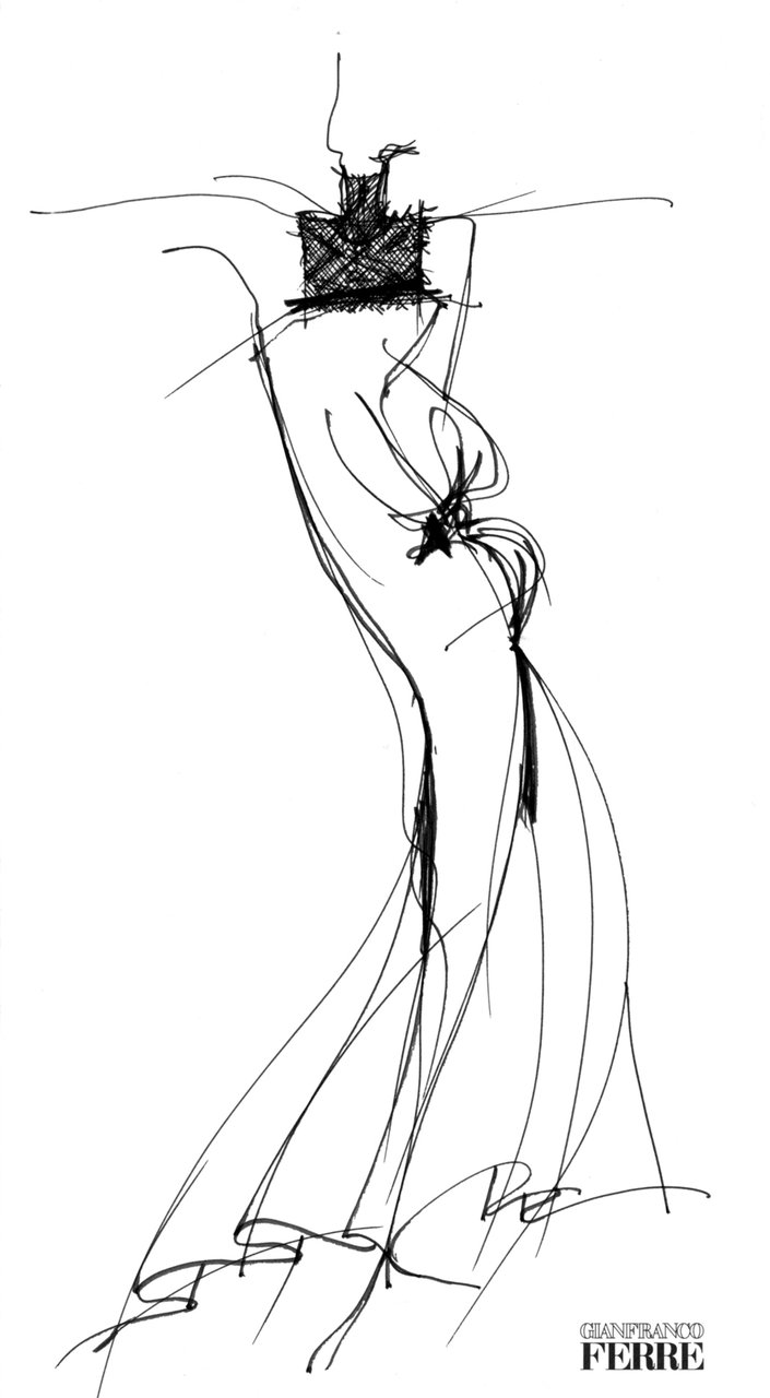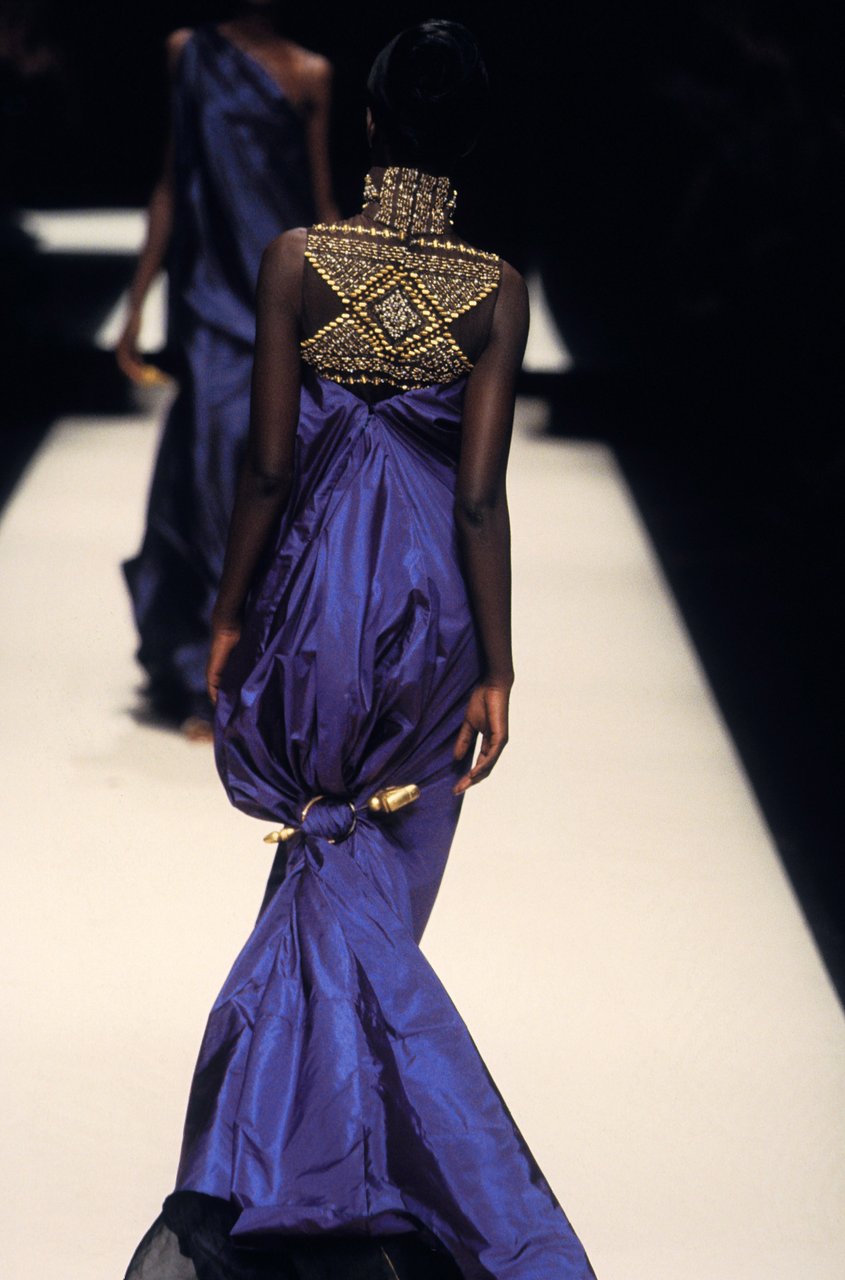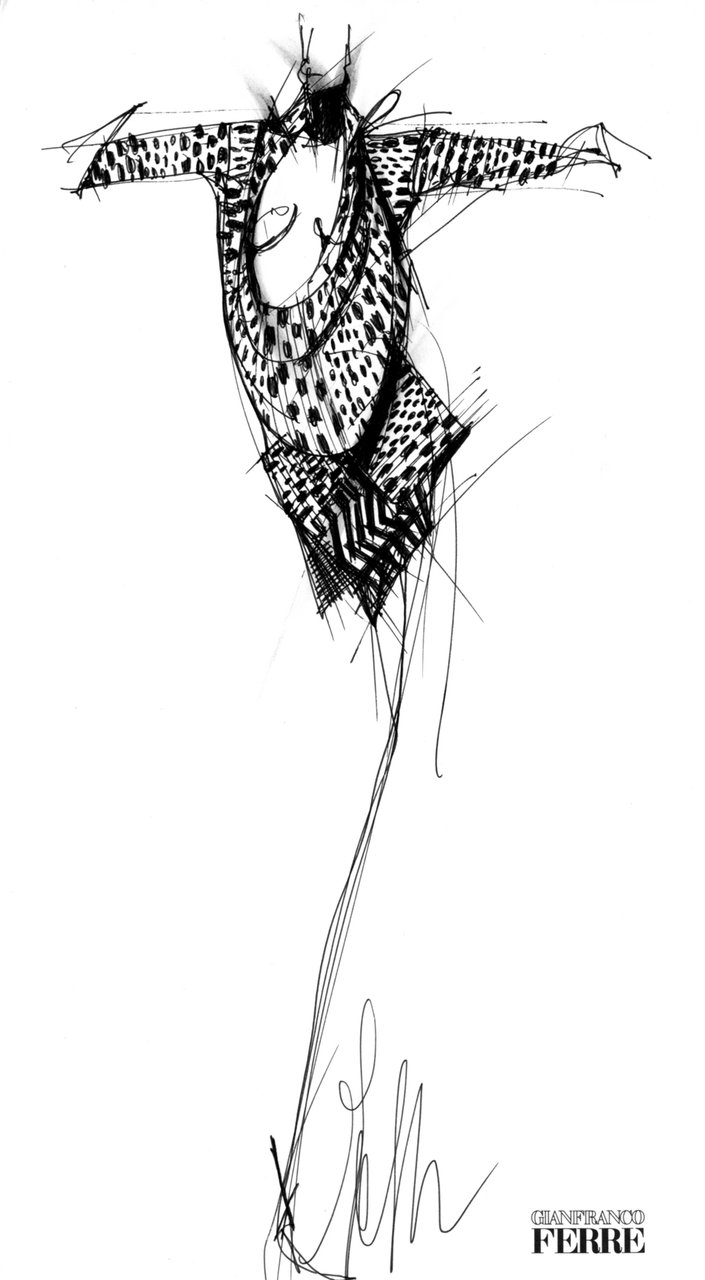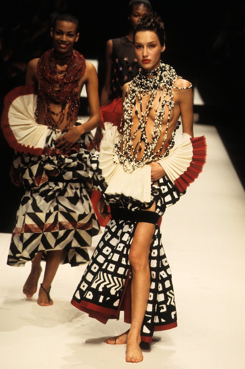 “Se penso all’Africa, vedo un album di fotografie scattate in bianco e nero e poi scannerizzate… profili e forme, sensuali perché elementari, provocanti perché nude, voluminose ed opulente ma composte di finti stracci che ho tradotto in nobilissimi materiali: gazaar di seta, shantung cangiante, doppio taffetas, quadrupla organza – perché tutto sia leggero ma al tempo stesso elaborato. I disegni hanno la forza di tatuaggi che sottolineano la figura, sono segnali di seduzione che si mischiano al body painting. I gioielli diventano vestiti, i vestiti sono gioielli che guarniscono il corpo, giungendo alle radici della linea e della decorazione. Con una magia che vibra di inusitate riflessioni”.