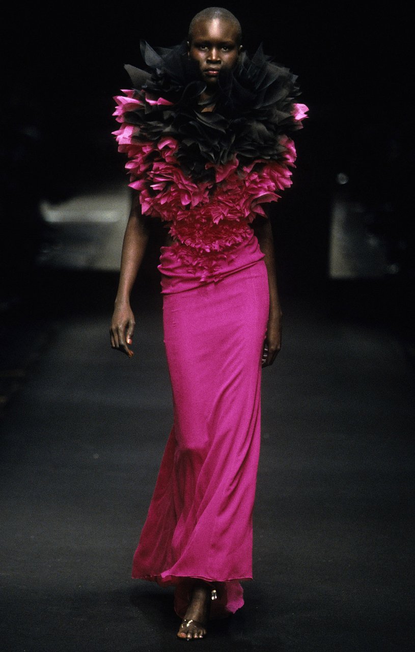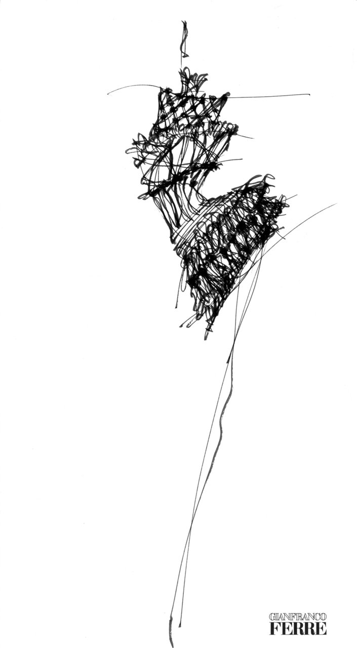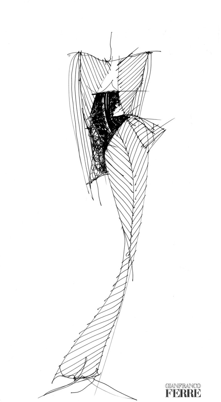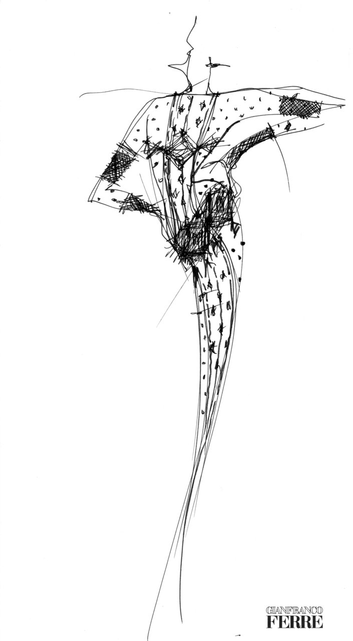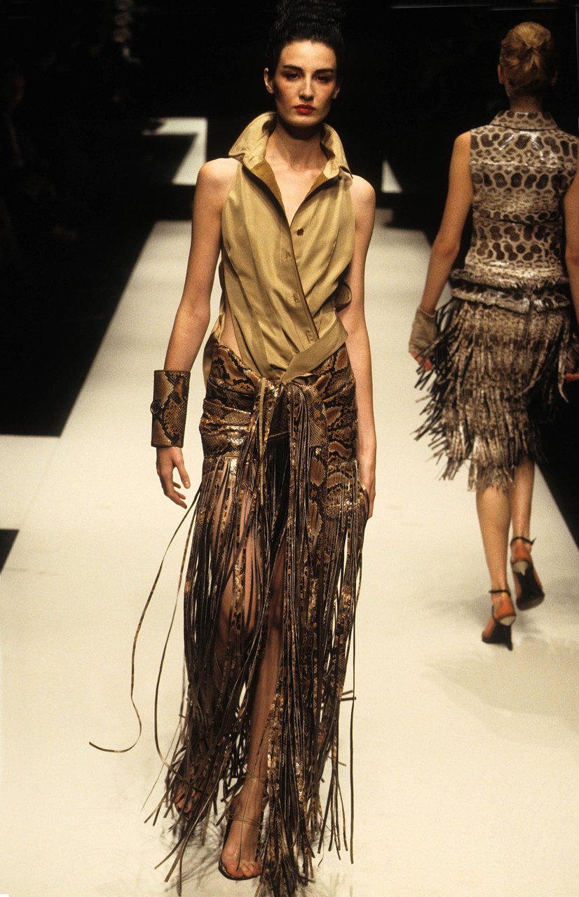 “Se penso all’Africa, vedo un album di fotografie scattate in bianco e nero e poi scannerizzate… profili e forme, sensuali perché elementari, provocanti perché nude, voluminose ed opulente ma composte di finti stracci che ho tradotto in nobilissimi materiali: gazaar di seta, shantung cangiante, doppio taffetas, quadrupla organza – perché tutto sia leggero ma al tempo stesso elaborato. I disegni hanno la forza di tatuaggi che sottolineano la figura, sono segnali di seduzione che si mischiano al body painting. I gioielli diventano vestiti, i vestiti sono gioielli che guarniscono il corpo, giungendo alle radici della linea e della decorazione. Con una magia che vibra di inusitate riflessioni”.
