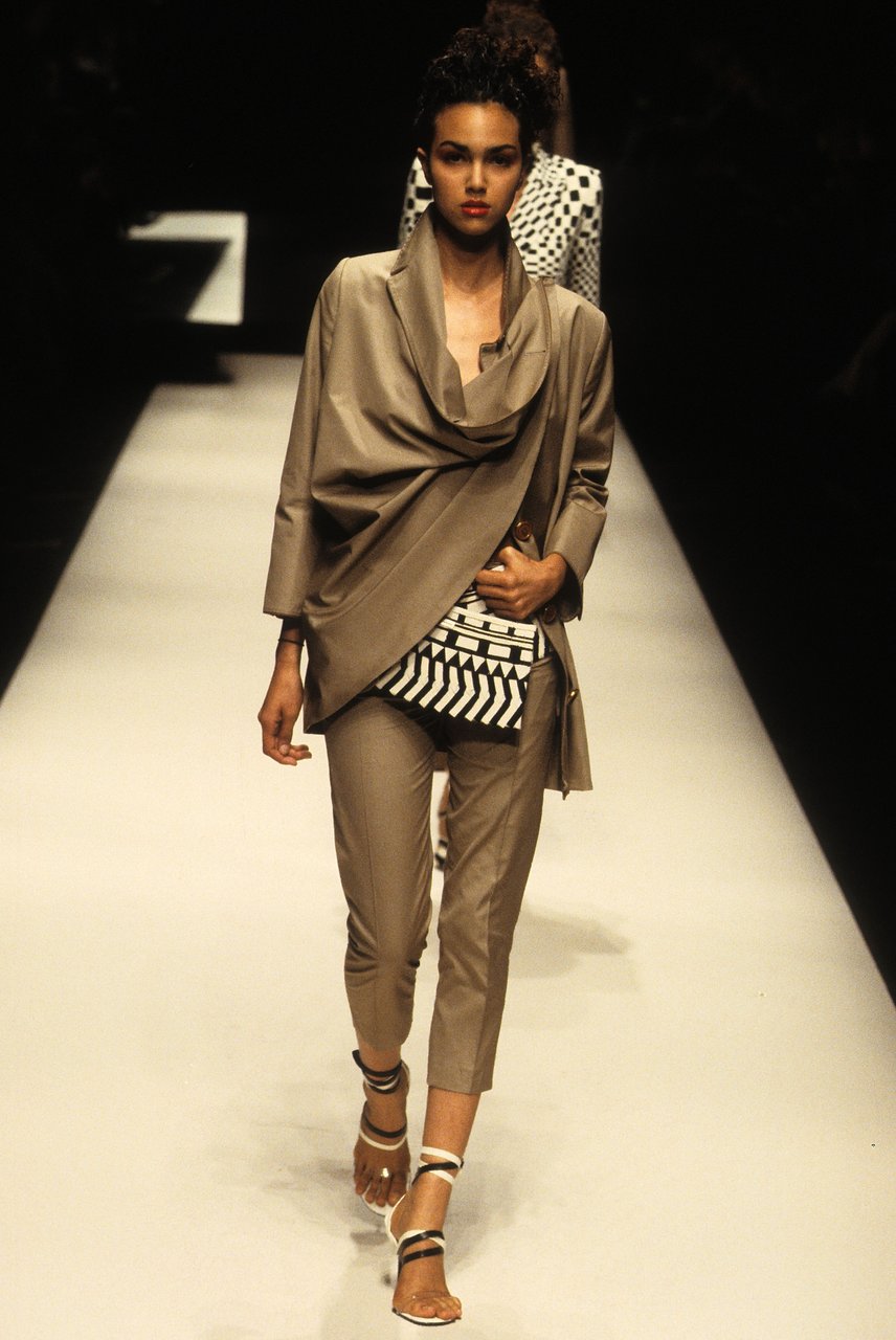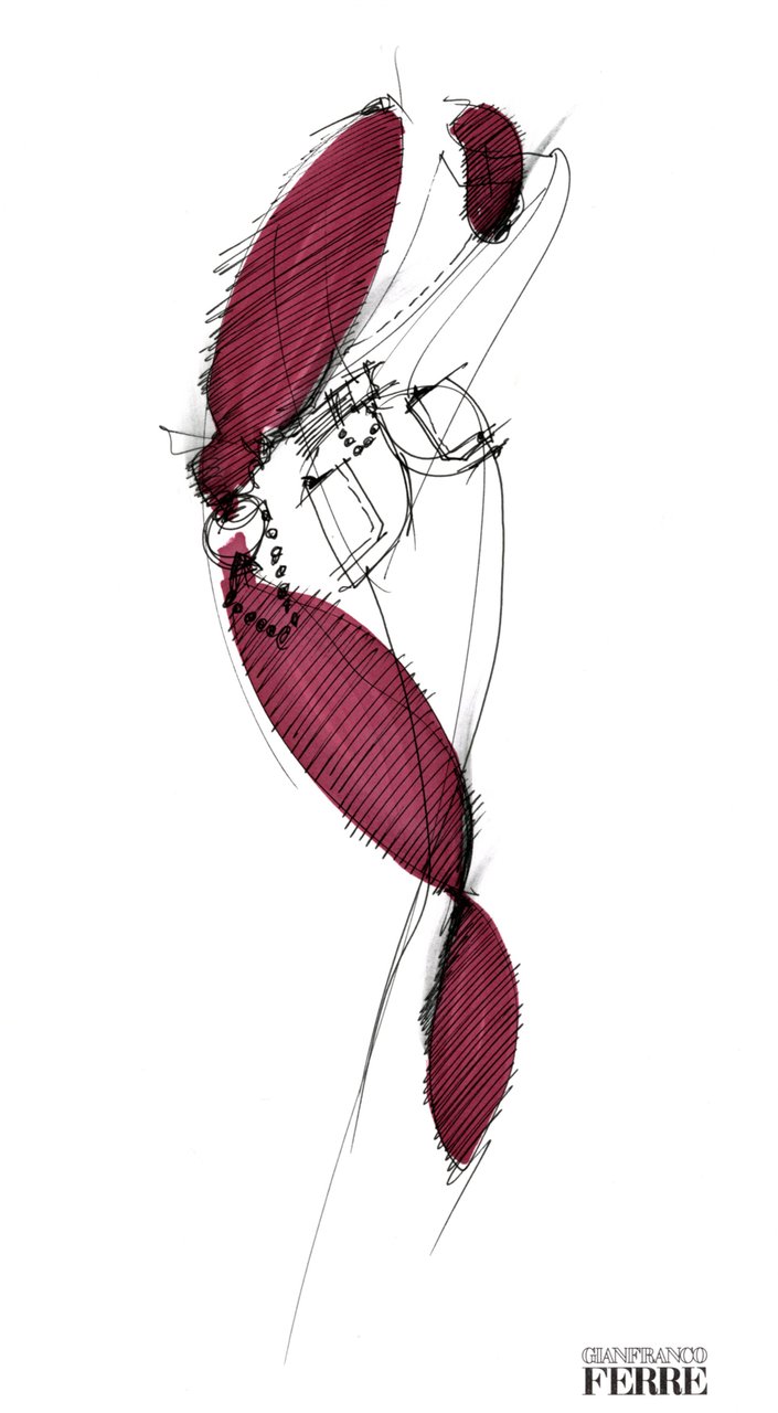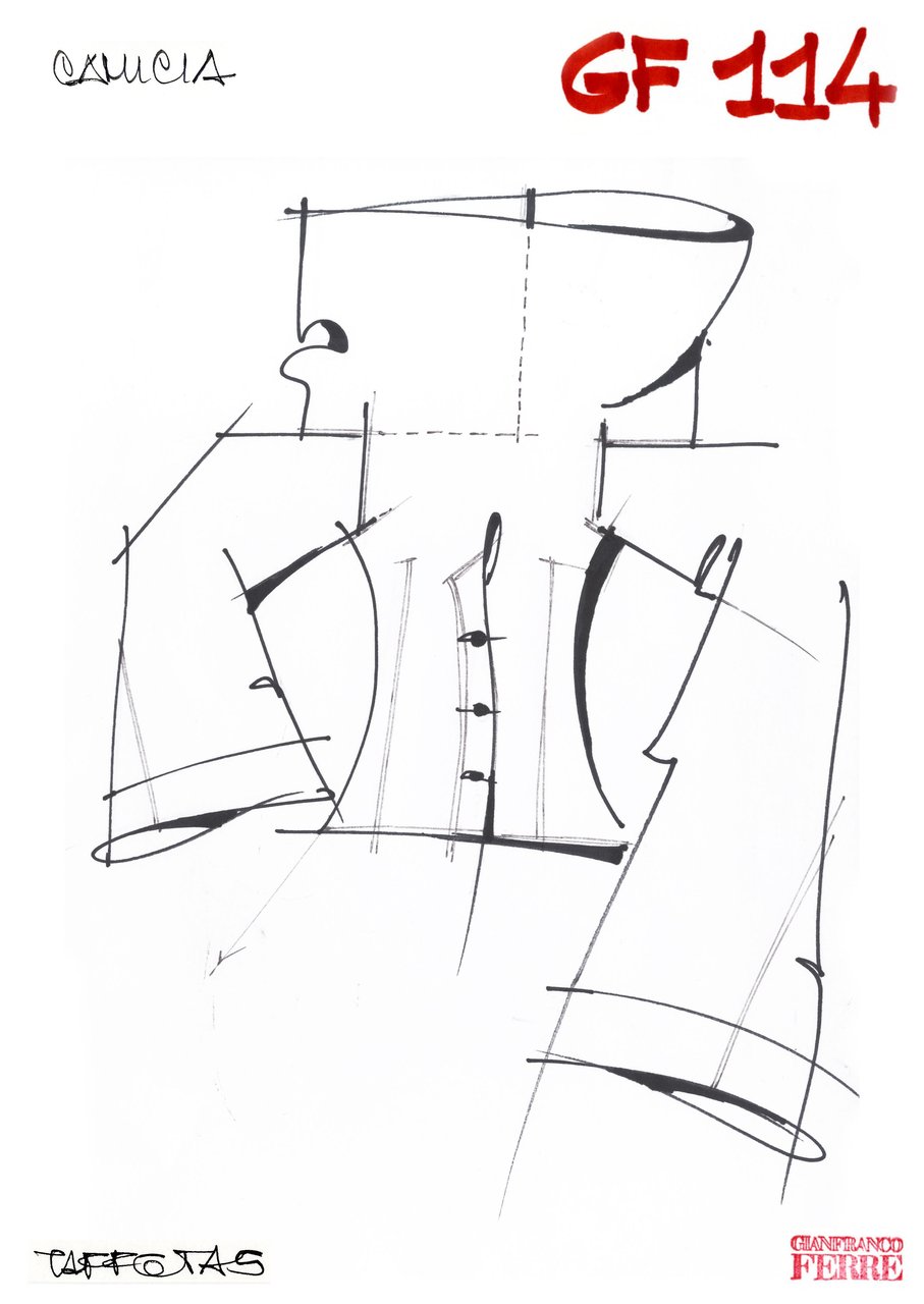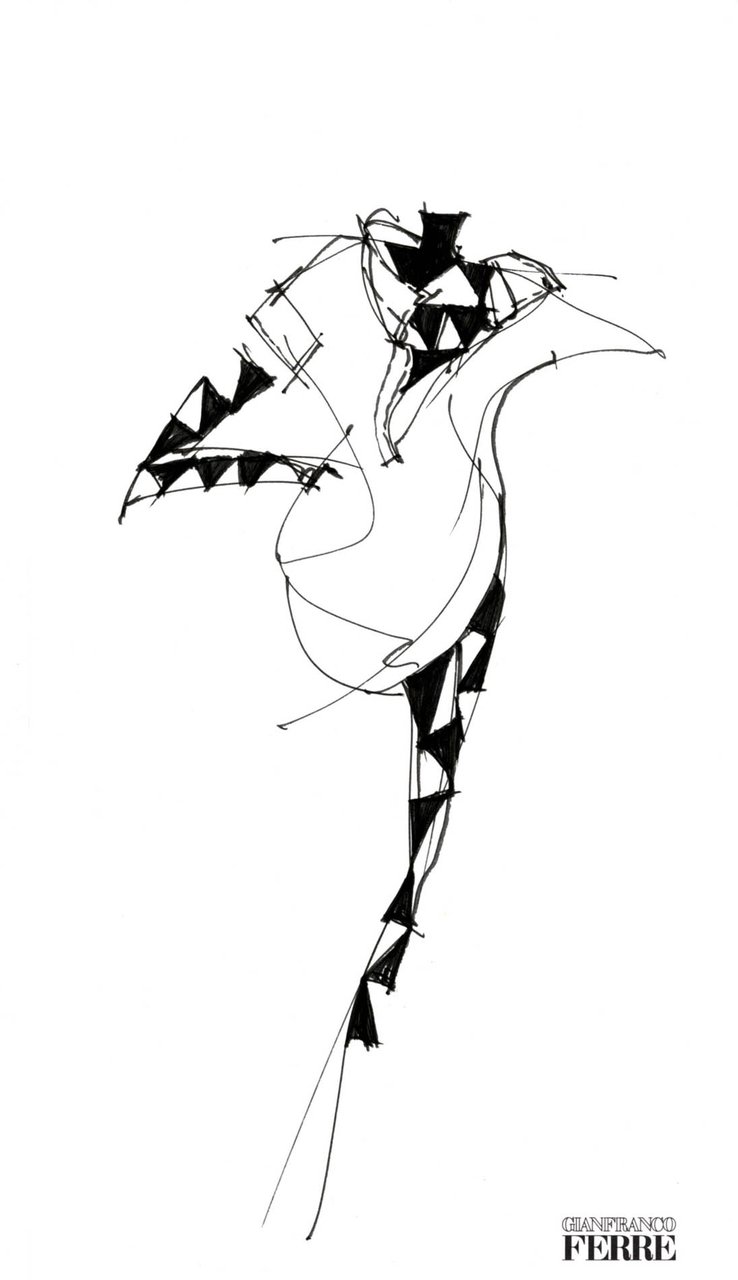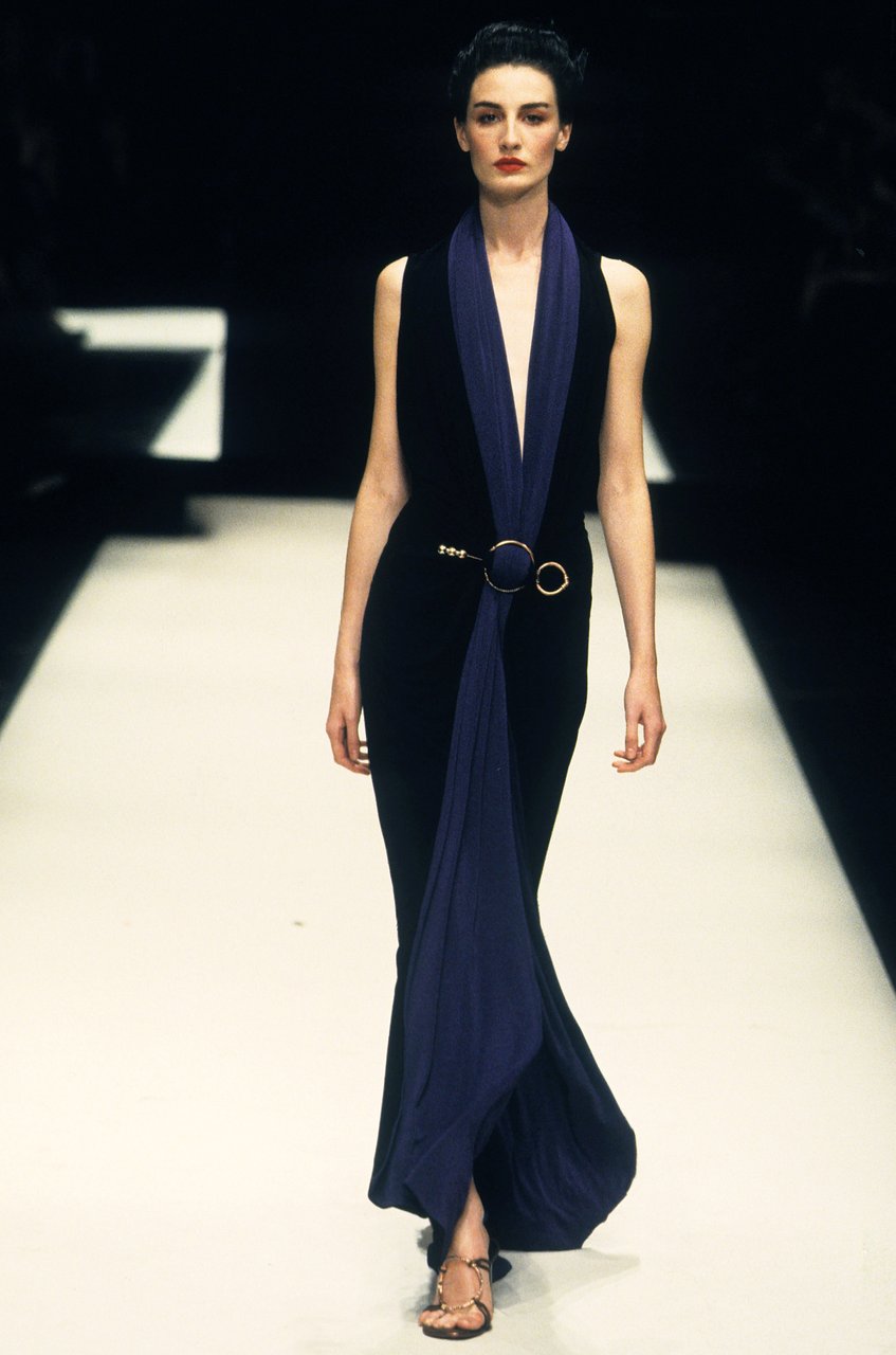 “Se penso all’Africa, vedo un album di fotografie scattate in bianco e nero e poi scannerizzate… profili e forme, sensuali perché elementari, provocanti perché nude, voluminose ed opulente ma composte di finti stracci che ho tradotto in nobilissimi materiali: gazaar di seta, shantung cangiante, doppio taffetas, quadrupla organza – perché tutto sia leggero ma al tempo stesso elaborato. I disegni hanno la forza di tatuaggi che sottolineano la figura, sono segnali di seduzione che si mischiano al body painting. I gioielli diventano vestiti, i vestiti sono gioielli che guarniscono il corpo, giungendo alle radici della linea e della decorazione. Con una magia che vibra di inusitate riflessioni”.