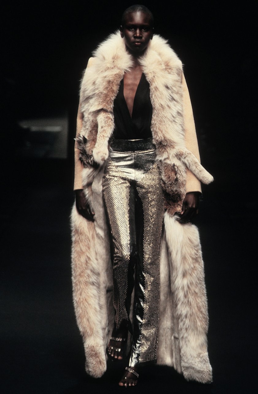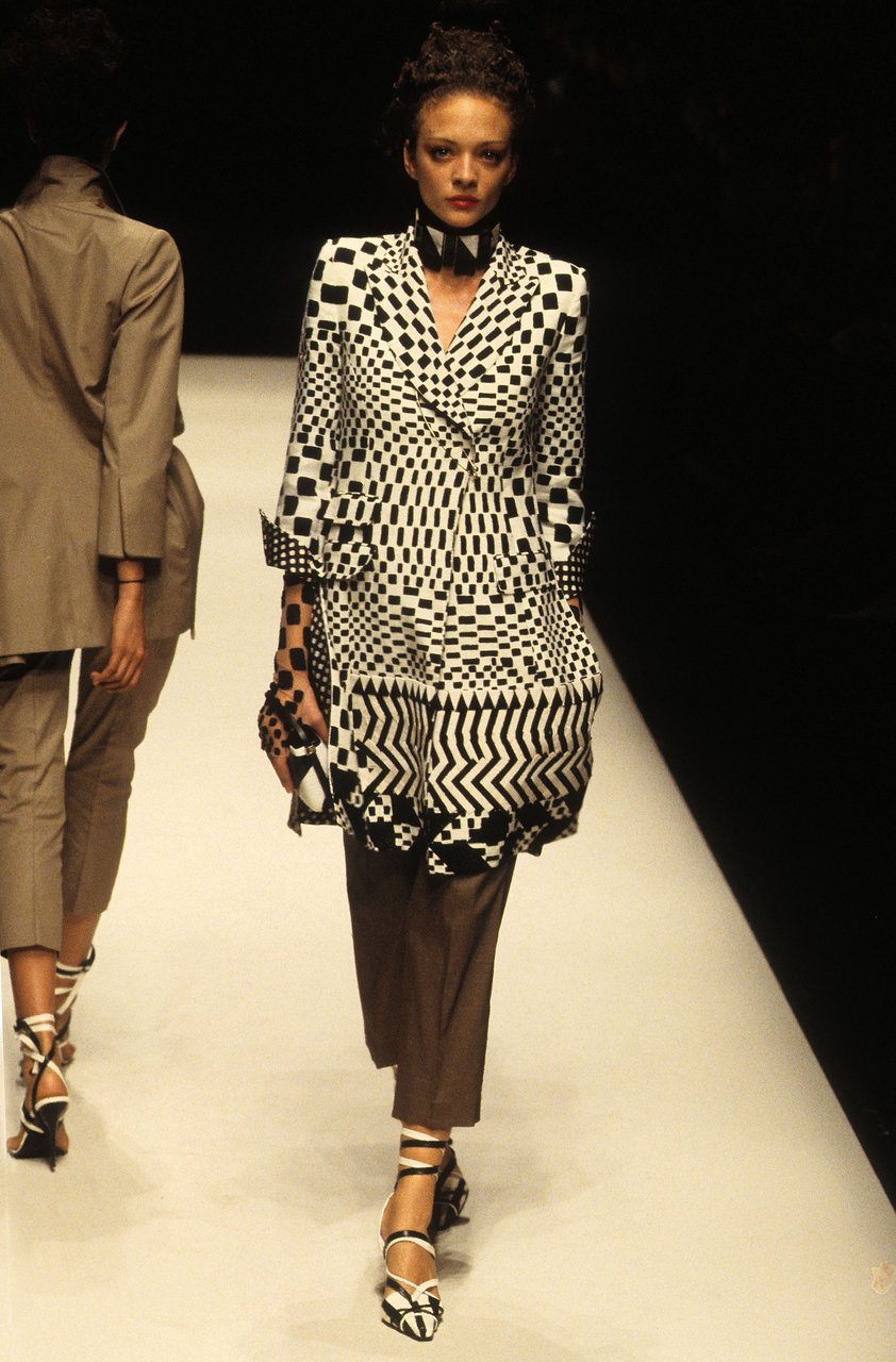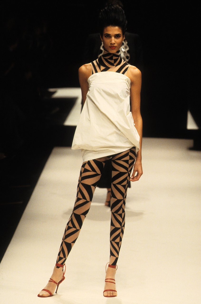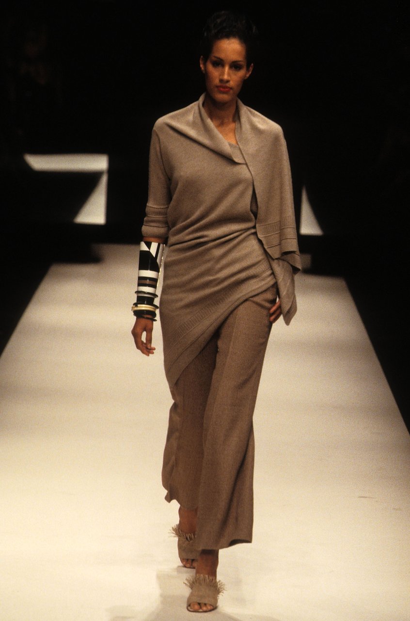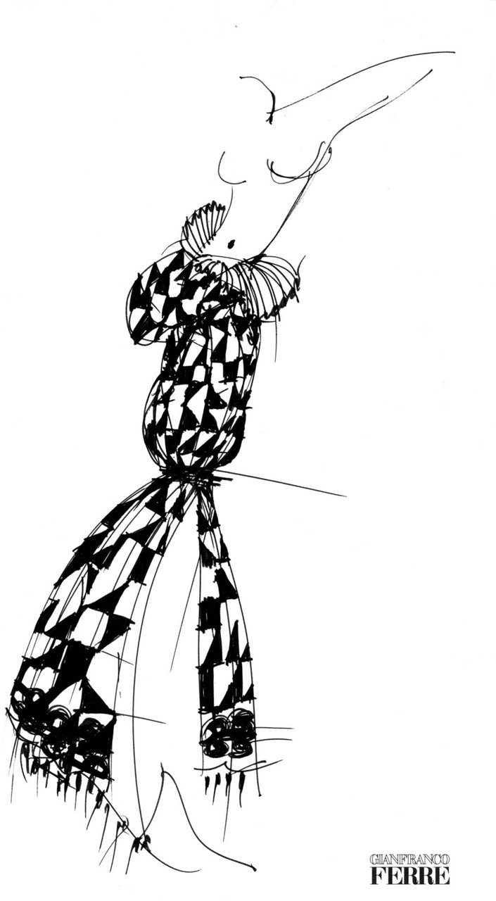 “Se penso all’Africa, vedo un album di fotografie scattate in bianco e nero e poi scannerizzate… profili e forme, sensuali perché elementari, provocanti perché nude, voluminose ed opulente ma composte di finti stracci che ho tradotto in nobilissimi materiali: gazaar di seta, shantung cangiante, doppio taffetas, quadrupla organza – perché tutto sia leggero ma al tempo stesso elaborato. I disegni hanno la forza di tatuaggi che sottolineano la figura, sono segnali di seduzione che si mischiano al body painting. I gioielli diventano vestiti, i vestiti sono gioielli che guarniscono il corpo, giungendo alle radici della linea e della decorazione. Con una magia che vibra di inusitate riflessioni”.