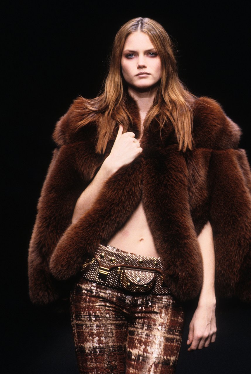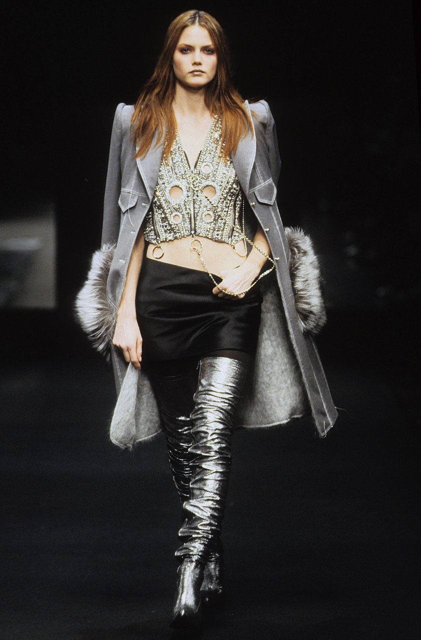 Per questo, è stata trattata come denim la rigorosa flanella, contraddicendola con interni, bordi, tasche trompe-l'œil in preziosa volpe argentata. Sono stati trasformati i jeans in magiche incrostazioni di broccato tartan e le gonne in soffici astucci di mohair. Sino ad esplodere nelle giacche di tweed plastificato spruzzate di cristalli iridescenti e nei cappotti con ricami metallici sui tessuti di broccato argenteo, alla Ziggy Stardust.