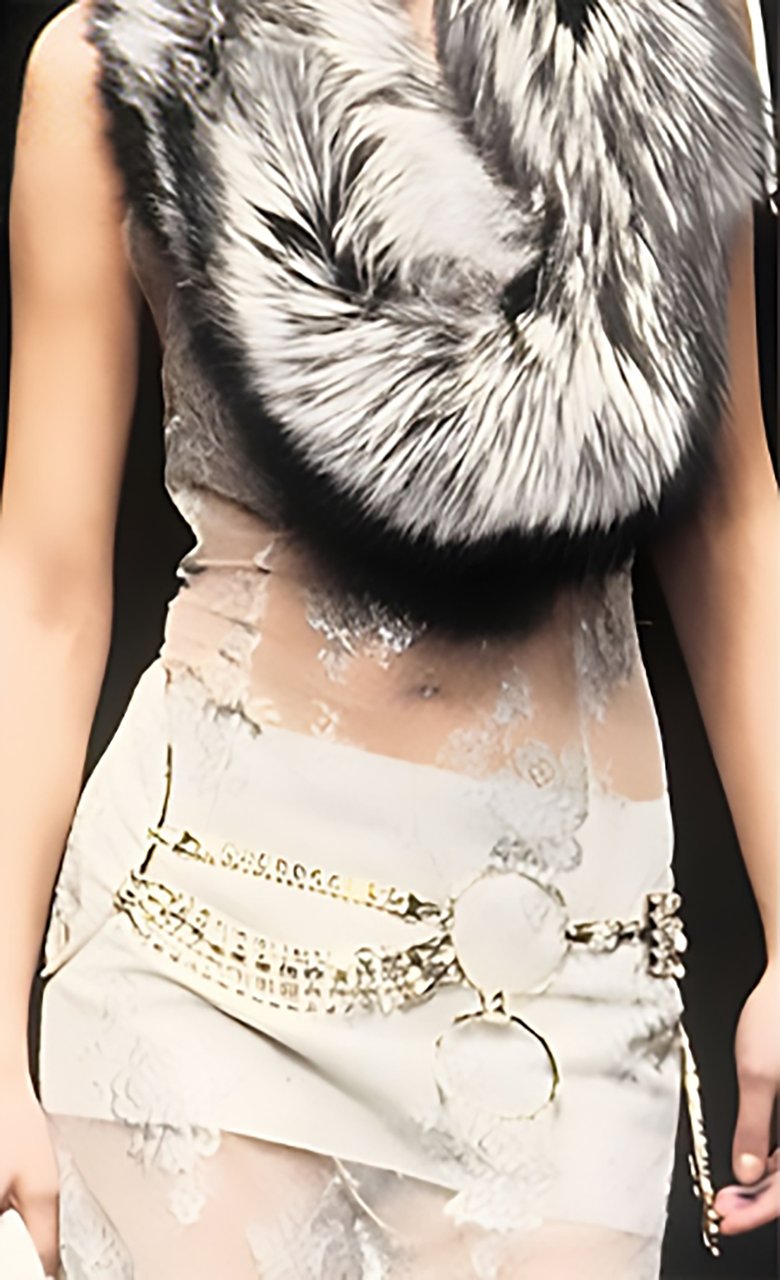 Per la sera – lieve, eterea, spumeggiante – abiti con code, come dire, naturali. Miriadi di strati sovrapposti, senza peso; gonne a spicchi di chiffon; top a bouquet formati da piccoli fazzoletti di organza cuciti fitti; intarsi che sembrano in pelo di scimmia e invece nascono dall'incrocio del lapin con la kidassia. Mix dinamizzanti con la pelle, con le borchie, con gli stivali cuissard in raso o fustagno stretch, quasi un tutt’uno con il vestito, che inguainano la gamba come una calza e la slanciano incredibilmente.