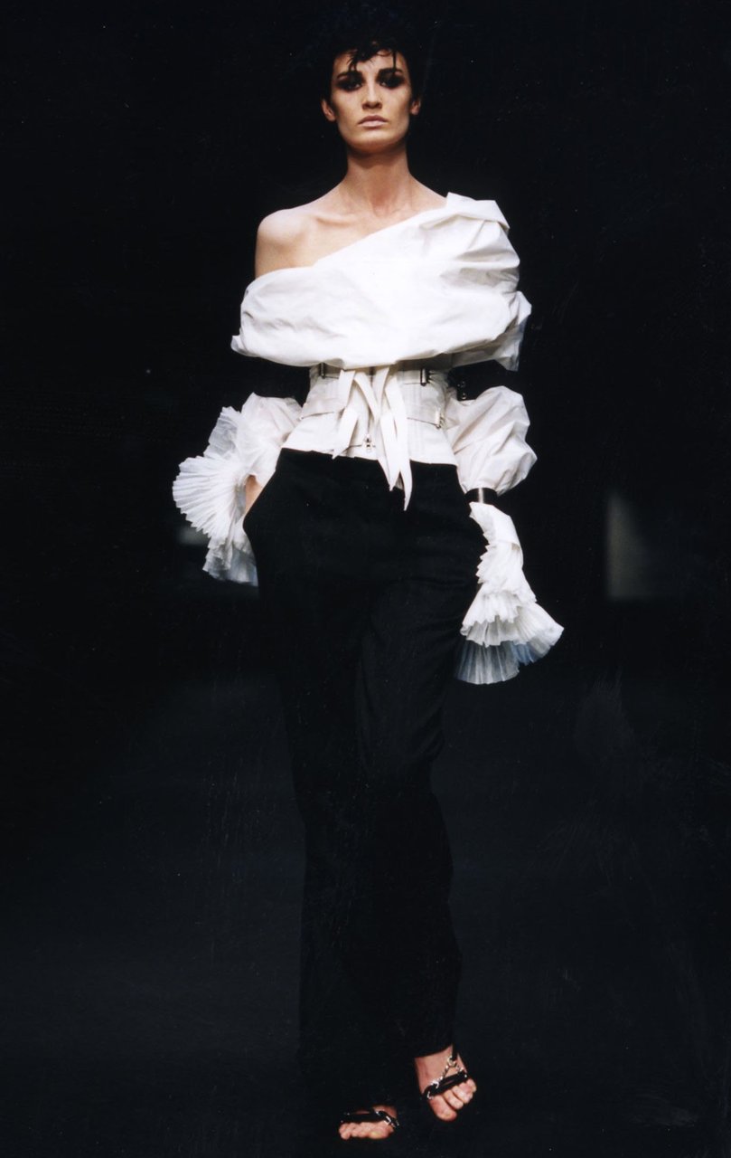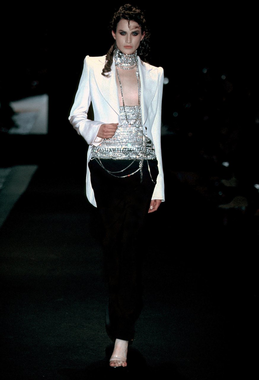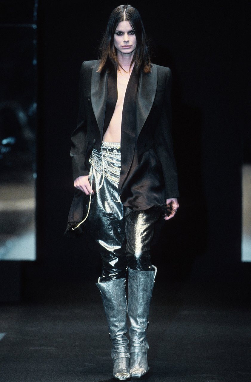 “C’è il senso del classico, ma con il gusto dell’azzardo e di un tempo della vita accelerato. C’è la definizione di una nuova opulenza che non si esprime in ricami preziosi, ma nel contrasto dei materiali arditi e nella sublimazione di quelli tecnologici. C’è la mescolanza voluta tra maschile e iperfemminile, una miscela ribelle e splendente che mi riporta agli anni d’oro del rock: David Bowie, Mick Jagger, Iggy Pop. Alla grande tradizione del vestire inglese, con marsine, dinner jacket, cappotti da postiglione, sconvolta da tessuti lucidi, materiali strani, stoffe contraddittorie... un senso lussuoso di stravaganza affiora anche dove i capi sembrano avere l’origine più tradizionale”.