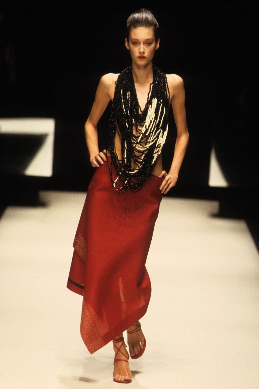 Cascate di collane di corallo coprono il seno e scendono sino a formare un microvestito, oppure si intrecciano con stringhe di cuoio. Pietre e coralli disegnano gioielli incorporati ai vestiti con i ricami-filigrana sul tulle nero. Ancora coralli, ma a frammenti, e perline nere reinventano il tweed per una maglietta trompe-l’oeil – seconda pelle. La paglia lavorata si colora di rosso. L’oro si mescola al rosso per dare più nobiltà al colore. Ritornano, insistenti, il bianco – calce, gesso, guscio d’uovo – e il nero che, ancora con il bianco, traccia prints corporali, disegni scaramantici, etno-tattoos. Splende il madras di seta del Madagascar, burgundy, blu notte, oro antico.