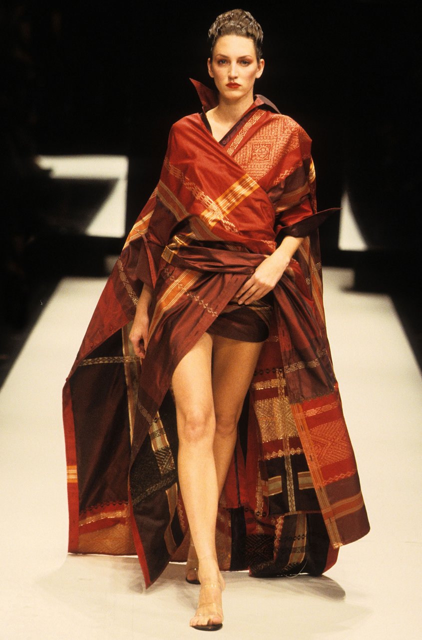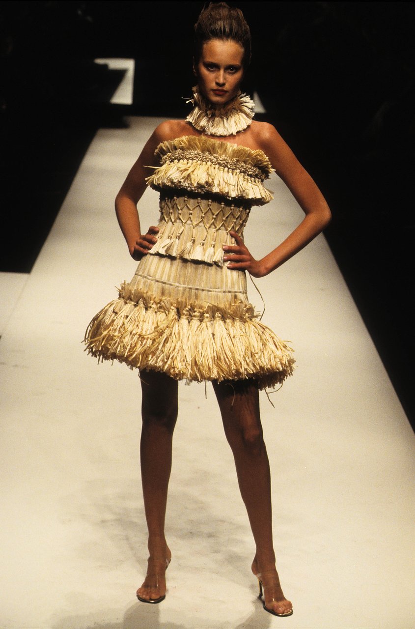 In modo sontuoso e primitivo, purissimo ed eccentrico, le gonne di shantung sembrano coni alla liquirizia su cui arricciature strategiche creano una serie di balze. Pezzi di ricami a gros-grain, corposi e uniti tutti insieme, si trasformano in abiti sorprendenti. Mixage eccentrici di stili, tocchi sublimi di eleganza tribale: lo spolverino di juta e seta con le scarpe di pitone intrecciato dal tacco dipinto a mano, la giacca couture in pied-de-poule di seta sulla gonna a rete sfrangiata e ricoperta di coralli, il tailleur impeccabile con le maniche ballon.