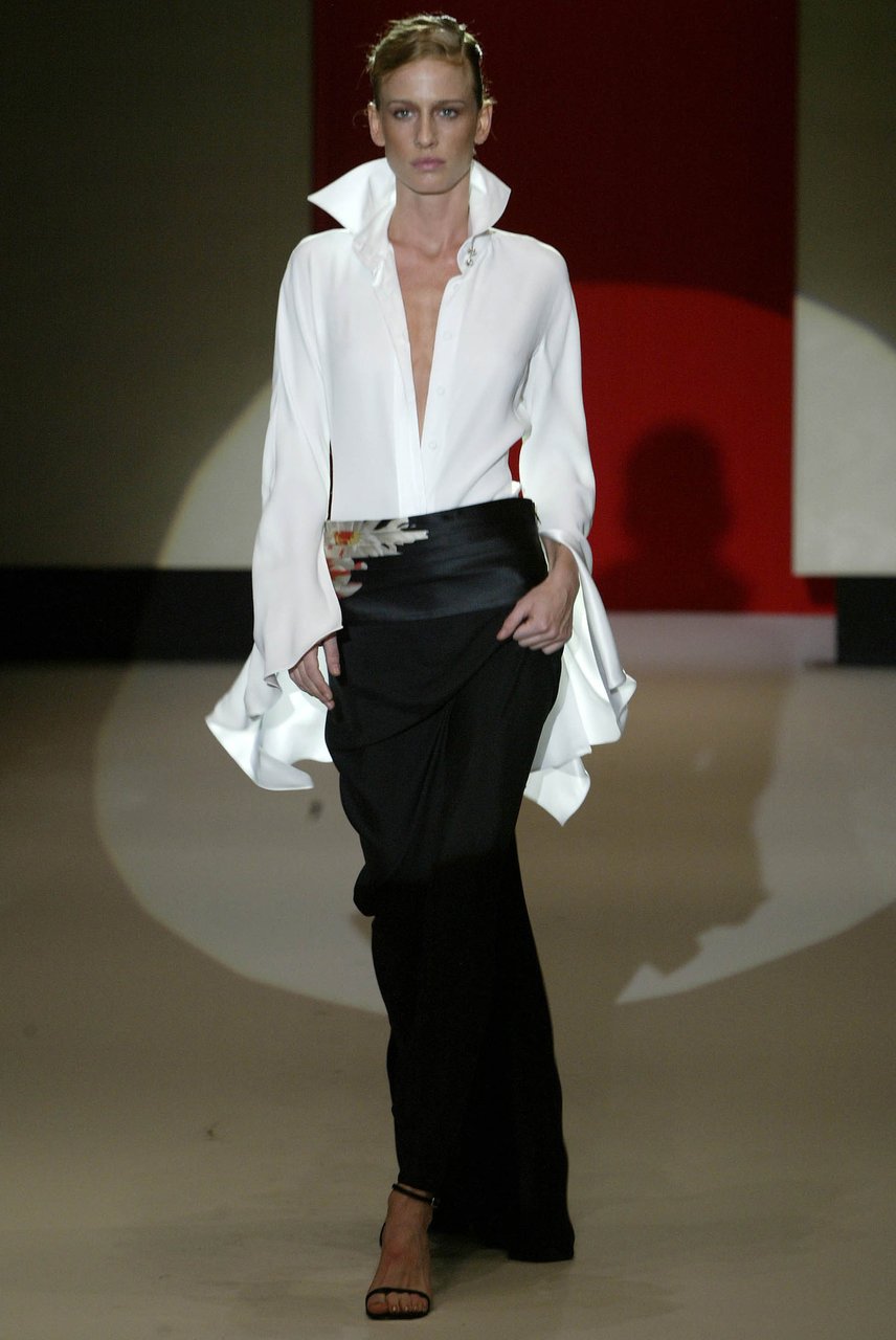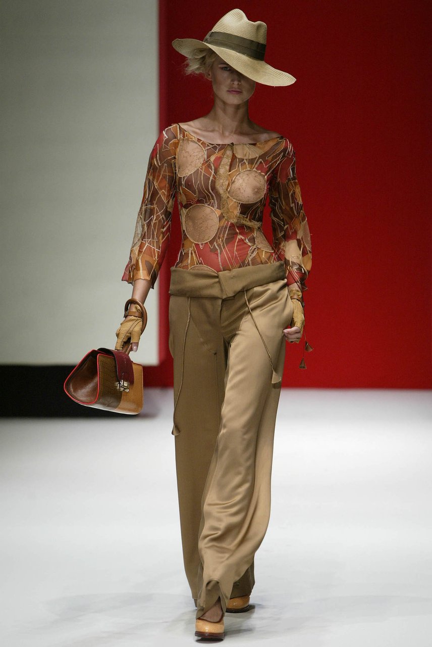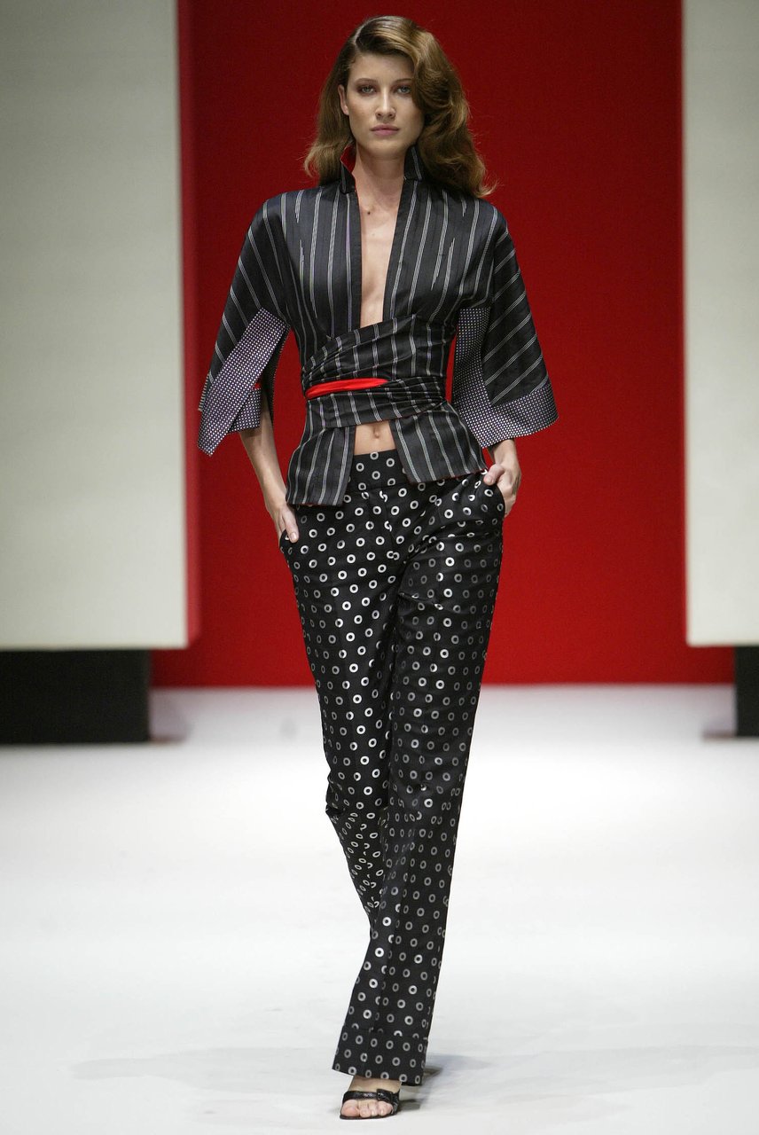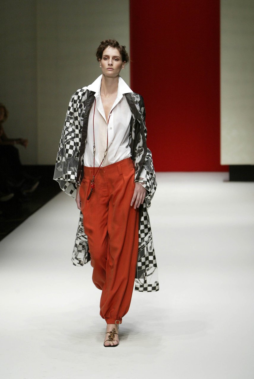 Il risultato di questo stravagante percorso è una trasposizione libera e gioiosa di certi principi di severità e di rigore che fanno pensare proprio all’Oriente. Con una volontà di eleganza, ammorbidita e sinuosa la silhouette, scivolate e fluide le forme. Sono stati privilegiati per questo i tessuti più duttili e sciolti, come la georgette ed il satin. Ma senza rinunciare alla perfezione della struttura, all’importanza dell’aplomb, che individua nella spalla il punto-chiave naturale e consente al capo di cadere con facilità. Anche per i colori ho giocato tra compostezza e slancio, opponendo combinazioni “cool” di bianco e nero a modulazioni vitali di terracotta, giallo, arancio, ai vari blend di marrone che definiscono le differenti qualità di pelle - dal camoscio, alla nappa, al marabù – dall’apparenza un po' invecchiata, consumata, vissuta.