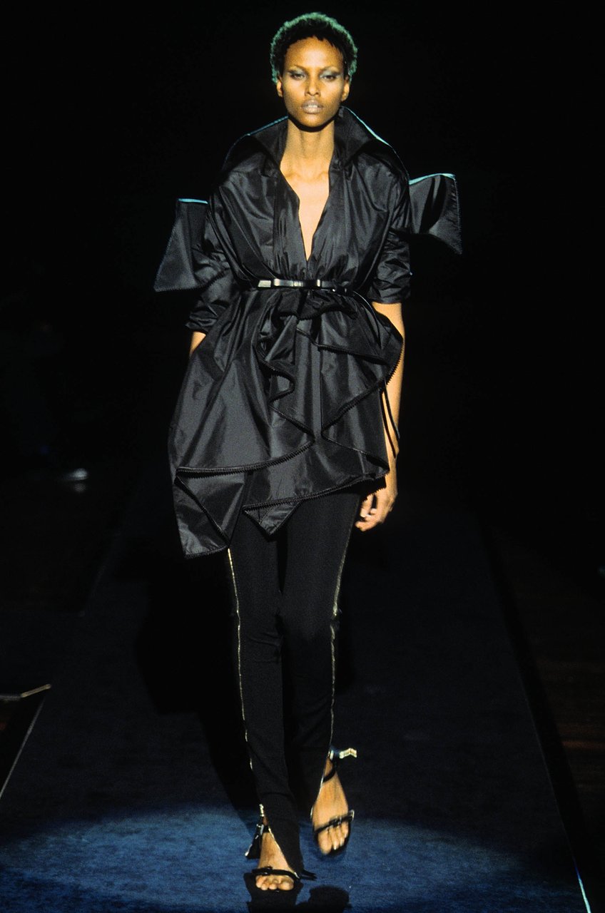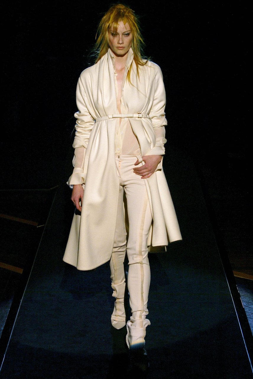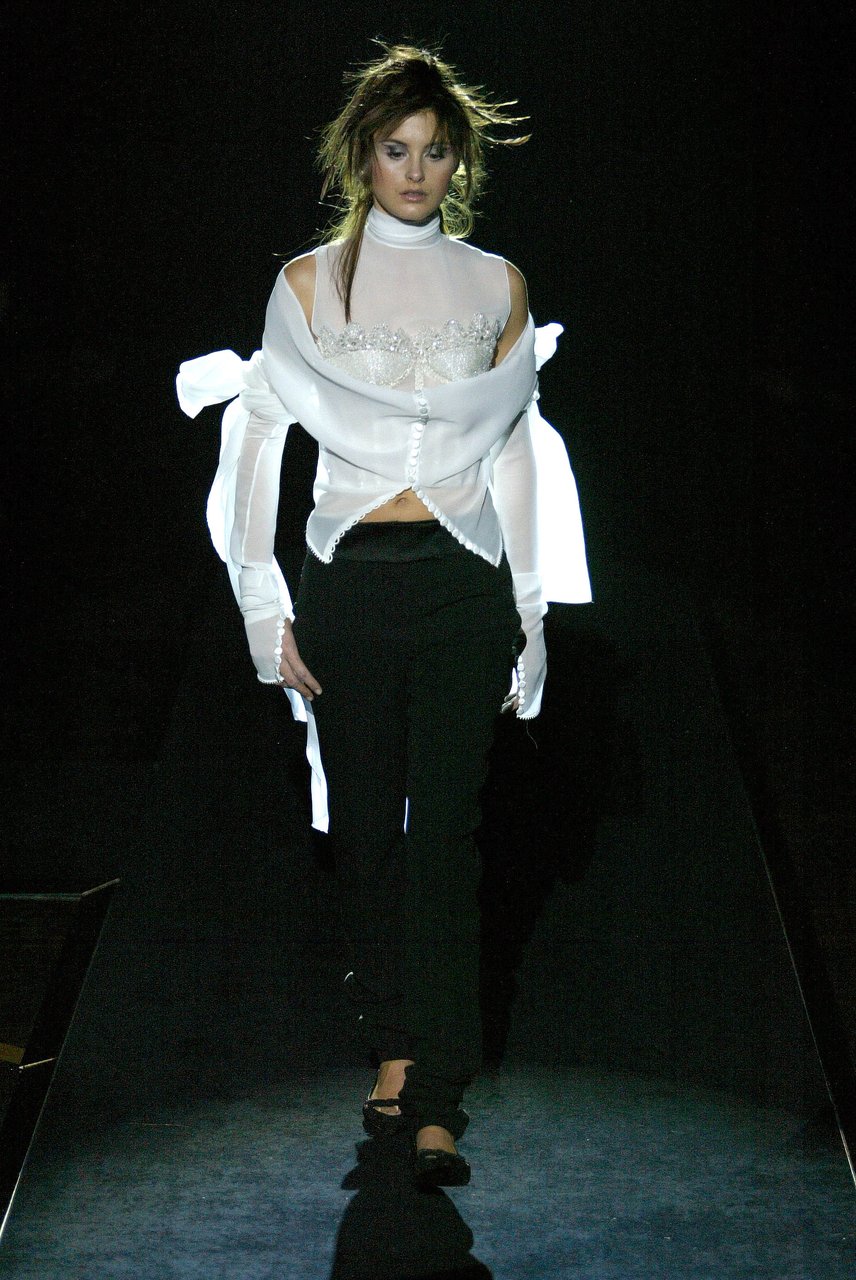 “Armonia degli opposti. Un desiderio di grazia e di fierezza insieme, di semplificazione e di enfasi percorre questa collezione, che si dipana come una storia di magiche fogge. Dimensioni ridotte, linee assottigliate, vita innalzata appena sotto il seno generano un’impressione di scioltezza e fluidità, che dà risalto a volumi intenzionalmente accresciuti. Mi sono lasciato conquistare da un gioco di costruzione e decostruzione delle forme, che è anche un gioco con la storia, con un’epoca che ritengo mirabile, perché ha visto i canoni dell’eleganza cambiare e diventare moderni. Quindi, con un’intenzione assoluta di modernità, ho esplorato certi segni estetici del Direttorio e del primo Napoleone”.