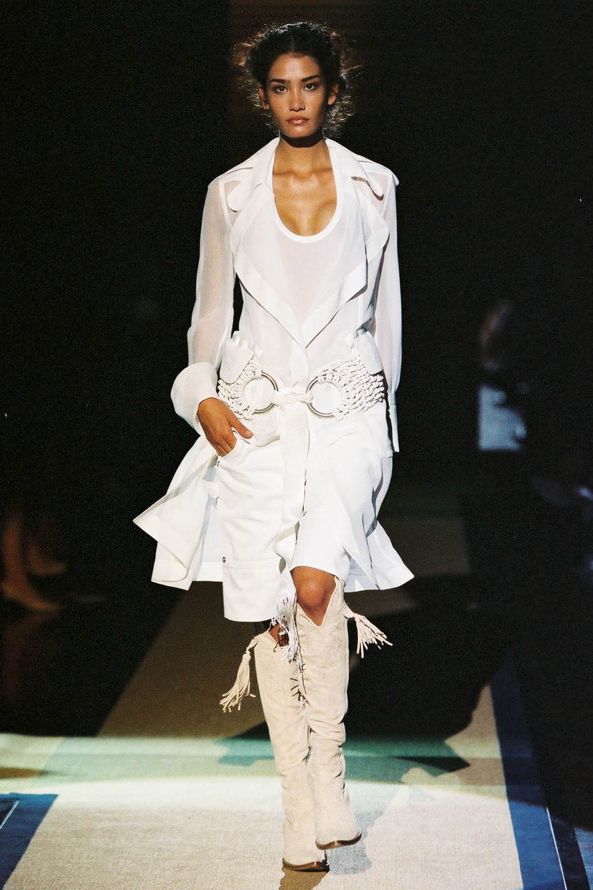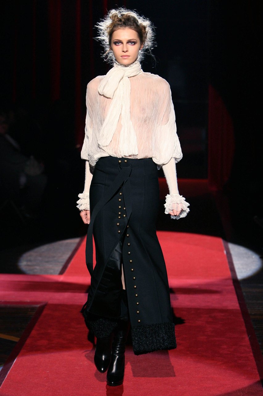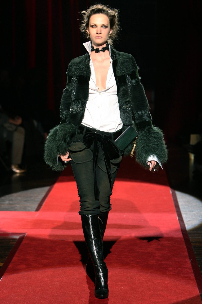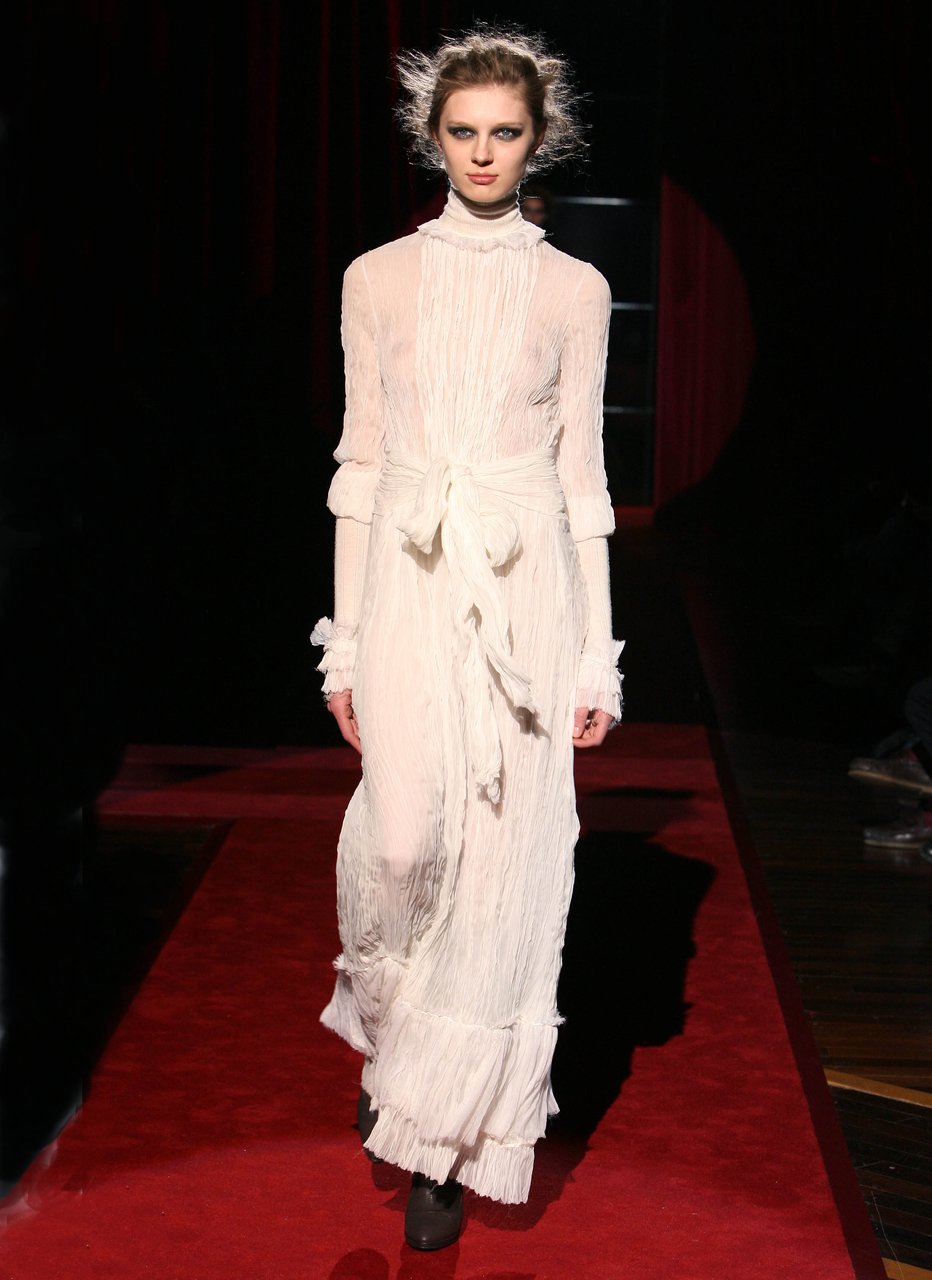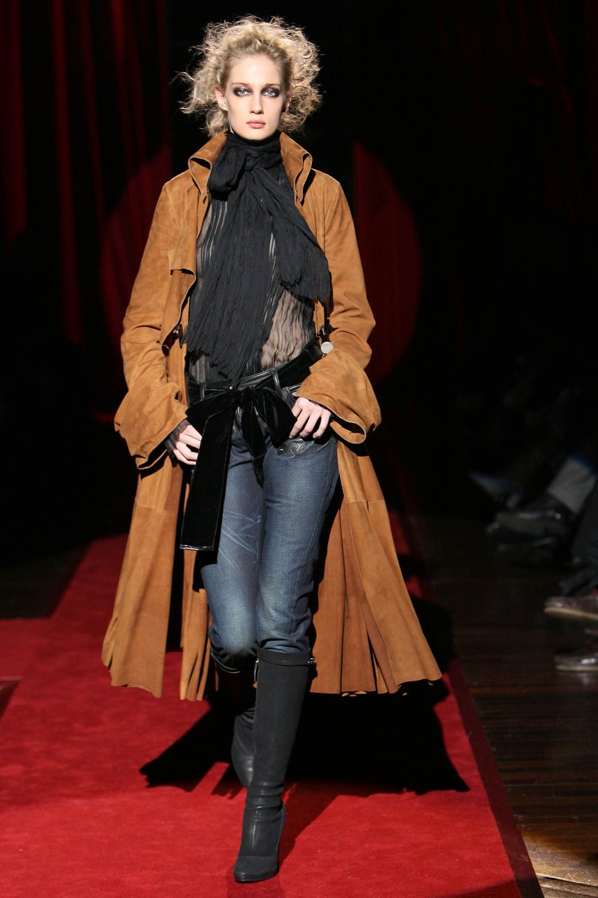 Rimandi tra naturalezze corpose e prodigi alchemici governano le scansioni materiche. La lana rivela le sue mille, versatili anime: dalla gabardine ai diagonali, dal faille doppio alla tela stretch, dal satin al crêpe bielastico. Stropicciato a bastone, lo chiffon disegna camicie, color avorio o inchiostro, che paiono capi d’antan riportati ad un nuovo appeal. Il cavallino oppure il cotone doppiato in duchesse di seta costruiscono i giacchini a spencer, da cadetto. I velluti da arredamento sono lavati, il visone dei trench e dei cappotti è lavato e bottalato, assumendo l’aspetto e la consistenza della ciniglia invecchiata.