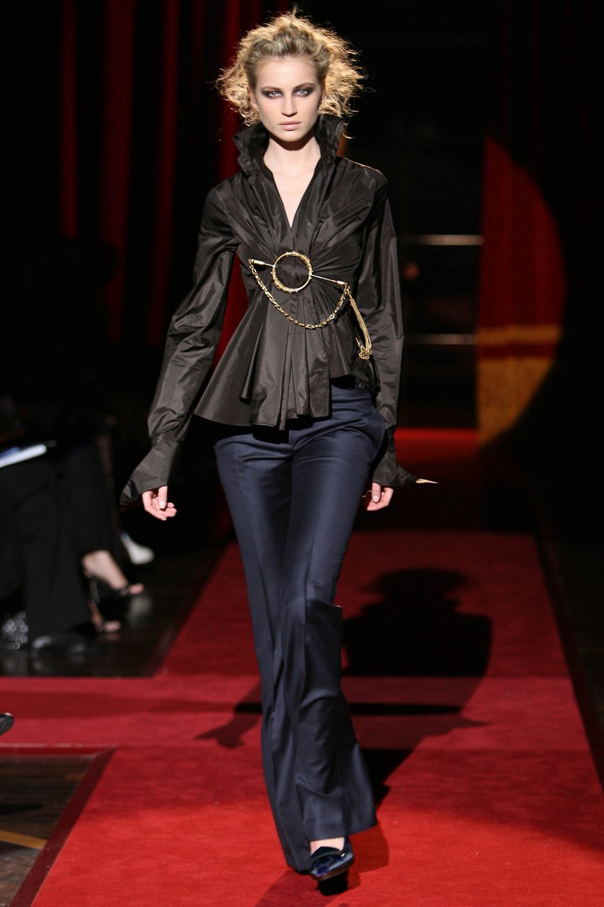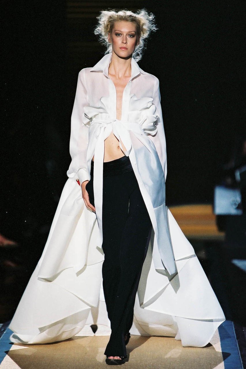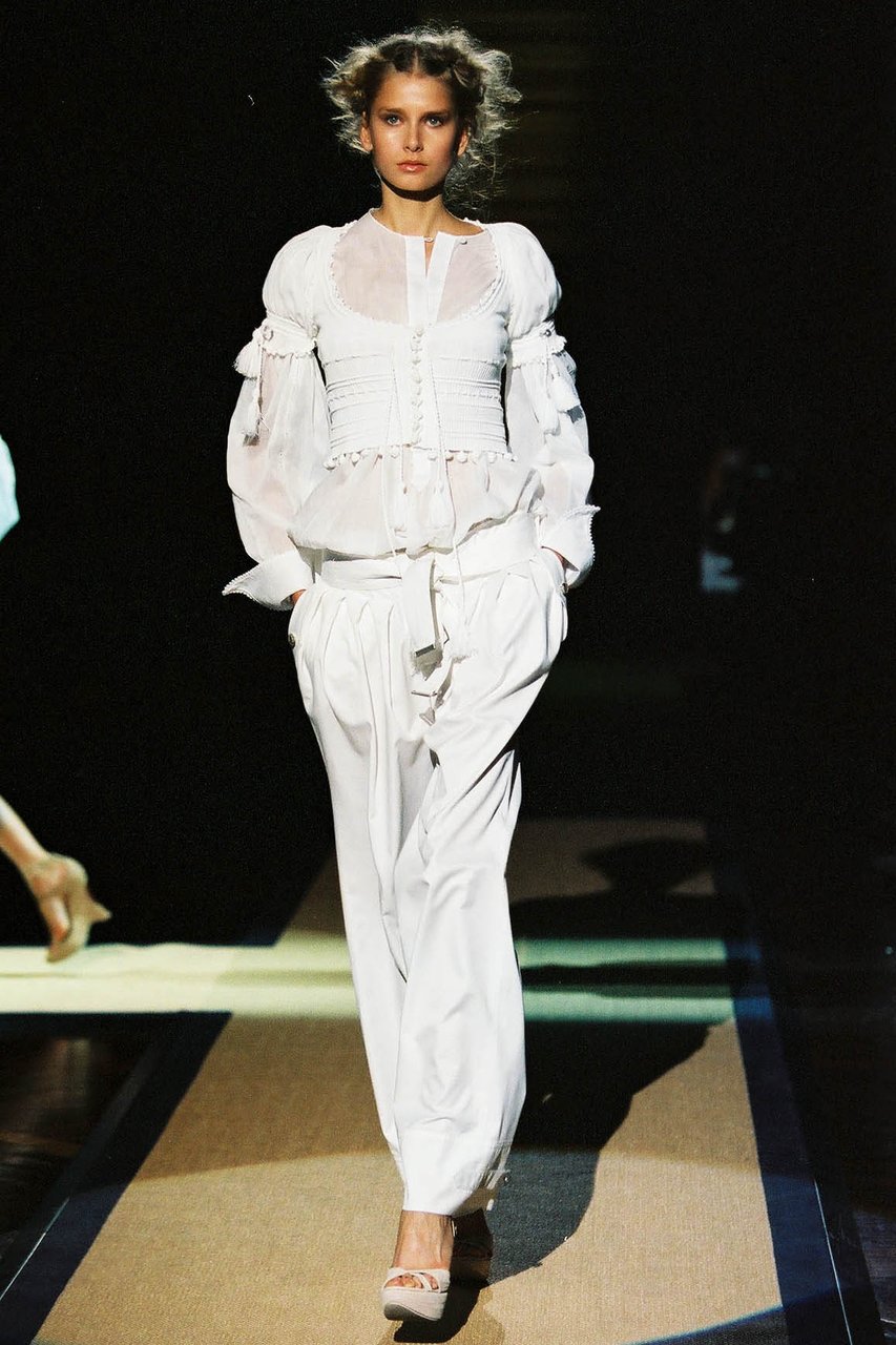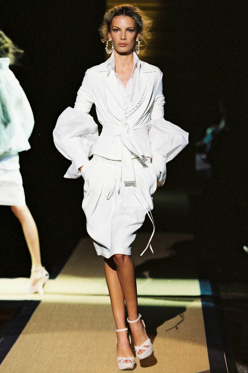 “Riflettendo sui corsi e i ricorsi che governano la storia, mi ha colpito come ogni principio di secolo porti con sé un impulso singolare a ridefinire e, per così dire, a ripulire linee e fogge del vestire. Sviluppando questa intenzione, che in verità è un elemento costitutivo del mio progetto di stile, in questa collezione ho voluto porre un accento ancora più marcato sulla precisione e sulla purezza quasi geometrica delle forme e delle costruzioni. Perseguendo un ideale di perfezione e di distinzione che giunge a suggerire persino impressioni di regalità, severa ed aggraziata insieme, vibrante di contemporaneità”.