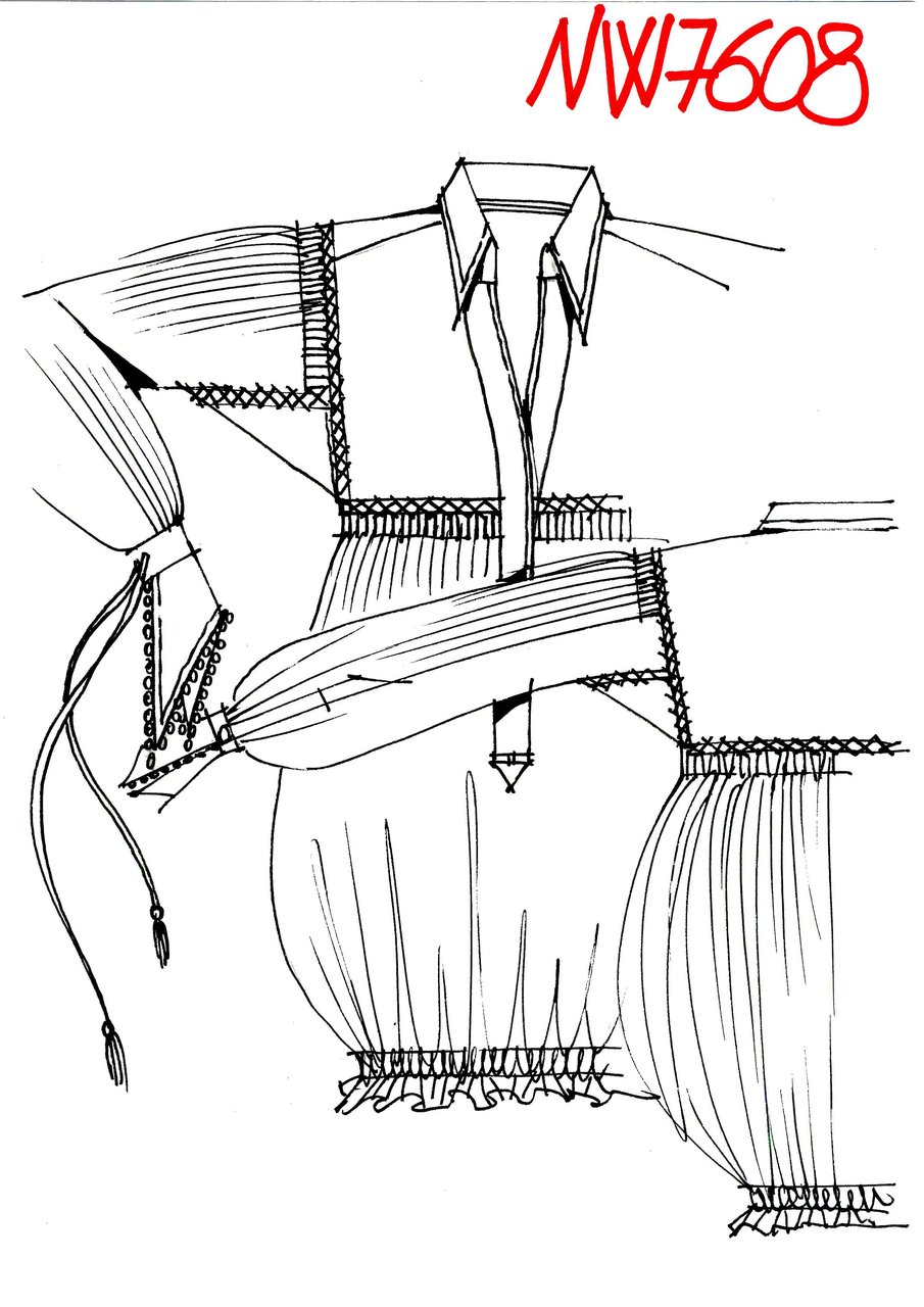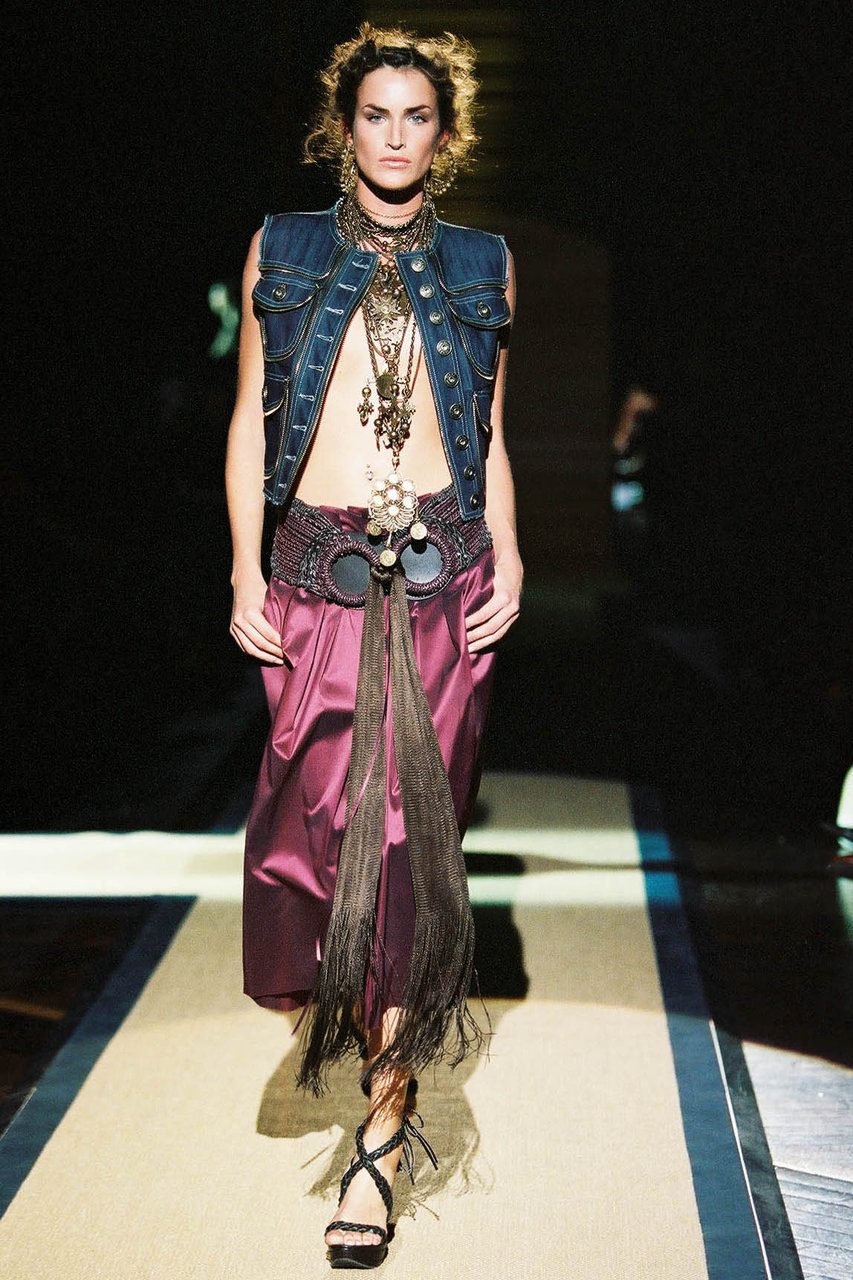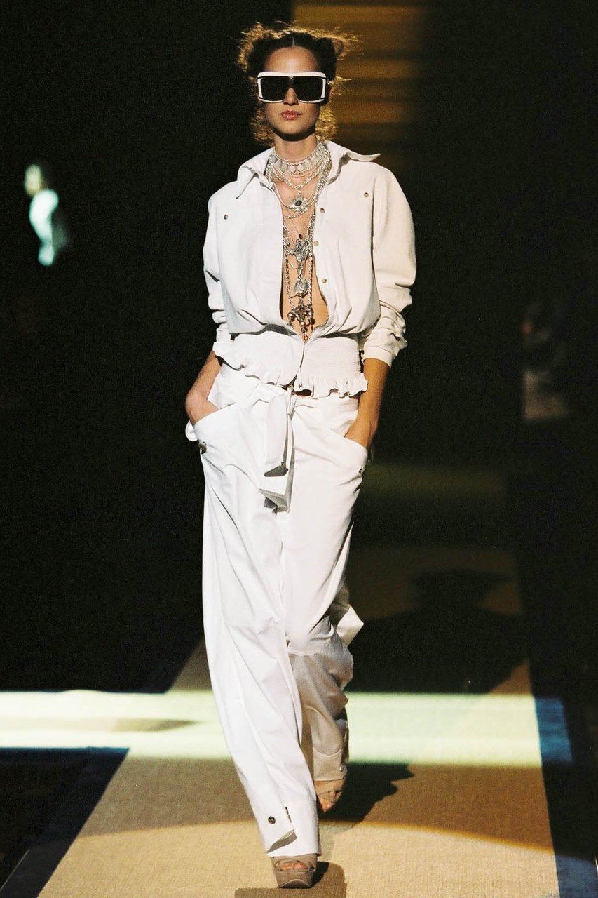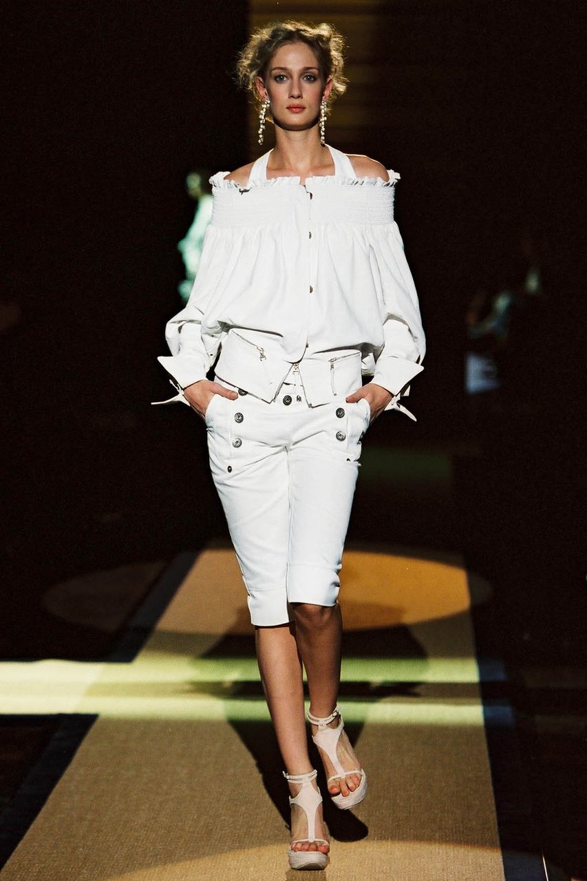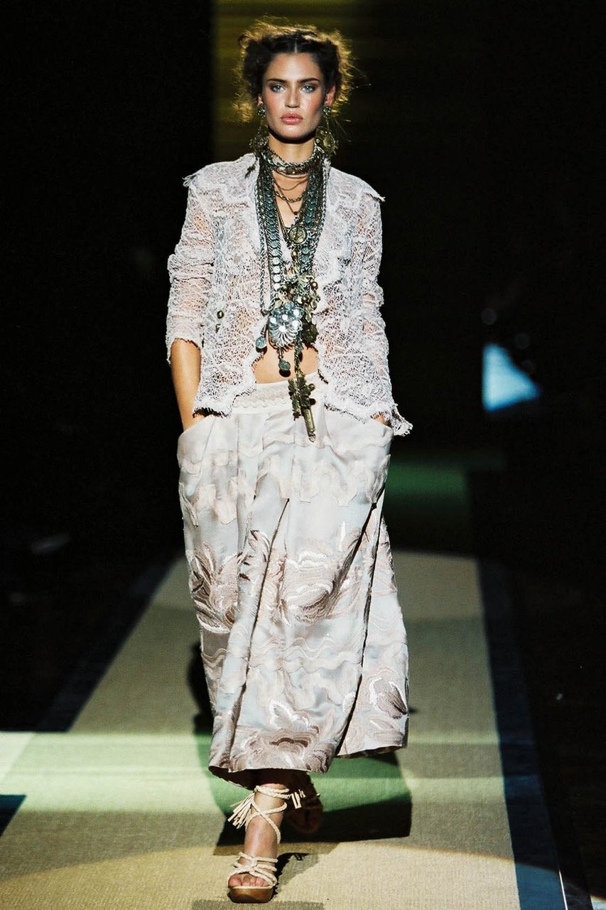 La leggerezza è, innanzitutto, quella delle materie dell’estate, il voile di cotone e la georgette in particolare. Persino la pelle dei giubbini in bufalo e in cervo diventa alchemicamente duttile e morbida, acquistando una consistenza simile a quella del popeline. Tutto è lieve, anche quando sulle superfici risaltano pizzi e ricami preziosi, accanto a una serie infinita di lavorazioni minuziose nei motivi a filet, a punto pieno, ad ajour, a crochet, a macramé doppio, a trafori floreali, non di rado assemblati a patchwork nelle giacche e nei pullover.