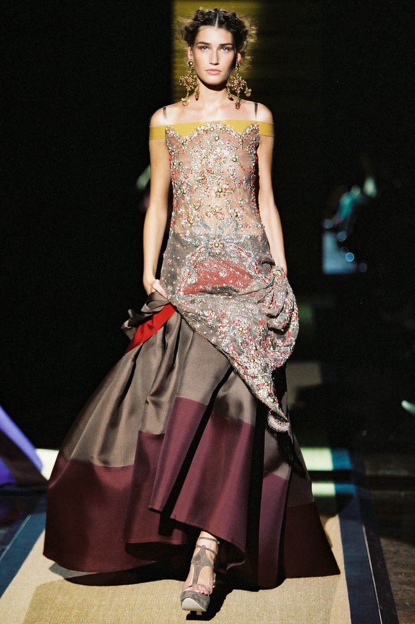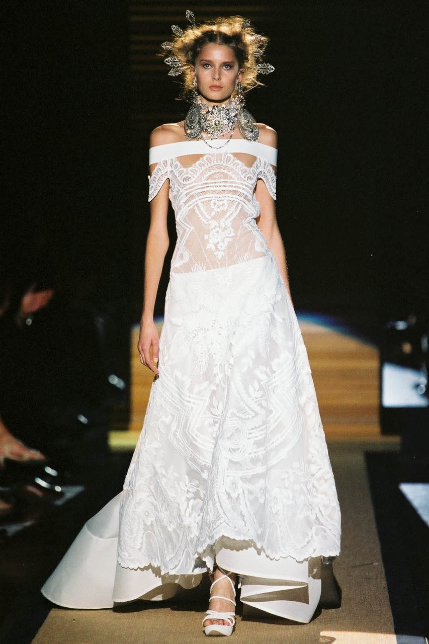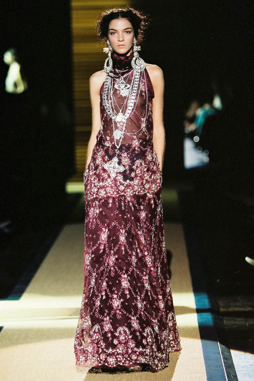 “Il candore, la leggerezza, un tocco di frivolezza, consapevole e dunque composta: mi risulta facile, quasi spontaneo, sintetizzare in queste parole le emozioni che percorrono questa collezione. Sono questi i segni distintivi della femminilità che ho voluto raccontare, gioiosa e solare, eppure sobria e aggraziata. Una femminilità appassionata e riservata, che fa pensare alle donne latino-americane. La frivolezza, in verità, è tripudio, vivacità, magia. È l’opulenza incantata che ho voluto esplodesse soprattutto di sera. Nei pizzi dorati e nelle cascate di catene tintinnanti e risplendenti, che richiamano alla mente i gioielli sacri della Virgen de Guadalupe”.