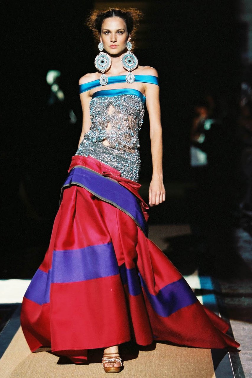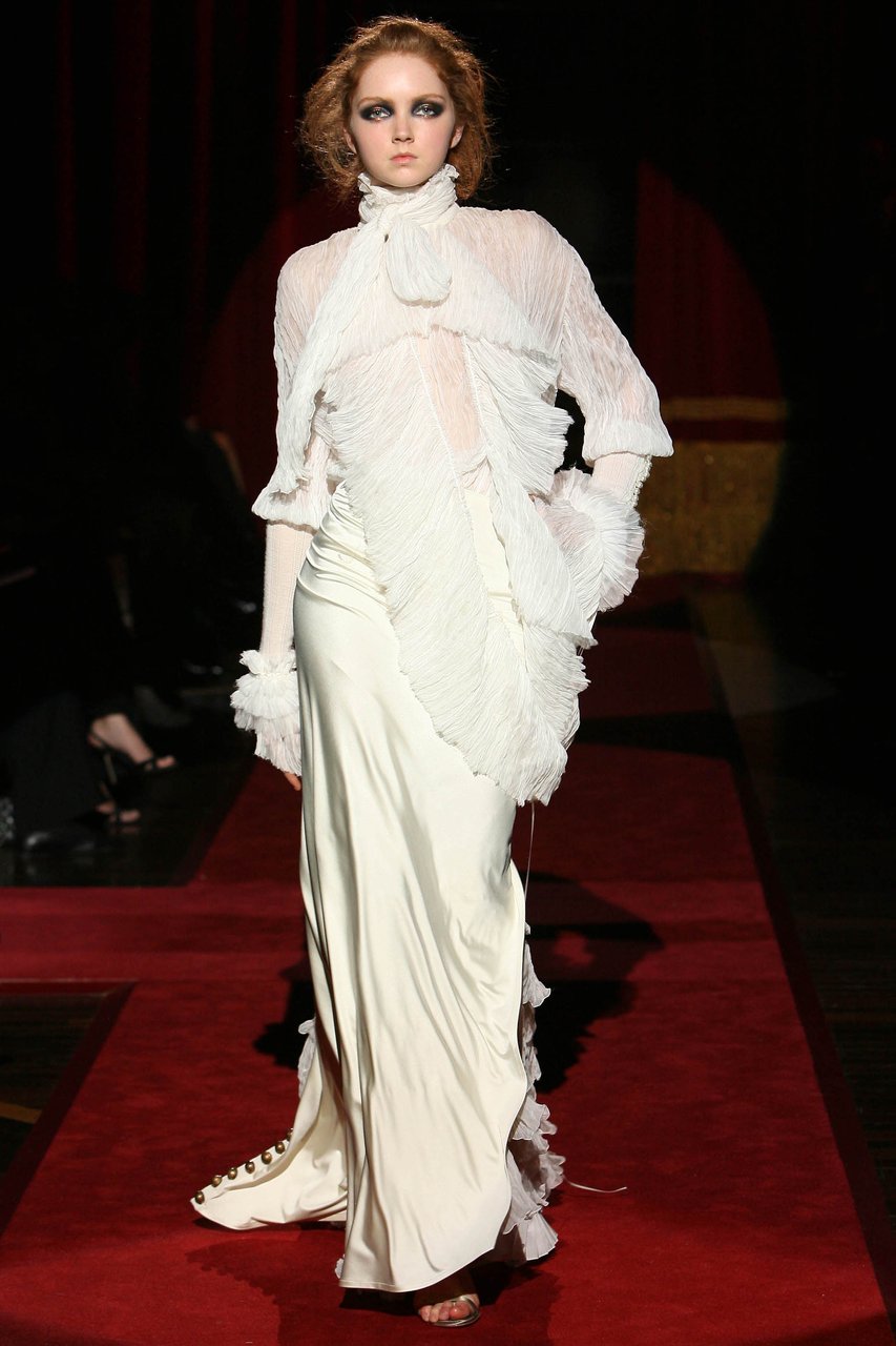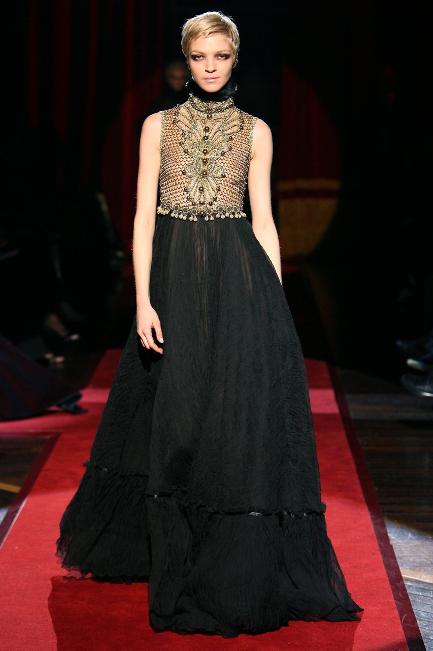 “Il candore, la leggerezza, un tocco di frivolezza, consapevole e dunque composta: mi risulta facile, quasi spontaneo, sintetizzare in queste parole le emozioni che percorrono questa collezione. Sono questi i segni distintivi della femminilità che ho voluto raccontare, gioiosa e solare, eppure sobria e aggraziata. Una femminilità appassionata e riservata, che fa pensare alle donne latino-americane. La frivolezza, in verità, è tripudio, vivacità, magia. È l’opulenza incantata che ho voluto esplodesse soprattutto di sera. Nei pizzi dorati e nelle cascate di catene tintinnanti e risplendenti, che richiamano alla mente i gioielli sacri della Virgen de Guadalupe”.