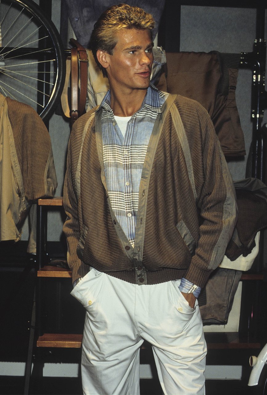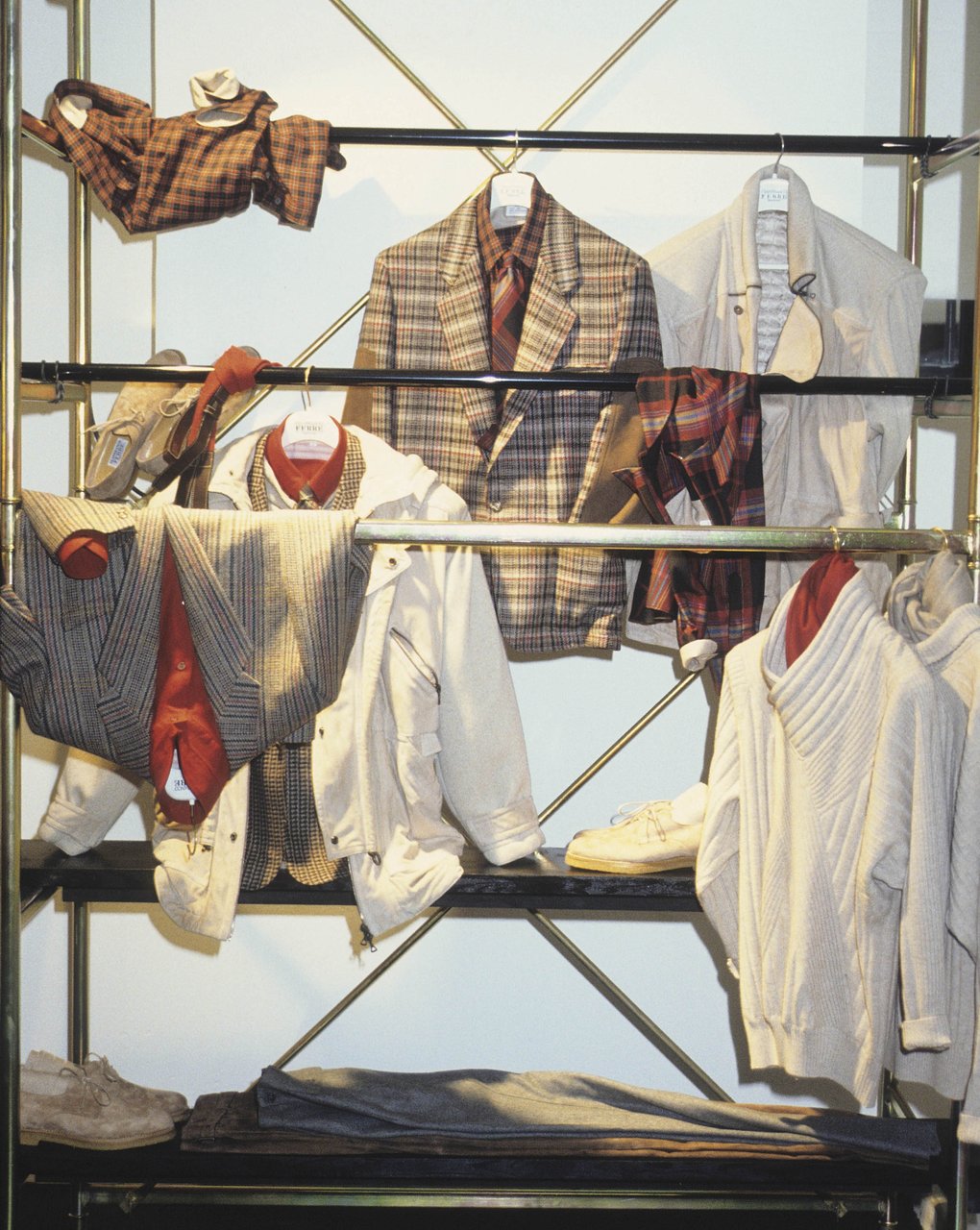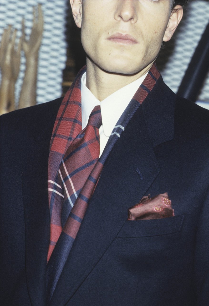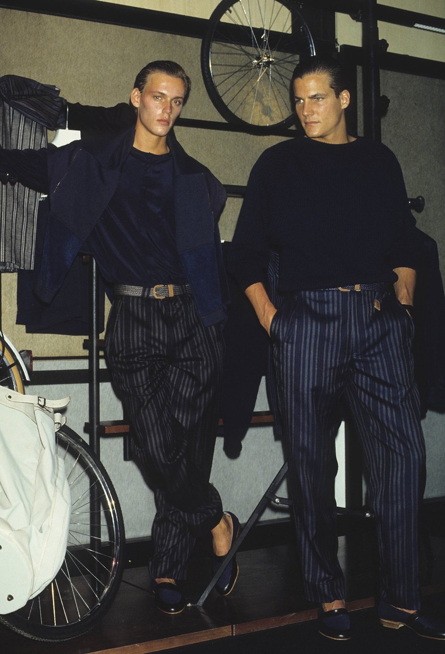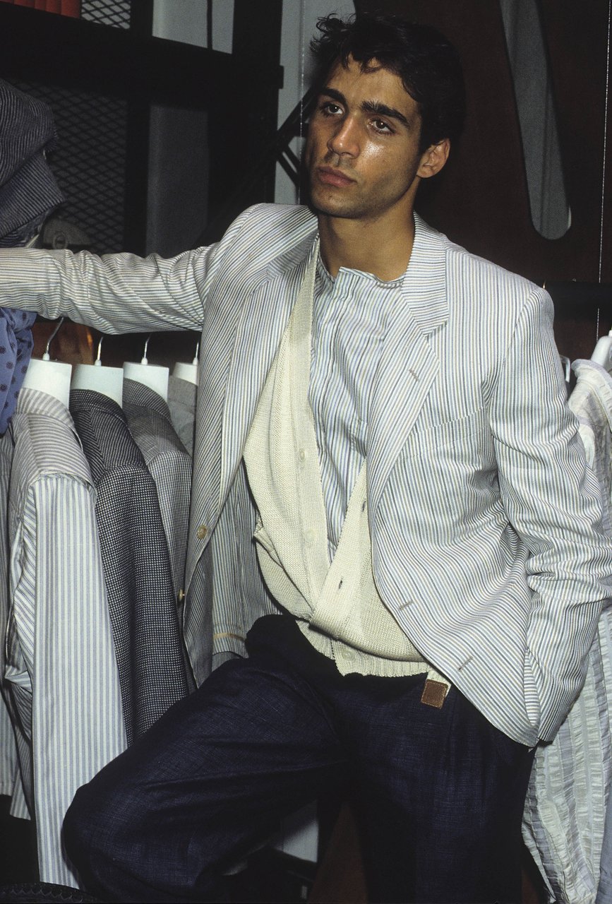 Re-interpretare il tessuto. Crêpe di lana doppio (per giacche sfoderate e impalpabili). Piquet di lana, grisaglia scattante di lino e lana. Shantung di lana. Madras di seta e lino. Righe liftier in seta (le sfumature si intridono, si impastano, si frantumano). Effetti di grisaglie inglesi a trama aerata. Seersucker, gabardine di cotone rigato leggerissimo (ma per i pantaloni). Intercambiabilità tra i tessuti dei completi e degli spezzati.