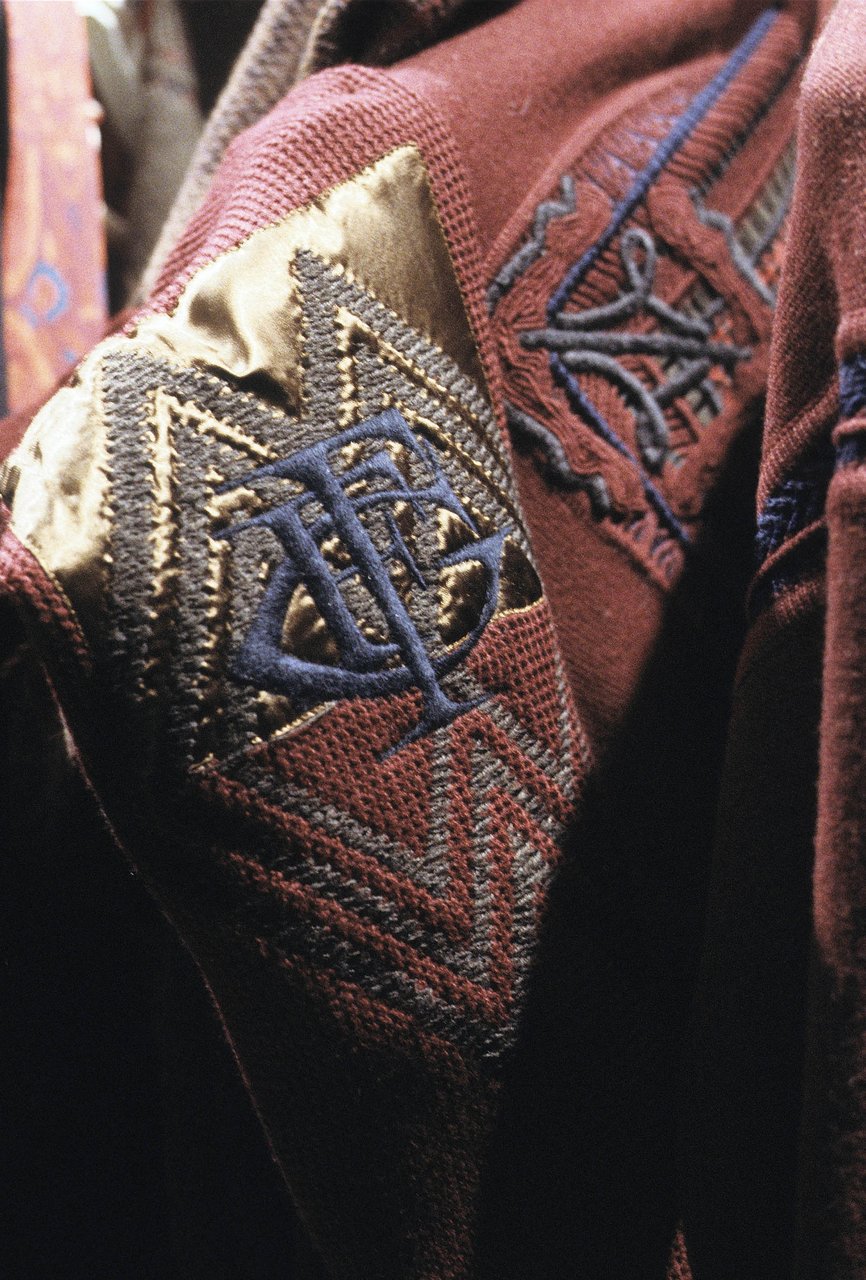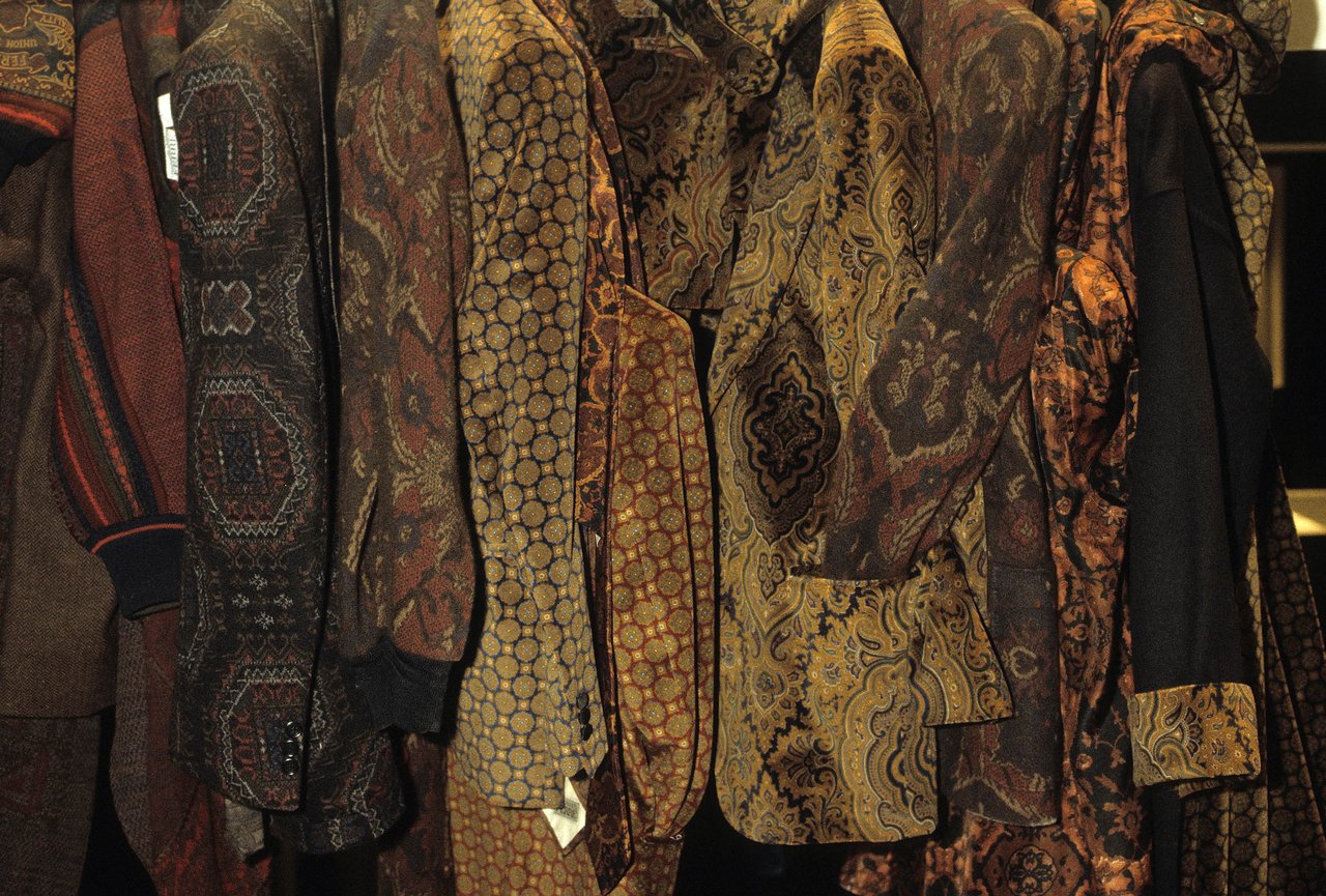 Mescolando note impreviste. Allusioni all’Anatolia e ai tappeti persiani nel tricot fuso e mescolato; nel patchwork dai toni rugginosi, come vecchi bauli, kilim arrotolati da generazioni, rilegature antiche di libri. Rigore nostalgico delle camicie da sera di voile. O di crêpe di seta davanti e cotone sulla schiena. O di crêpe de chine plissettato, sostenuto (dietro) dalla vyella.