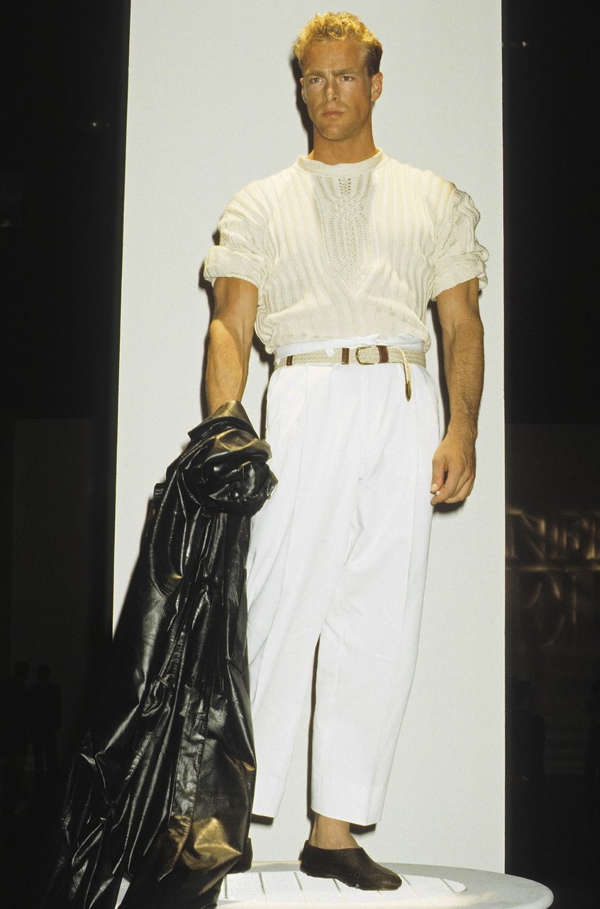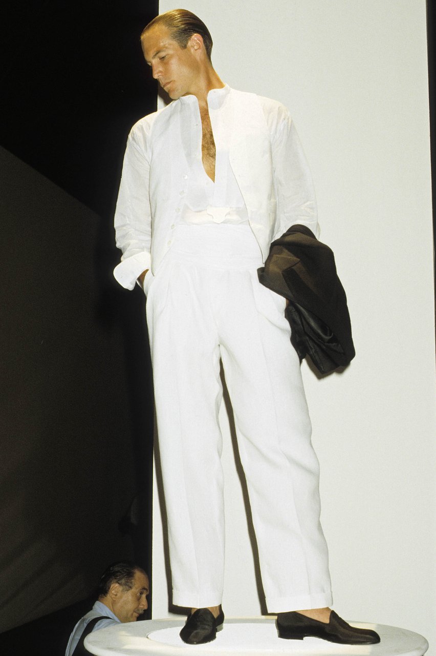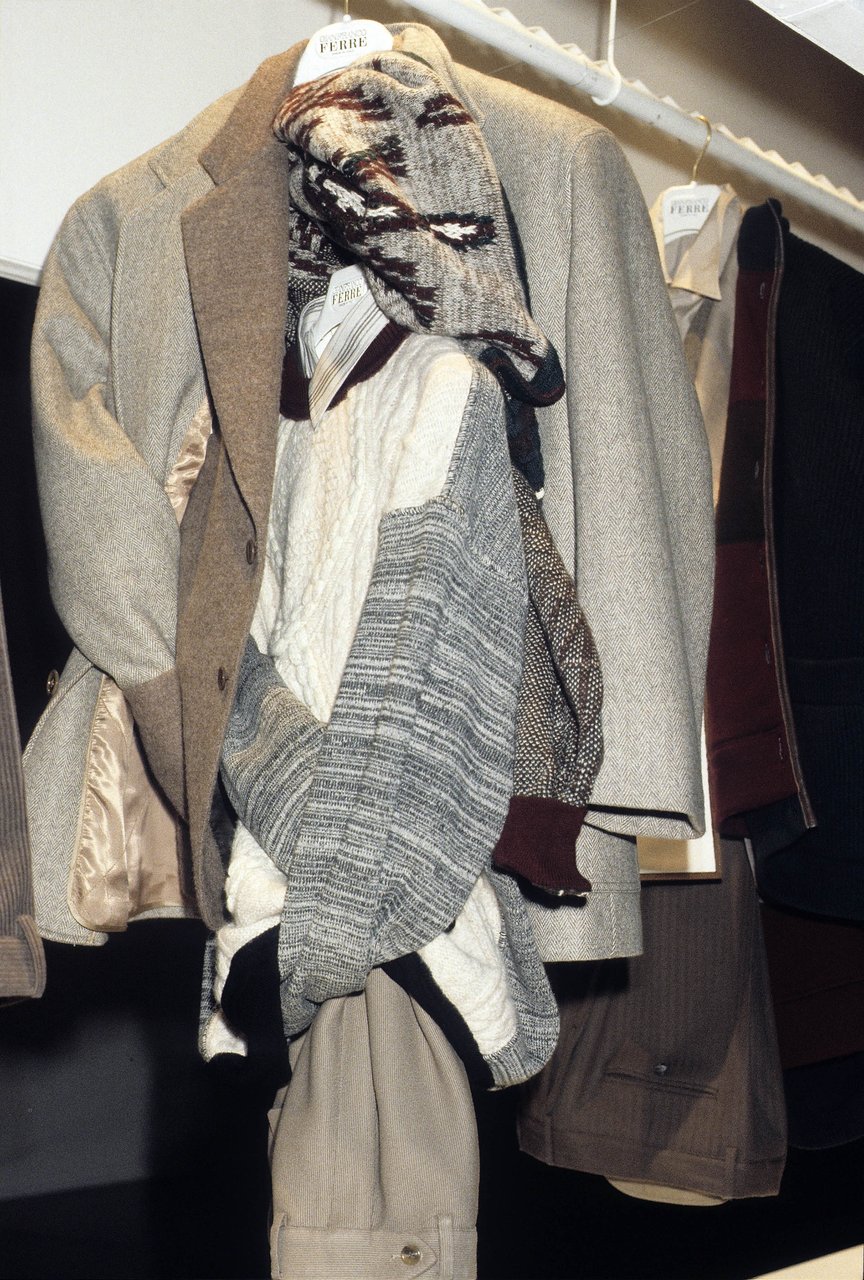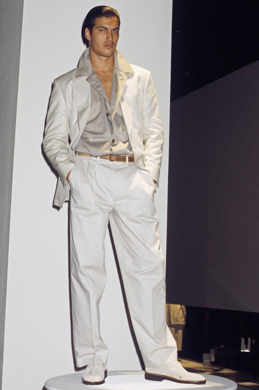 “Una collezione rigorosa, coerente. Una scelta di qualità omogenea. Una collezione ricca, completa, che risponde a tutte le necessità del guardaroba con una serie di proposte flessibili, da leggere come la conferma di quella semplicità, elementarità e ricerca che connota la ‘Ferré Uomo’; da rileggere cercando il filo sotterraneo e unificante di alcune suggestioni: marinaio inizio secolo, coloniale, estate in città anni Trenta. Presenze che non si contraddicono, umori che si riconoscono anche se appena accennati perché appartengono alla tradizione dell’eleganza virile”.