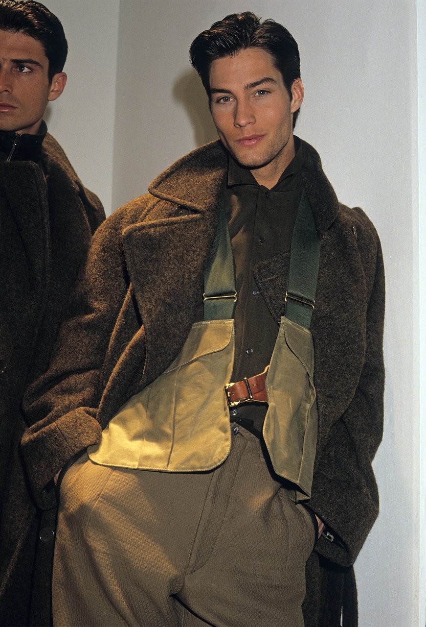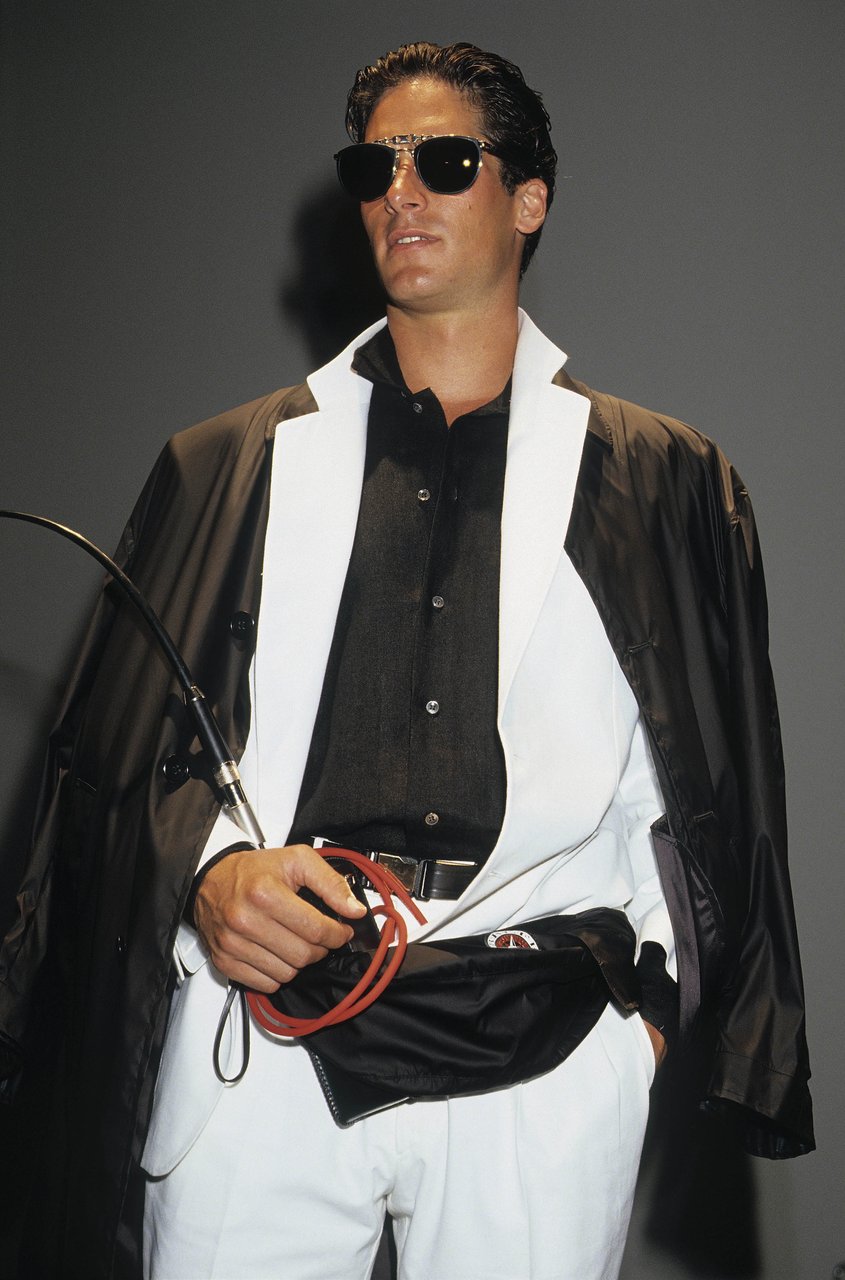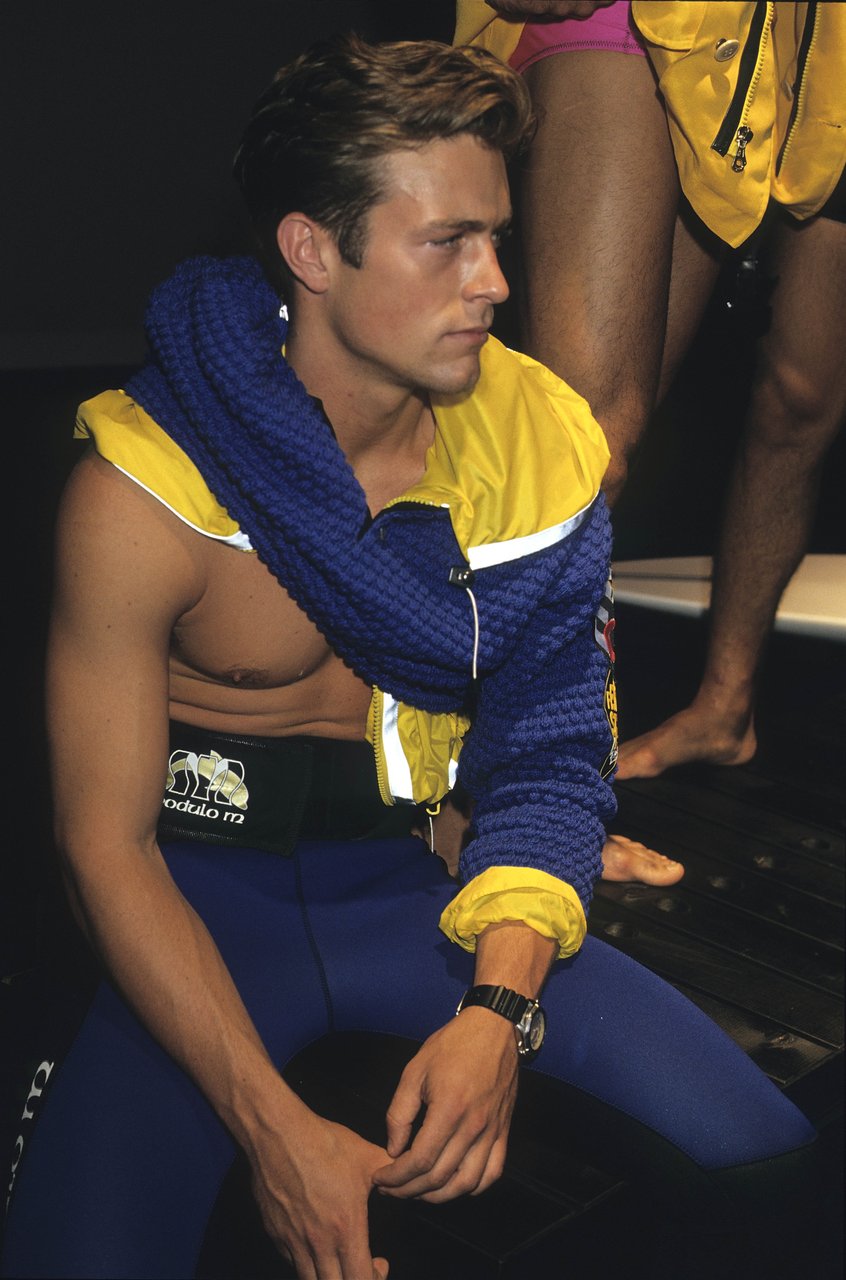 In questa atmosfera la rete di nylon filtra i colori elettrici ispirati alle attrezzature dei sub. La felpa blu da regata si scompone in un marsupio da legare in vita. La camicia a vento ha un cappuccio in popeline di seta che si può ripiegare e nascondere nella tasca. Caban e impermeabili sono trasformati dalla gommatura e dalla “talcatura”, un procedimento simile a quello usato prima di riporre la tuta per le immersioni.