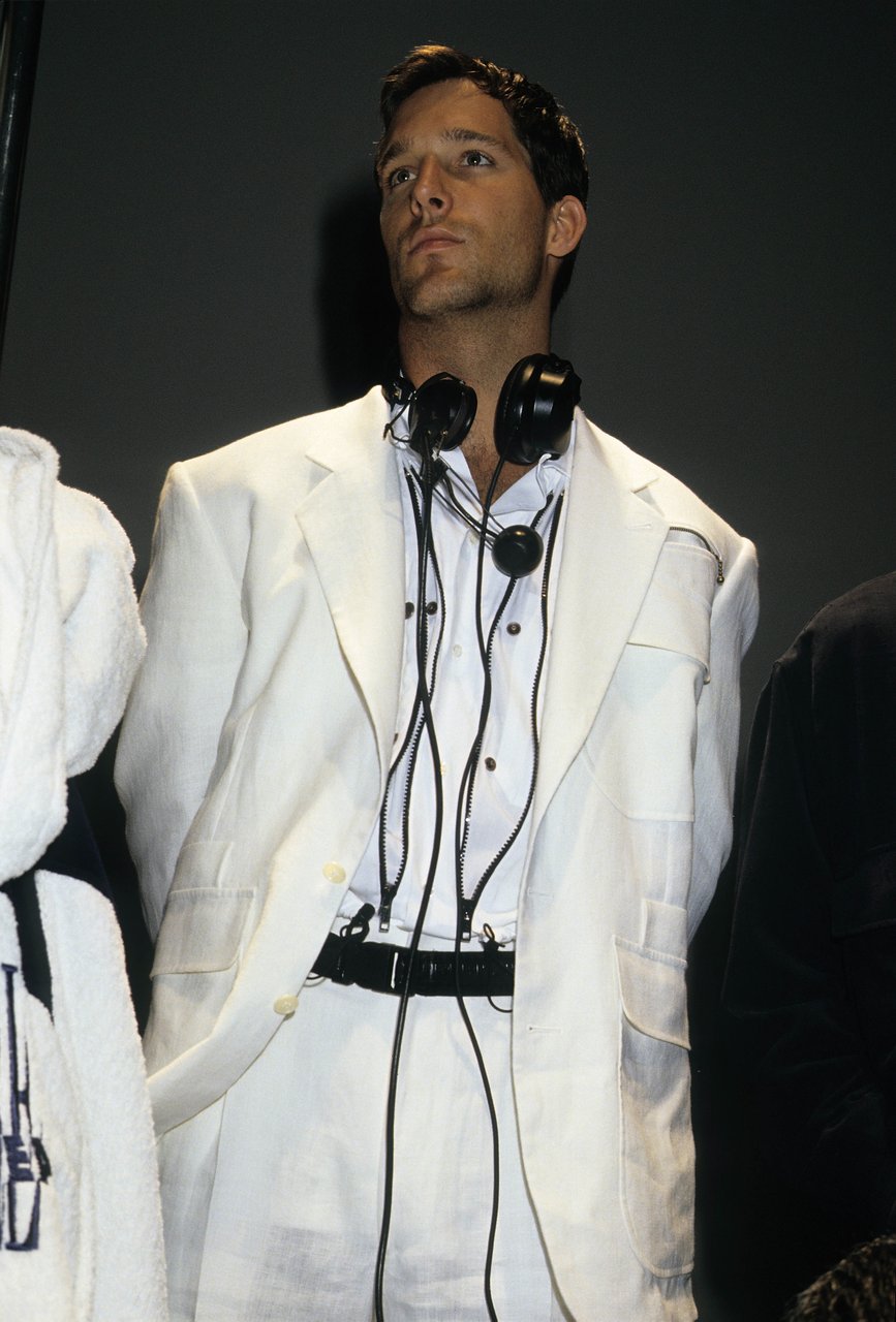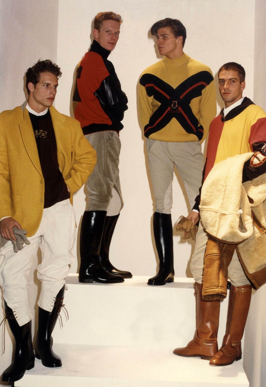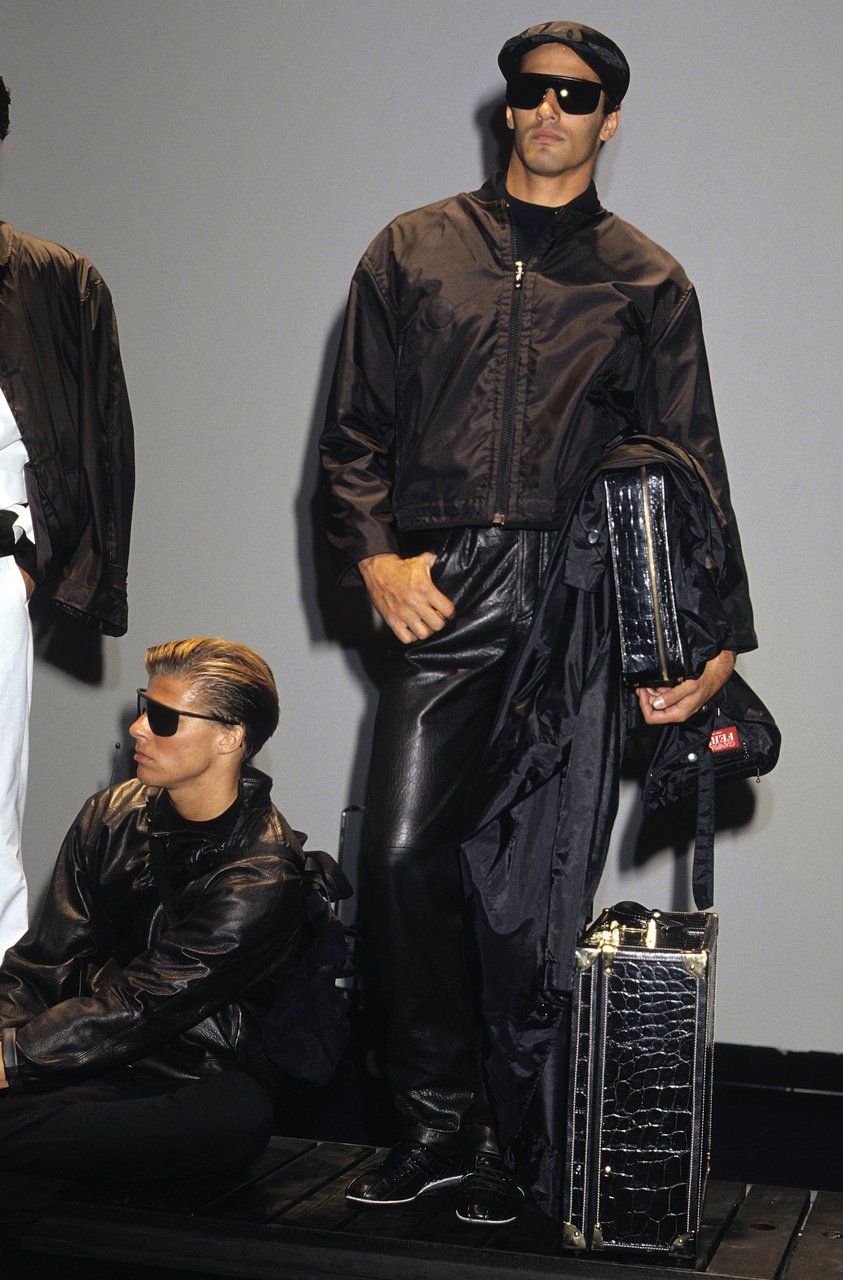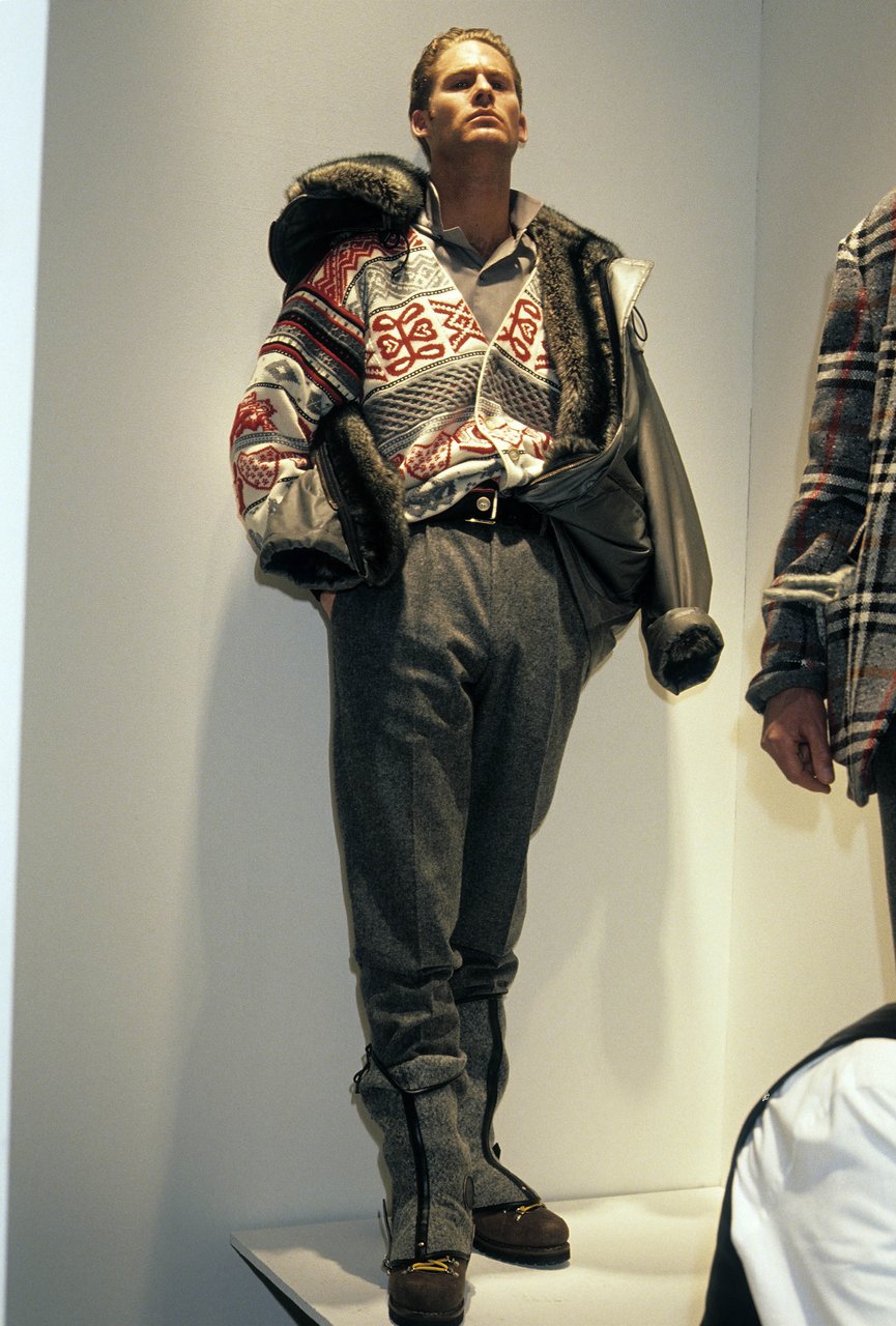 In questa atmosfera la rete di nylon filtra i colori elettrici ispirati alle attrezzature dei sub. La felpa blu da regata si scompone in un marsupio da legare in vita. La camicia a vento ha un cappuccio in popeline di seta che si può ripiegare e nascondere nella tasca. Caban e impermeabili sono trasformati dalla gommatura e dalla “talcatura”, un procedimento simile a quello usato prima di riporre la tuta per le immersioni.